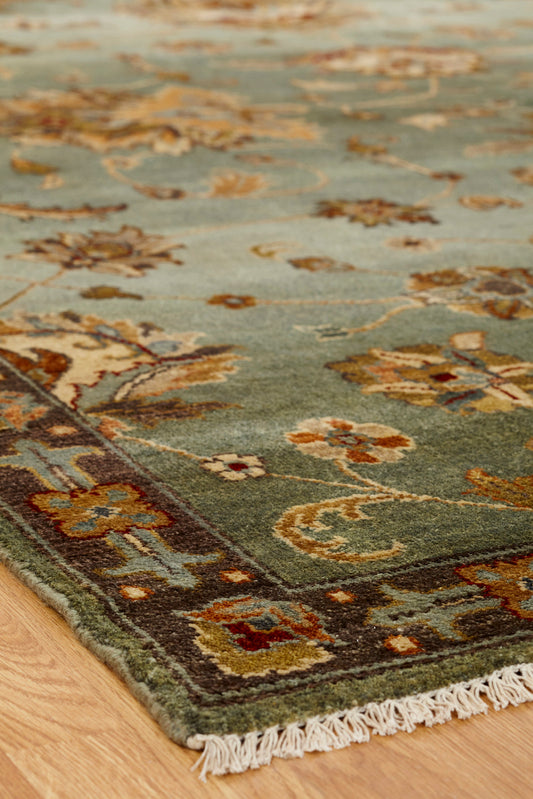 The Mead Collection is a group of Turkish Oushak-inspired rugs featuring narrow borders and patterns that are transitional interpretations of tribal designs. These rugs are hand-knotted from 100% hand-spun wool with unique, hombre background colorations shaded from darker to lighter.