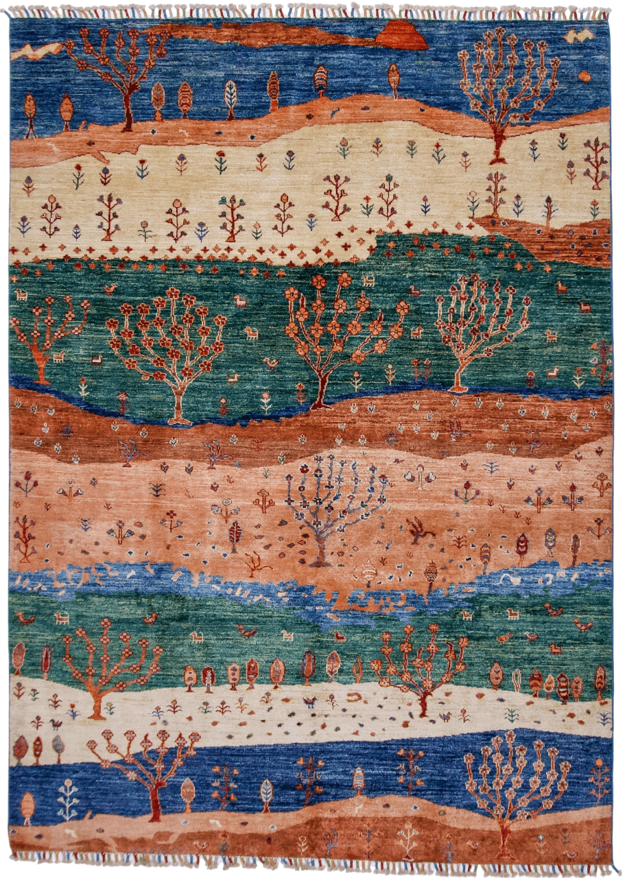 Scenic, landscape design Gabbeh with colorful, tasseled fringe ends