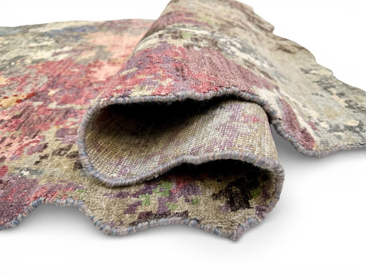 Hand-knotted wool and bamboo viscose blend with high-low texture and scalloped edges. Purple and multicolor tones suit various interiors. Durable, soft, and artfully crafted.