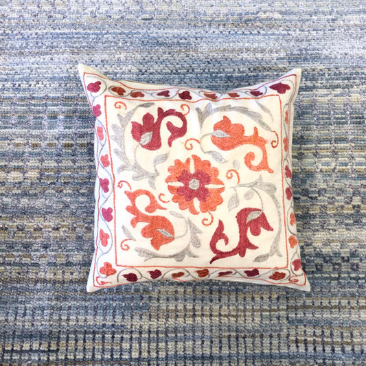Silk-Embroidered Suzani Pillow (14" Square) ivory/pink
