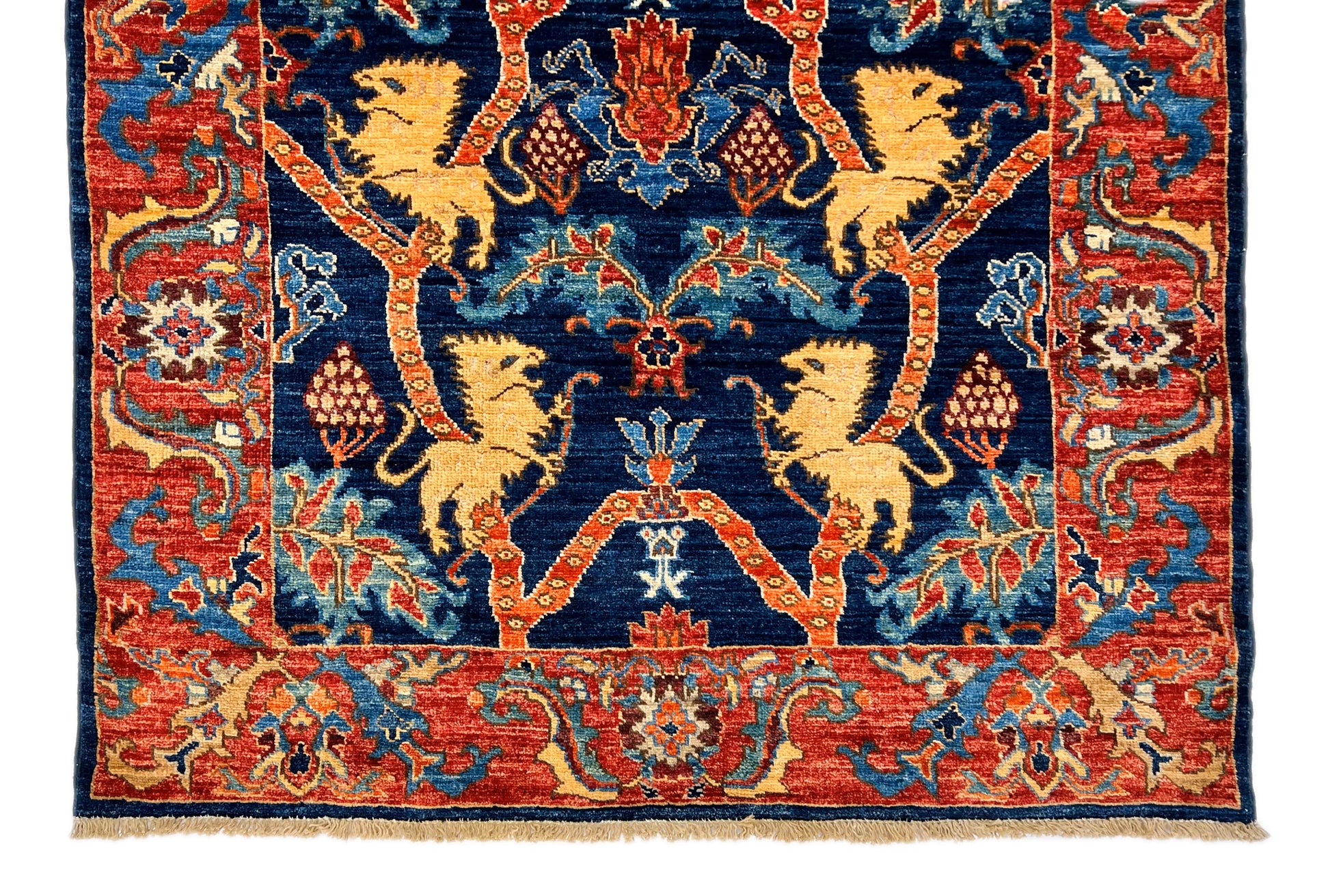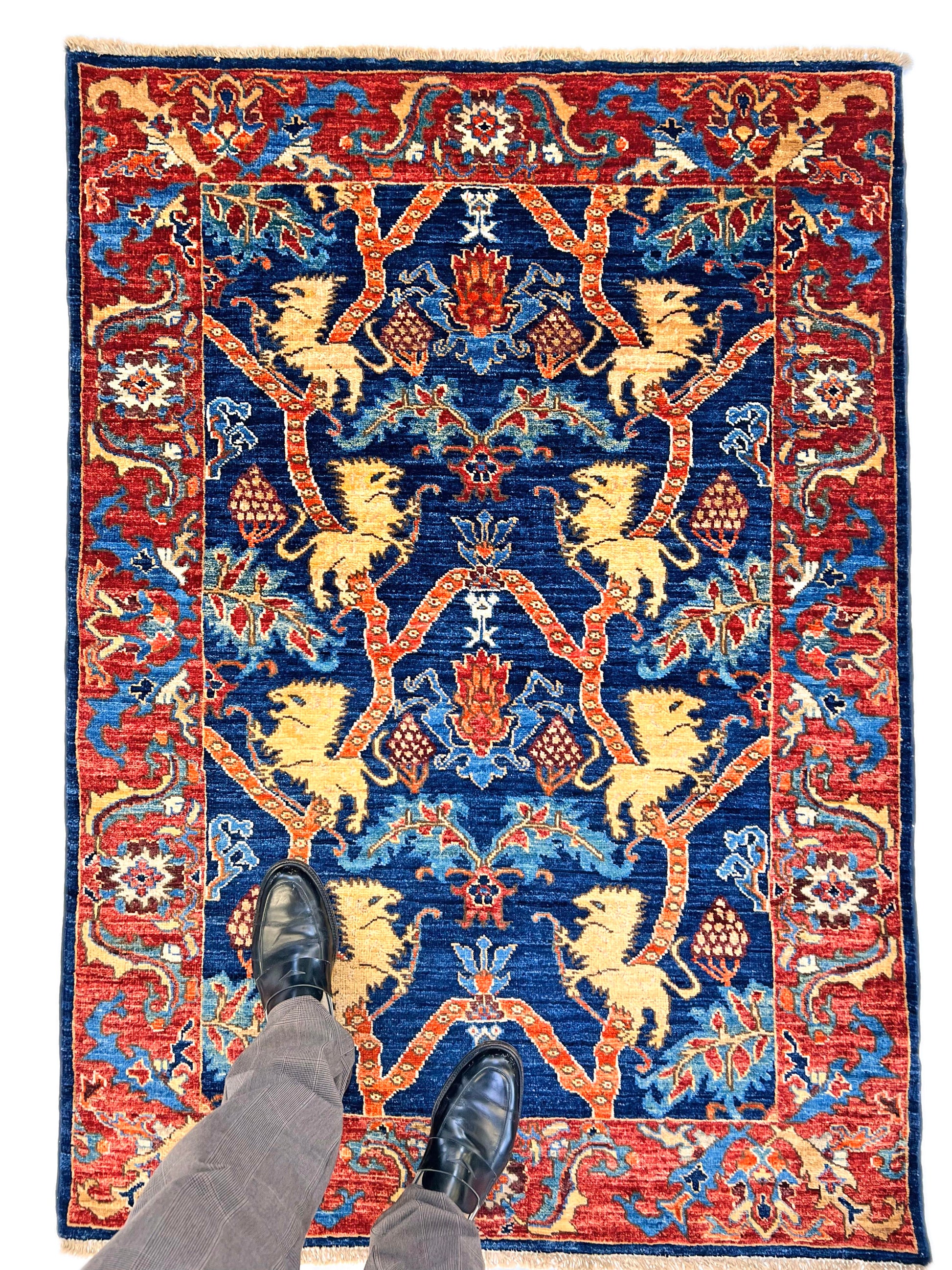 3'06"x4'11" - This exquisite Afghan Folk/Serapi rug features a bold lion design, hand-crafted with hand-spun Ghazni wool. Made by skilled artisans, this 3x5 rug showcases traditional Afghan craftsmanship and adds a touch of cultural richness to any space. Experience luxurious comfort and durability with this unique piece.