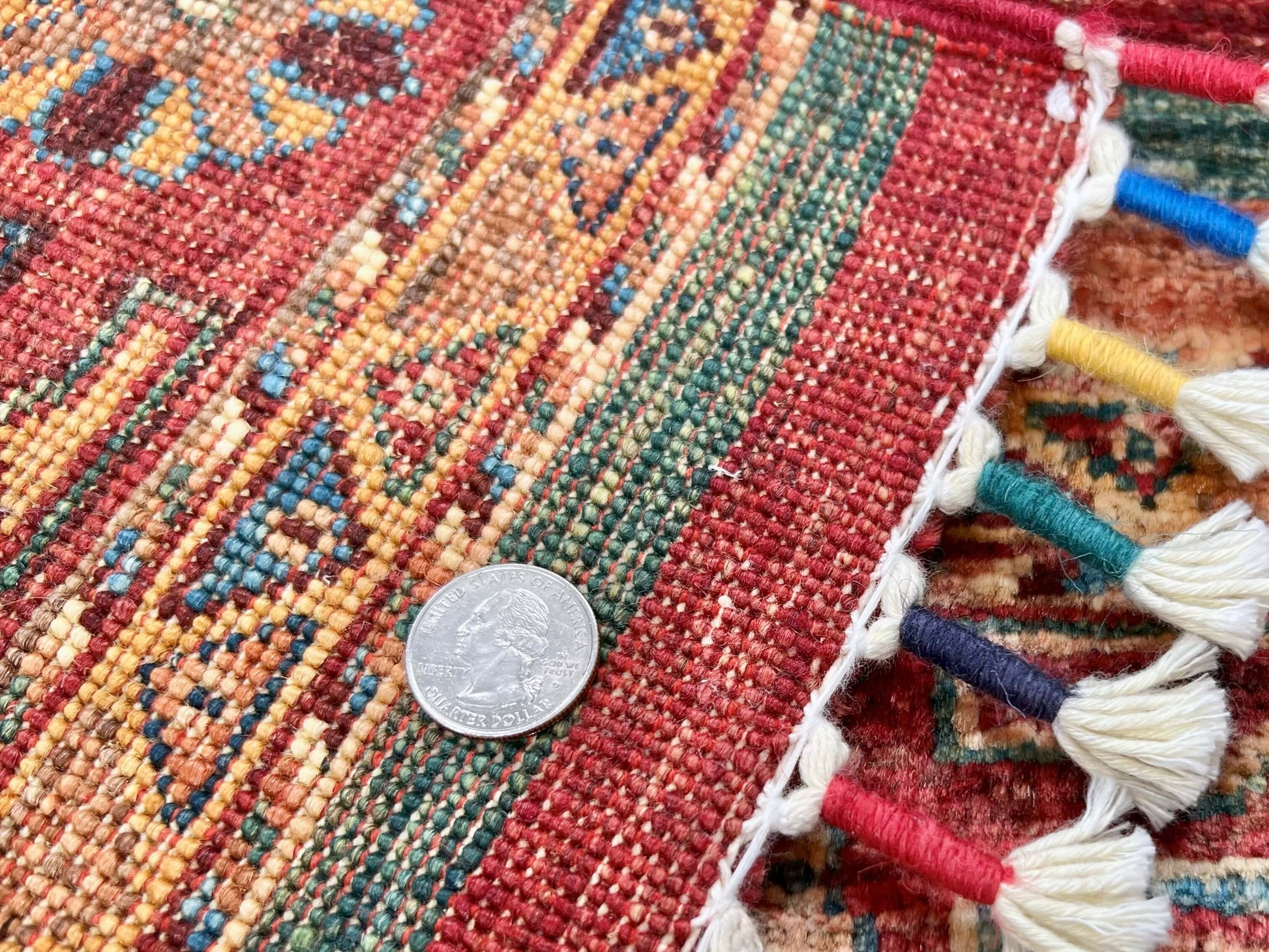 This Afghan Khorjin features a detailed, multicolored horizontal design, hand-knotted using vegetable-dyed Ghazni wool from Afghanistan. Measuring at 2'09"x4'02", it offers a unique and vibrant addition to any space. Crafted with high-quality materials, it adds both style and durability to your home.