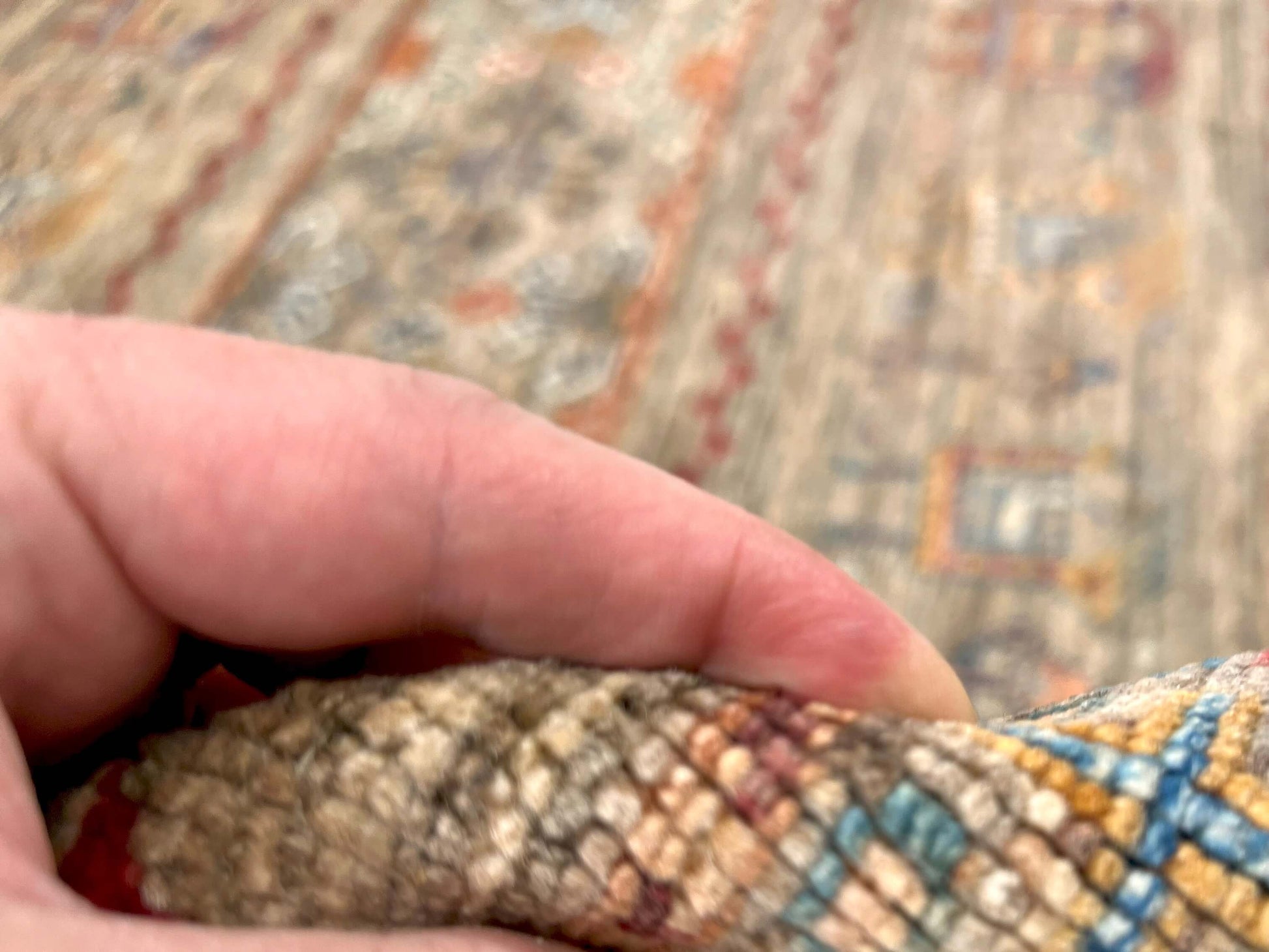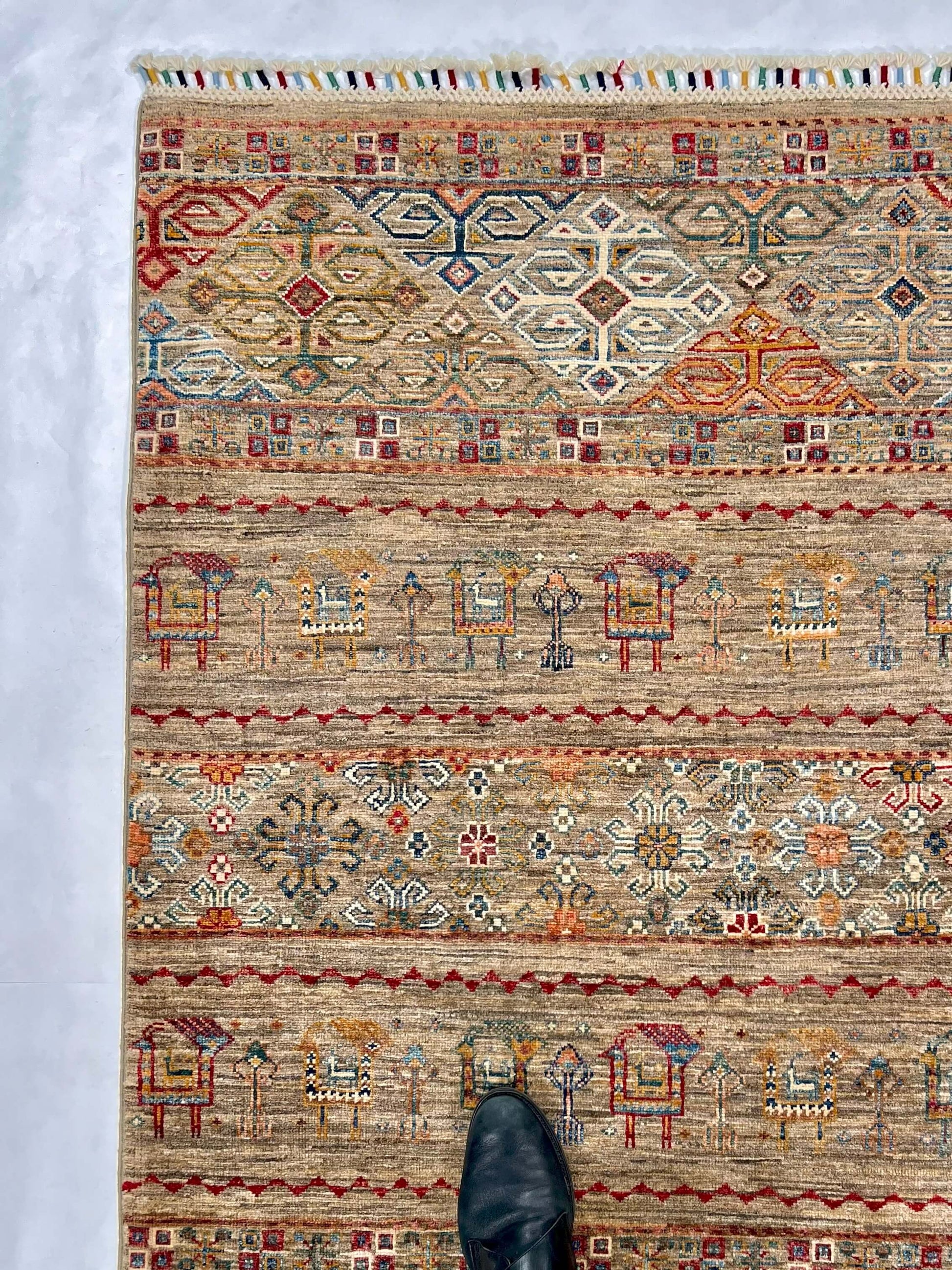 This Afghan Khorjin 3x5 rug features natural undyed and vegetable dyed Ghazni wool, resulting in a vibrant and durable tribal design. Experience the beauty of authentic hand-knotted craftsmanship in your home.