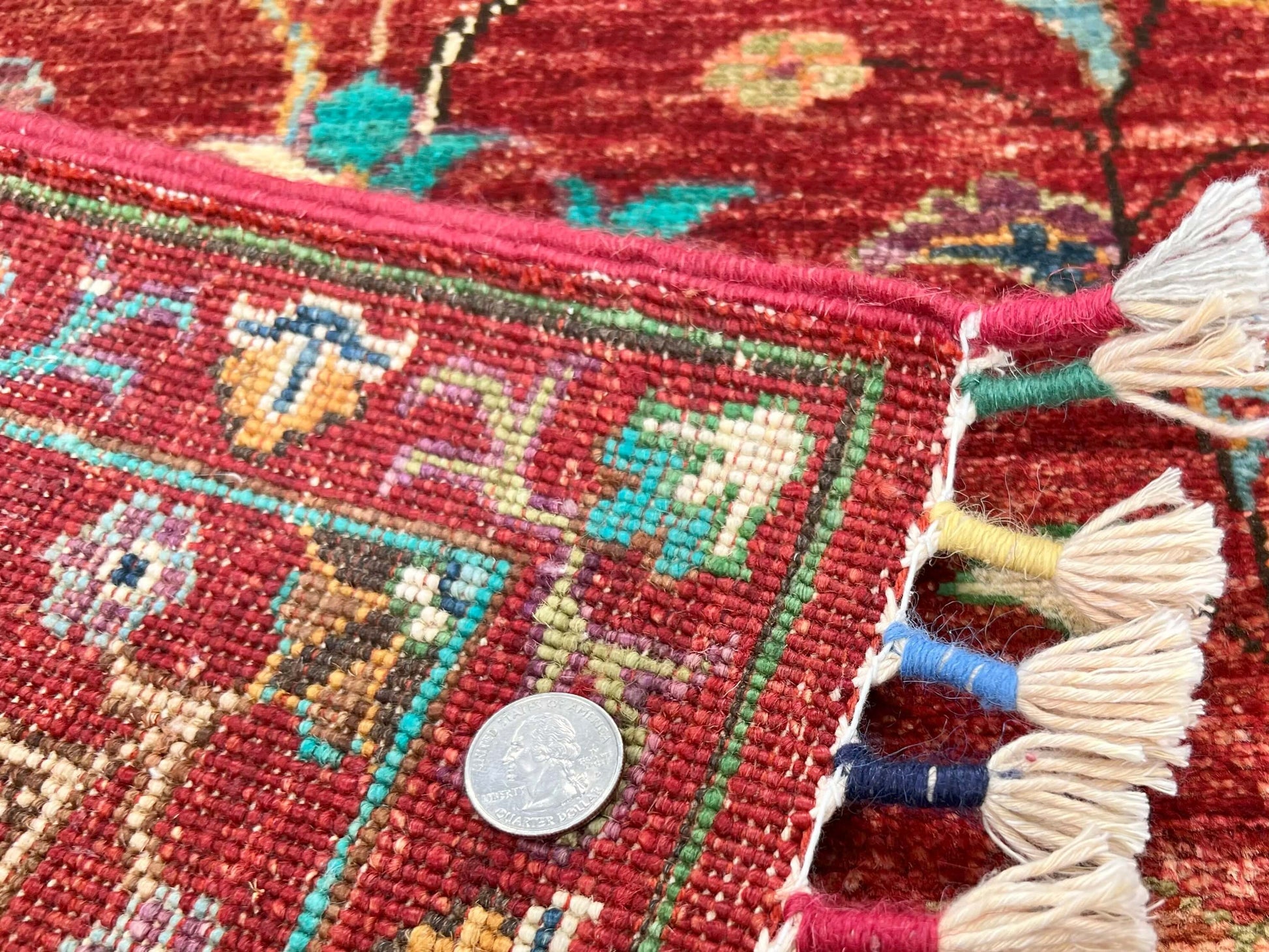 Experience the rich colors and traditional craftmanship of the Afghan Aryana rug. Made from vegetable dyed Ghazni wool, each rug is hand knotted in Afghanistan, ensuring quality and durability. The jewel tones of red and pops of turquoise add an elegant touch to any room.