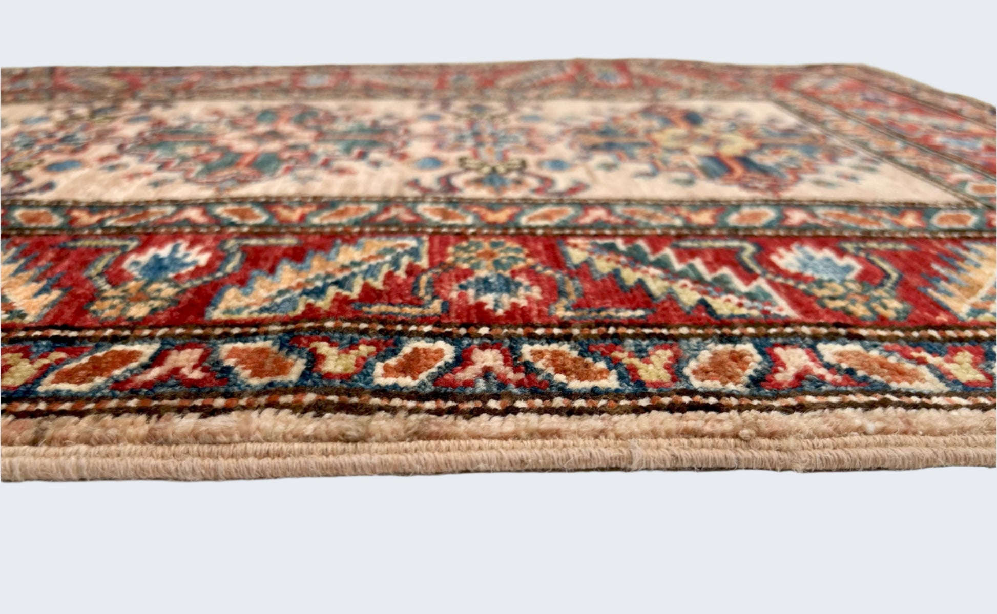 Expertly crafted in Afghanistan, the Super Kazak rug features a stunning Caucasian design. Made with vegetable dyed Ghazni wool, this rug is both durable and eco-friendly. Elevate any space with its adobe and red color palette.