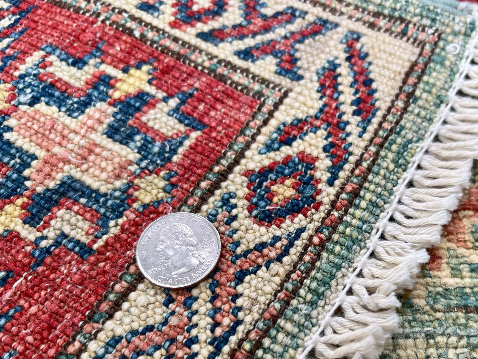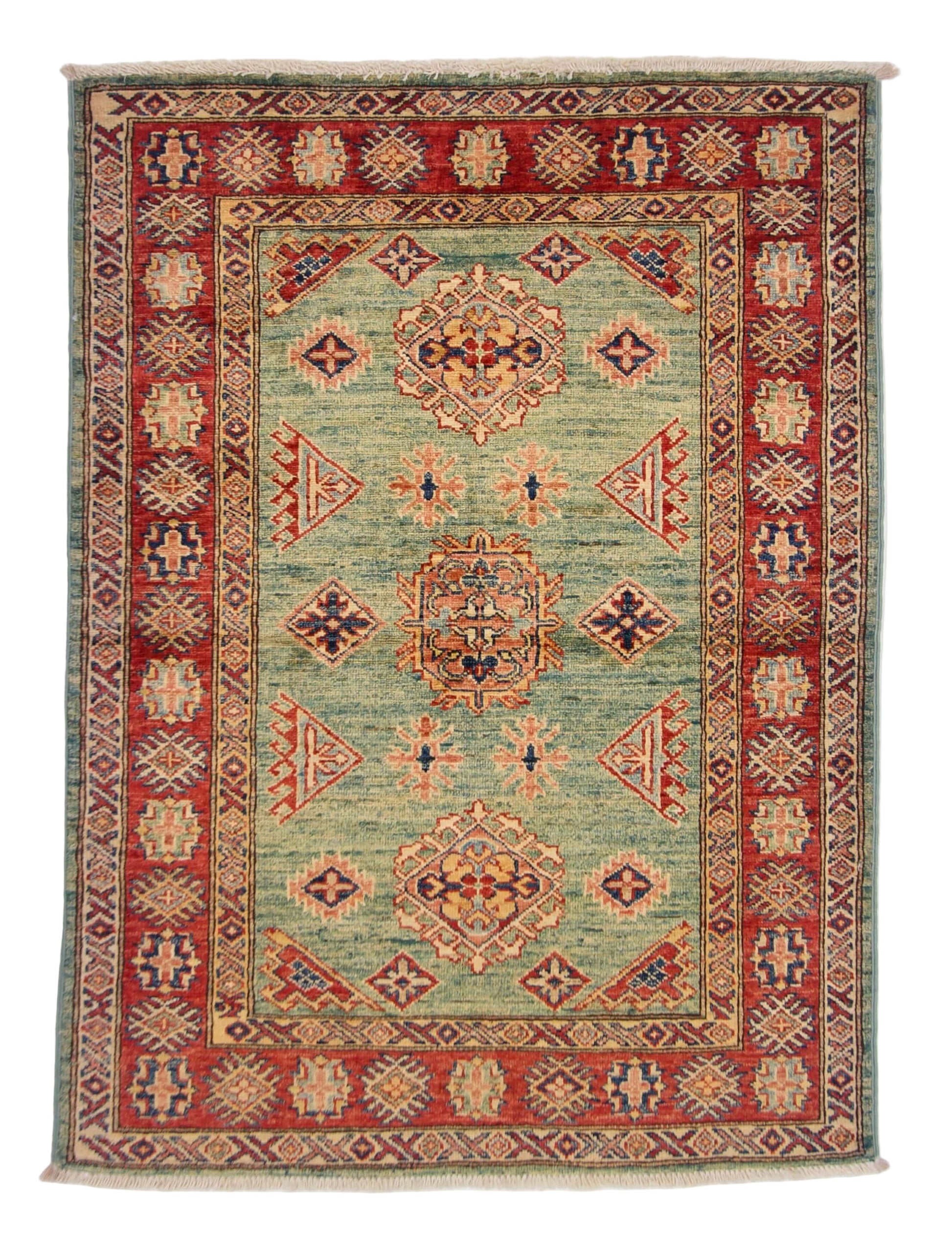 The Super Kazak is a top-quality rug that measures 3'00" x 4'00". It is made with vegetable-dyed Ghazni wool and hand-knotted in Afghanistan, featuring a beautiful Caucasian design. Crafted with precision and using premium materials, this rug adds warmth and elegance to any room.
