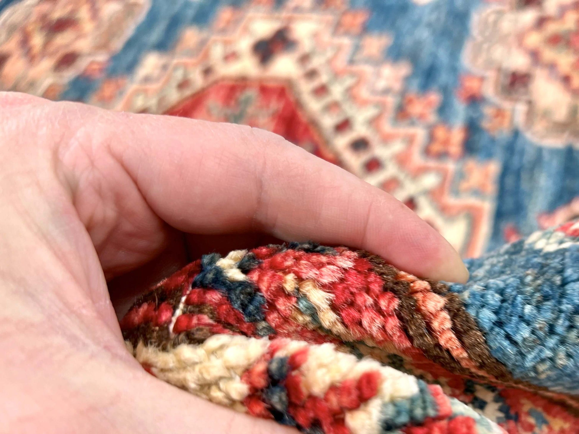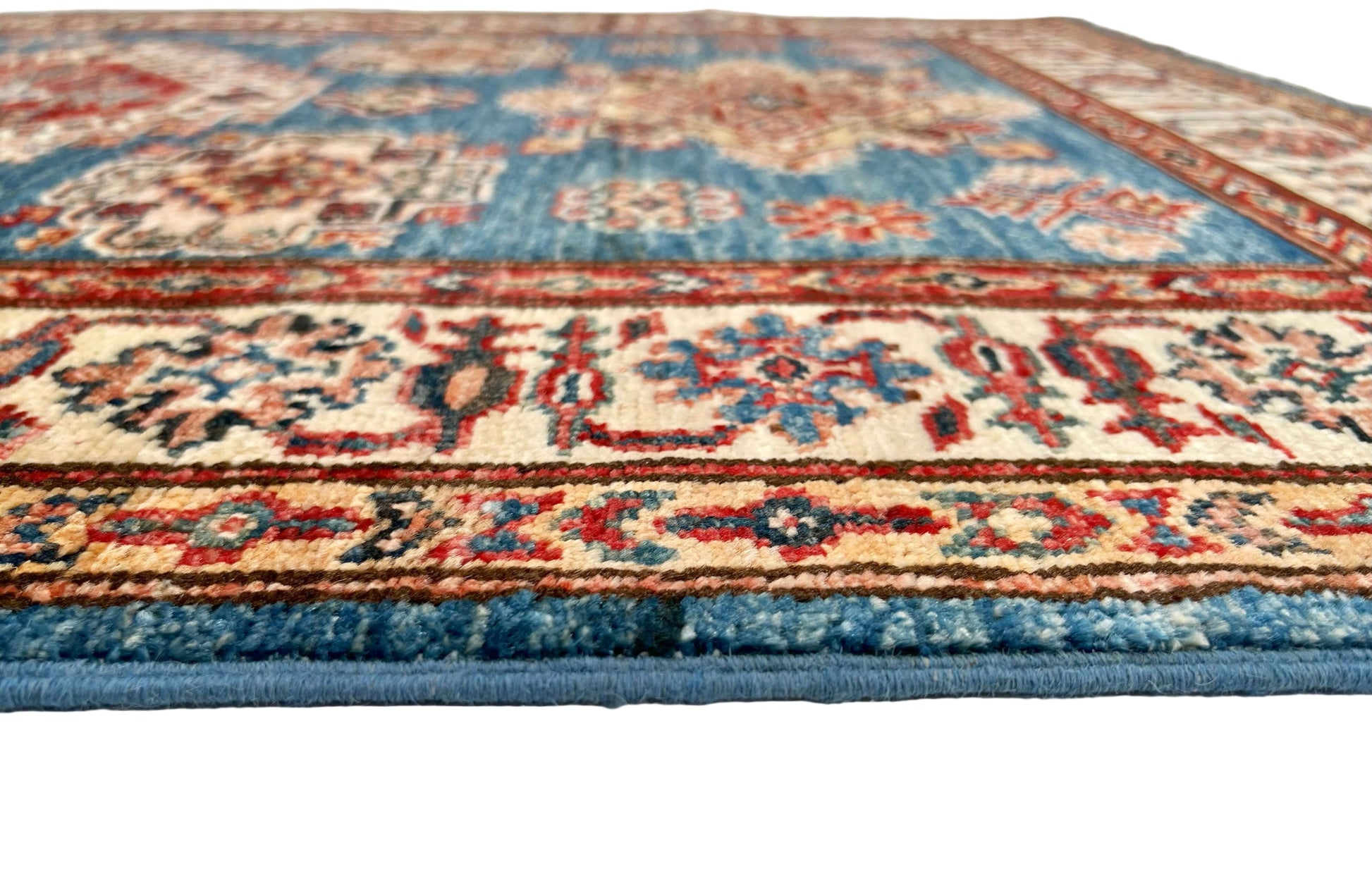 Experience the luxurious quality of this Super Kazak rug, hand-knotted with natural vegetable-dyed Ghazni wool in Afghanistan. This stunning 3x5 rug features a unique regional (Russian) Caucasus design in denim blue and ivory. Elevate any space with its traditional craftsmanship and timeless elegance.