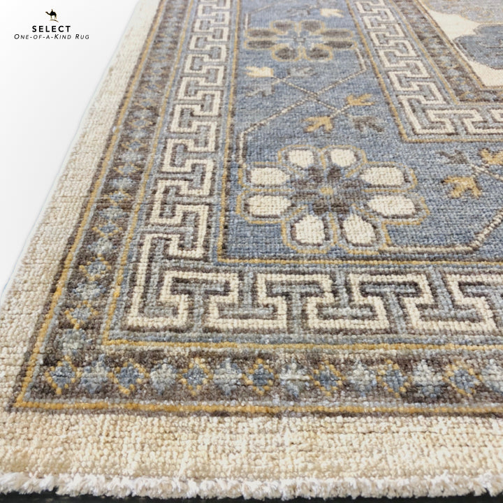 This hand-knotted Khotan showcases the timeless elegance of Oriental design with its ivory and gray palette. Crafted from hand-spun, vegetable-dyed wool by skilled Afghan artisans, each knot reflects generations of weaving tradition. The white-washed finish and antique-wash treatment create subtle depth and character, lending an heirloom quality that complements both traditional and contemporary interiors. At 8'11"x11'10", this substantial piece anchors any room with authentic craftsmanship and enduring beauty.