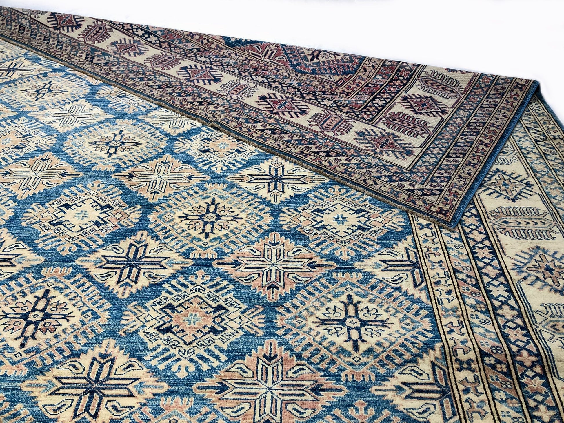 This Stunning Super Kazak showcases a lustrous antique wash that imparts an aged patina, subtly muting the traditional reds while delivering a contemporary interpretation of the classic Kazak aesthetic. Meticulously hand-knotted from hand-spun, vegetable-dyed Ghazni wool sourced in Afghanistan, each piece reflects generations of weaving expertise. The rug is finished and exported from Pakistan, ensuring exceptional quality and craftsmanship. The sophisticated blue and ivory palette complements modern and traditional interiors alike, while the generous 10x14 dimensions anchor expansive living spaces with understated elegance and authentic character.