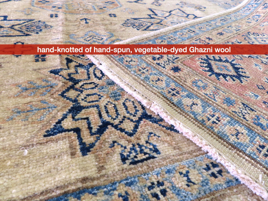 Hand-knotted of hand-spun, vegetable-dyed Ghazni wool in Afghanistan – antique-washed for patina in Pakistan