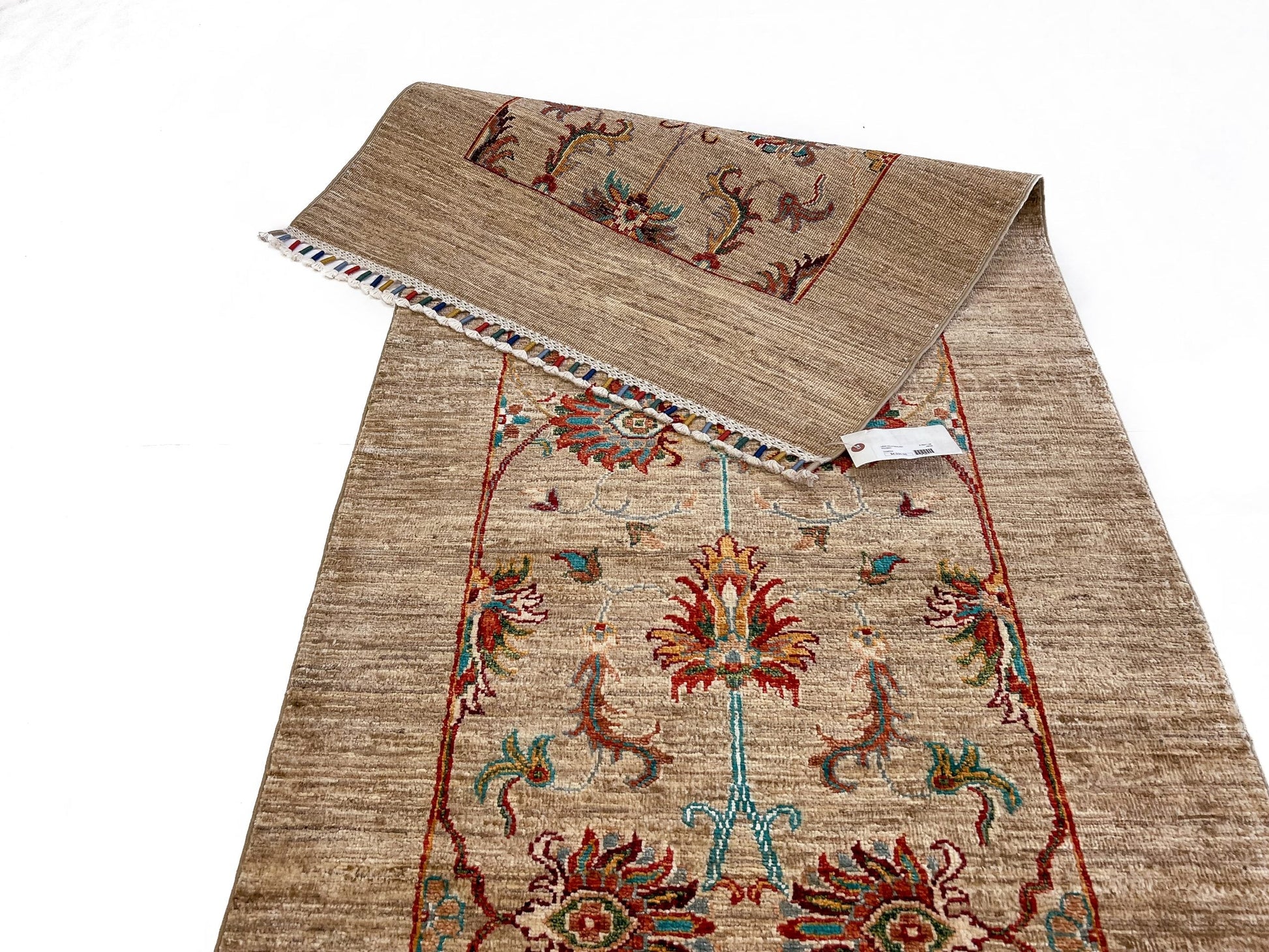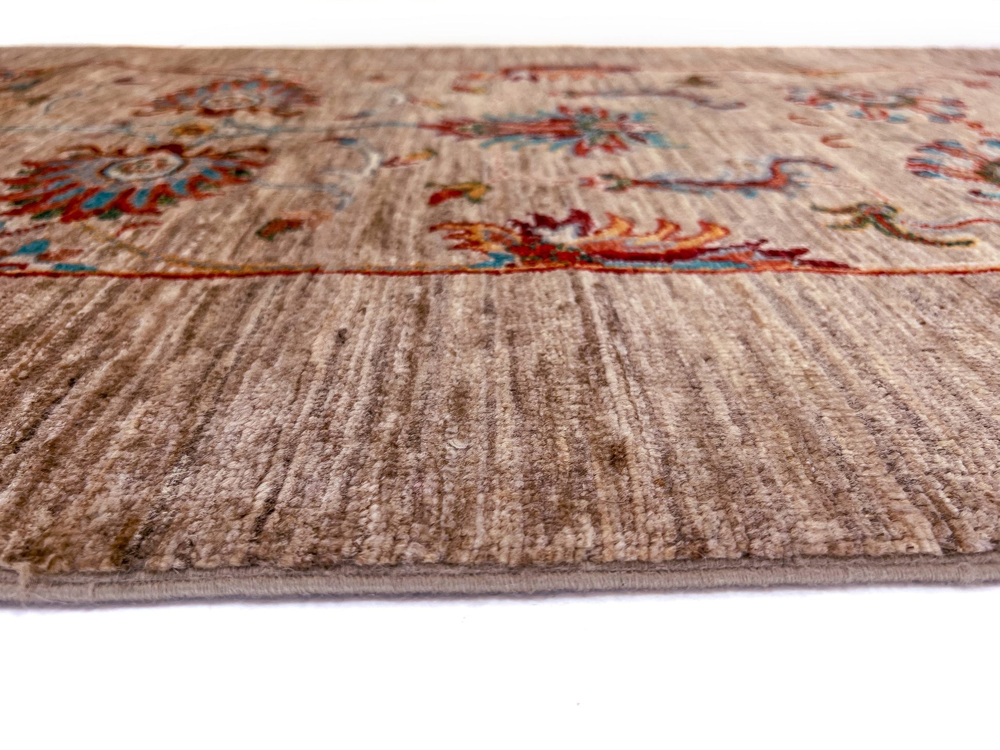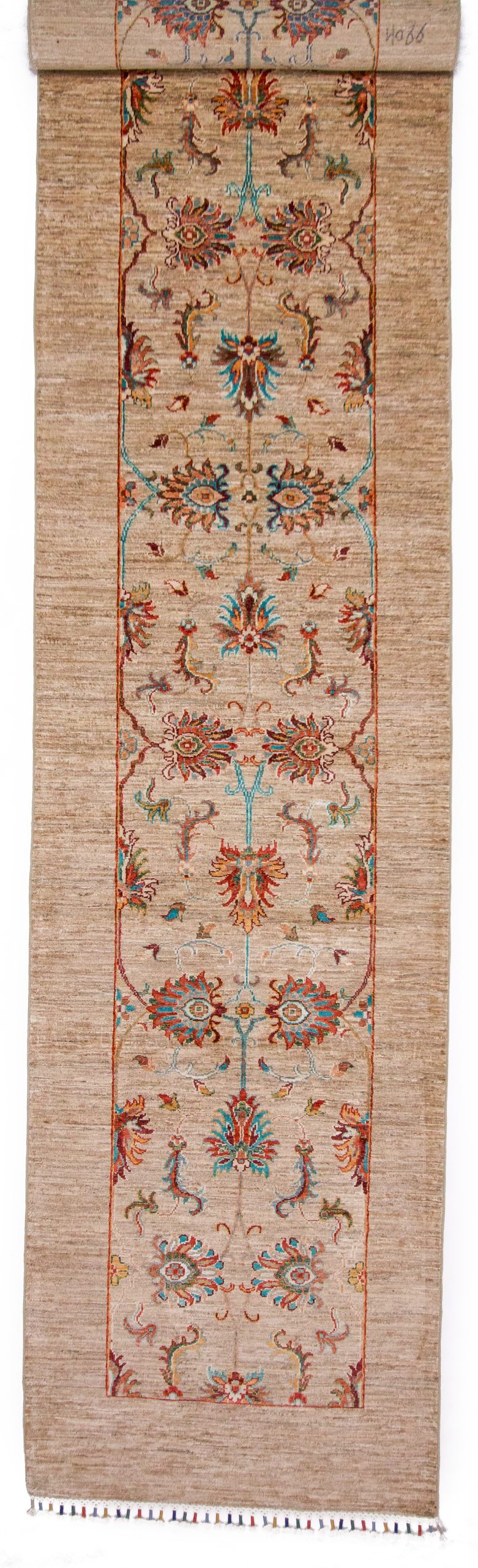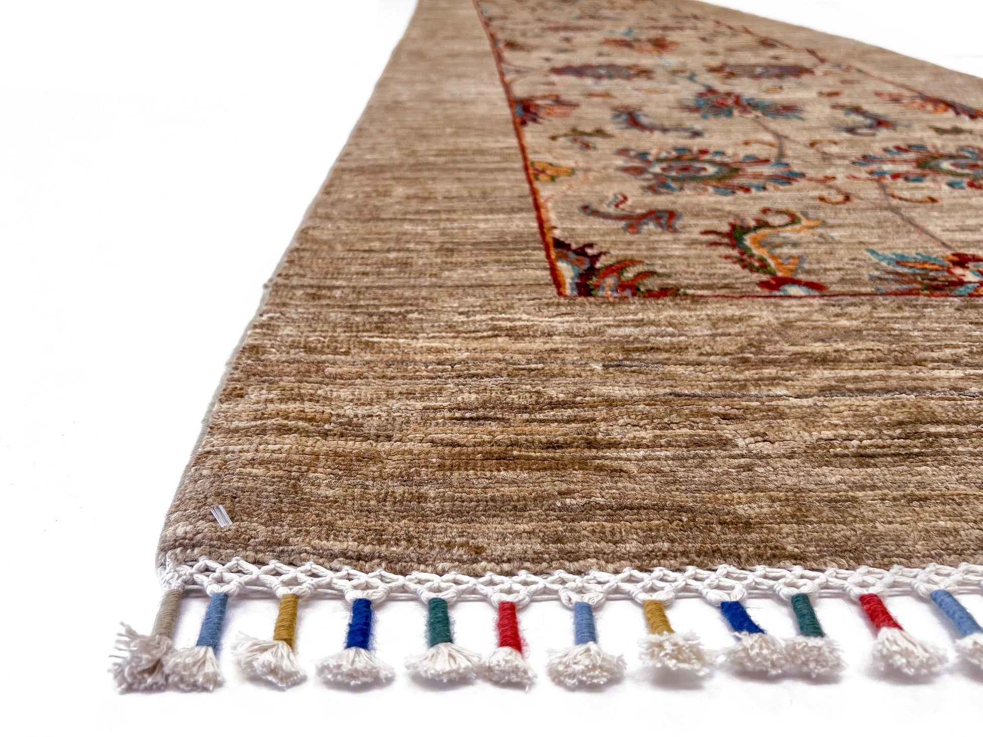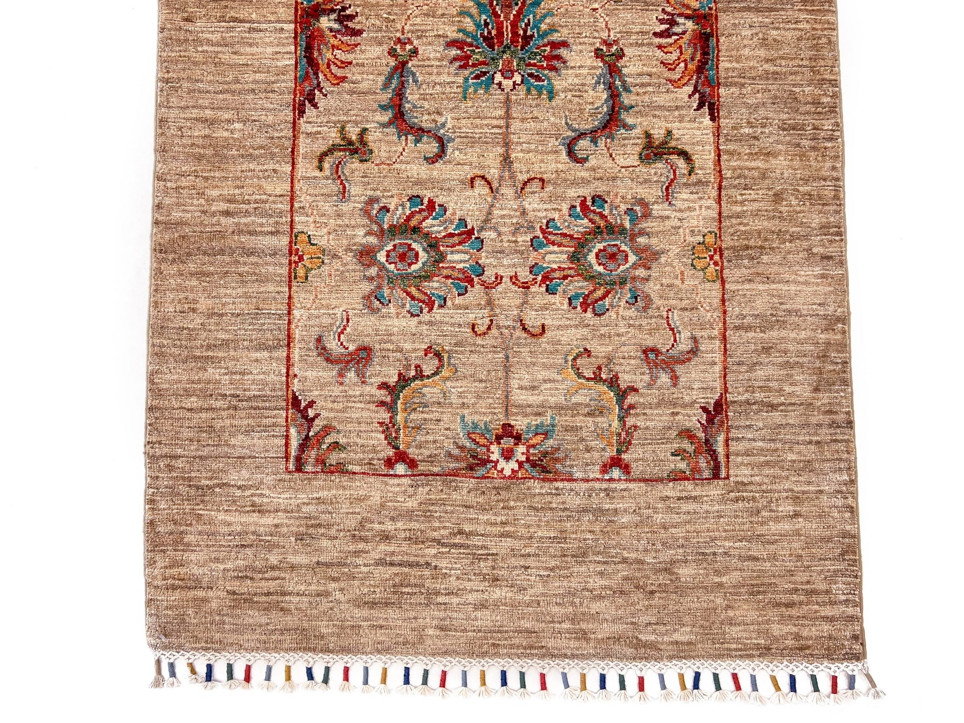 Aryana design with blank border and tasseled fringe ends; hand-knotted of hand-spun, vegetable-dyed Ghazni wool; Afghan-made; exported from Pakistan