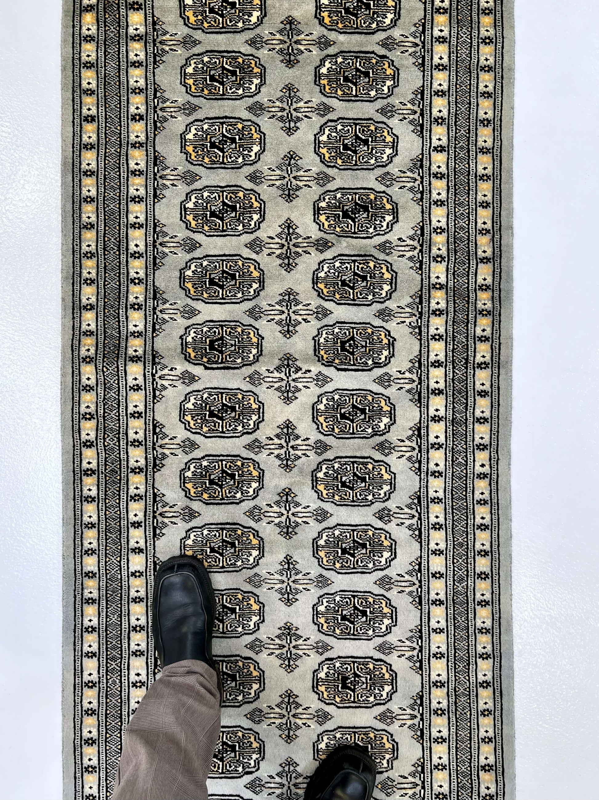 Expertly hand-knotted in Pakistan, the Bokhara gray rug boasts a classic and timeless design, updated with a modern twist in color. This 10' runner showcases a traditional Bokhara design, perfect for adding an elegant touch to any space.