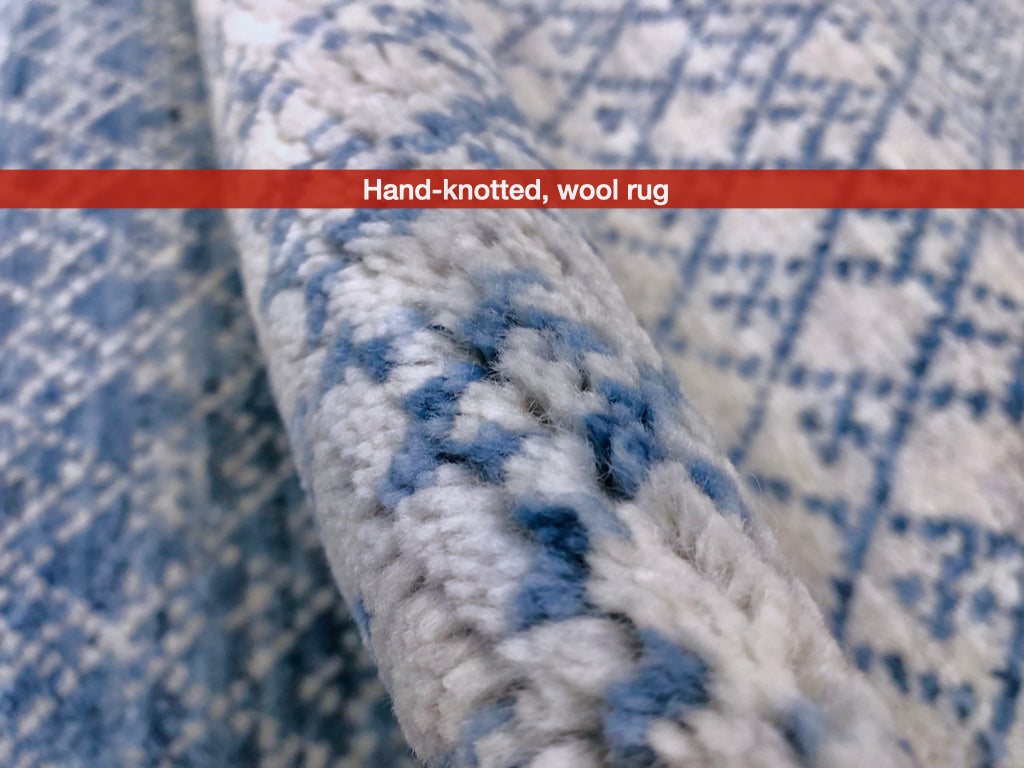 This hand-knotted wool rug features the Durva grass design, a transitional pattern that bridges traditional and contemporary aesthetics. Meticulously crafted in India, the piece showcases organic grass motifs in a sophisticated light blue palette. The wool construction provides durability and a luxurious feel underfoot, while the transitional style complements both classic and modern interiors. At 8x10, this substantial size anchors living spaces with understated elegance and timeless appeal.