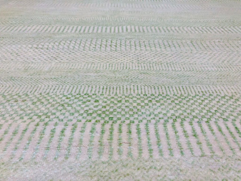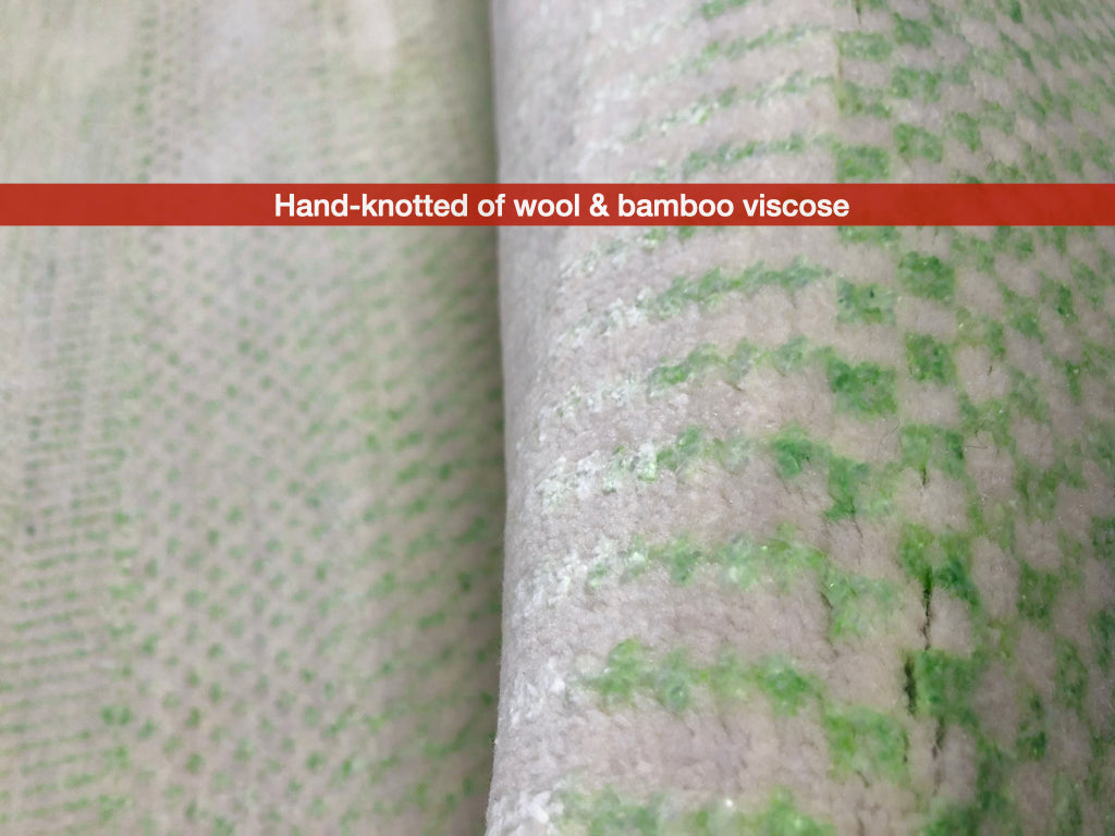 This hand-knotted rug features the sacred Durva grass motif, a meaningful design rooted in Indian textile tradition. Crafted in India from a refined blend of wool and bamboo viscose, the piece combines natural fibers to achieve a subtle sheen and exceptional durability. The ivory and light green palette creates a serene, versatile foundation that complements both contemporary and traditional interiors. The generous 8x10 dimensions make it ideal for anchoring living spaces or defining bedroom areas. Each knot reflects artisanal expertise, ensuring a rug that ages beautifully while maintaining its structural integrity for years to come.