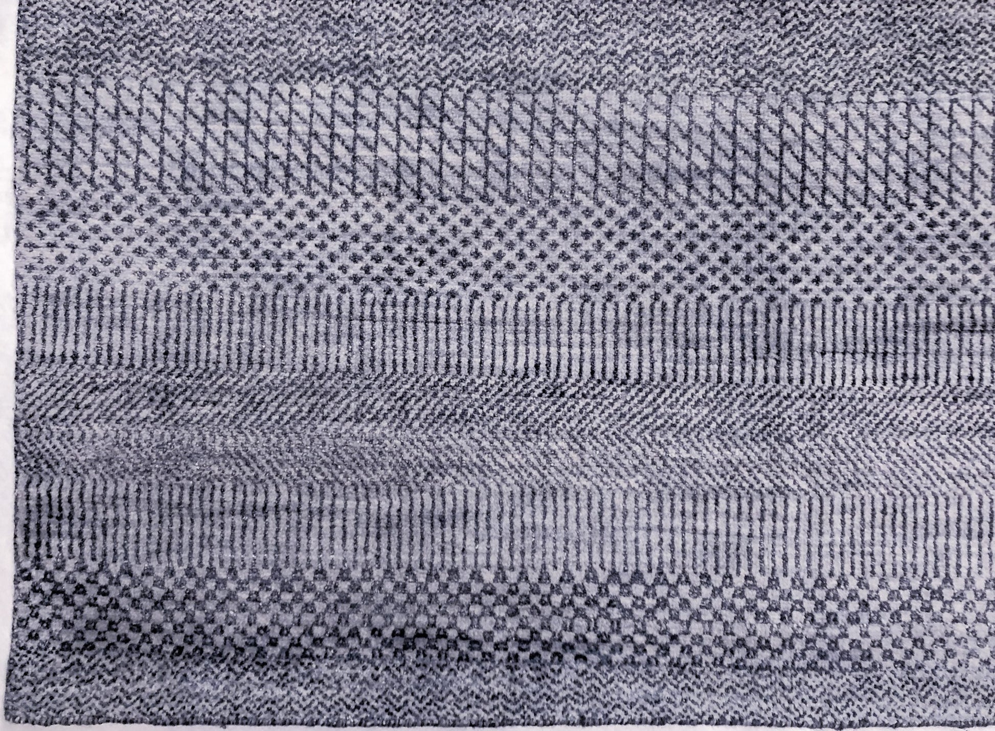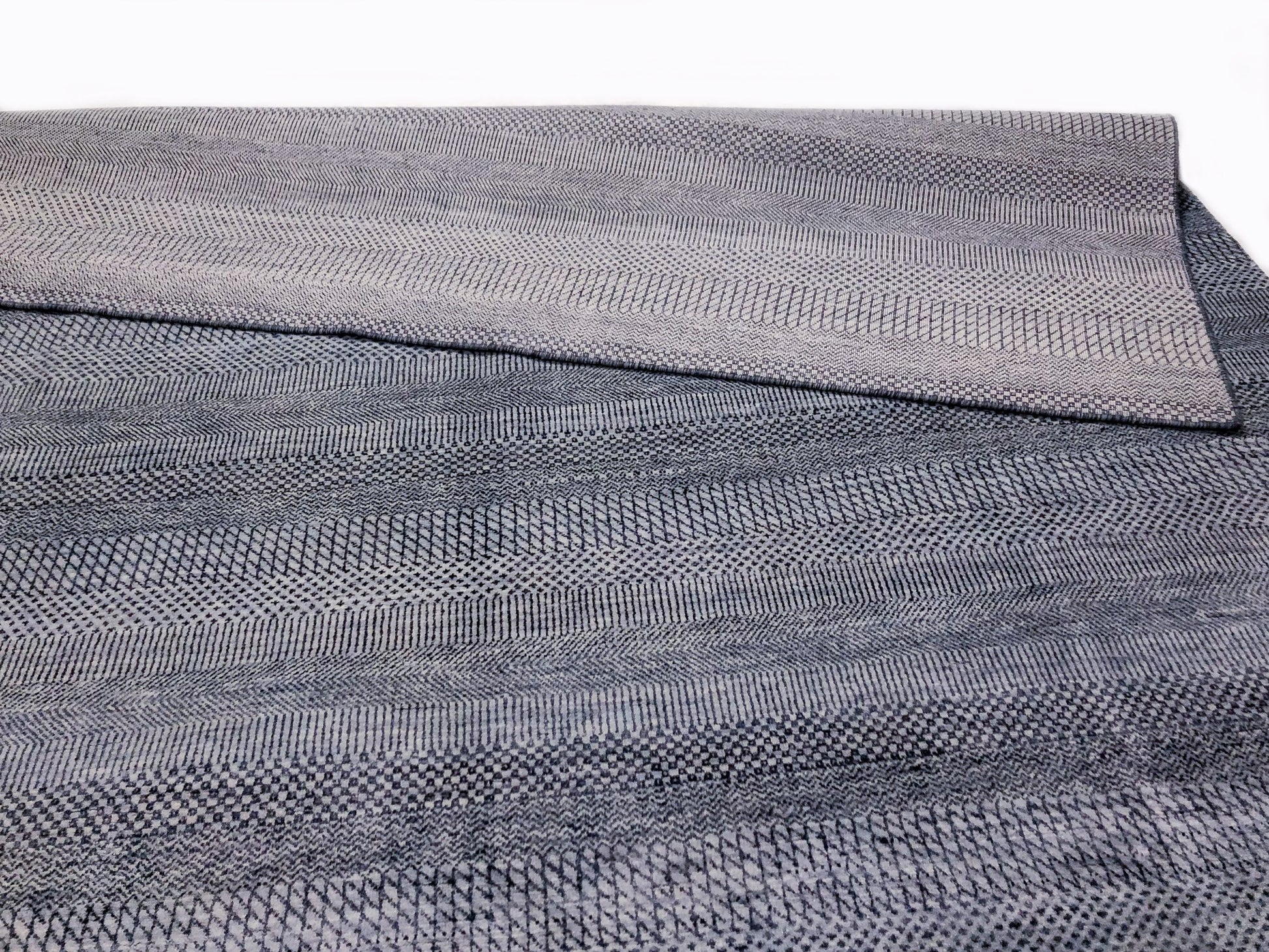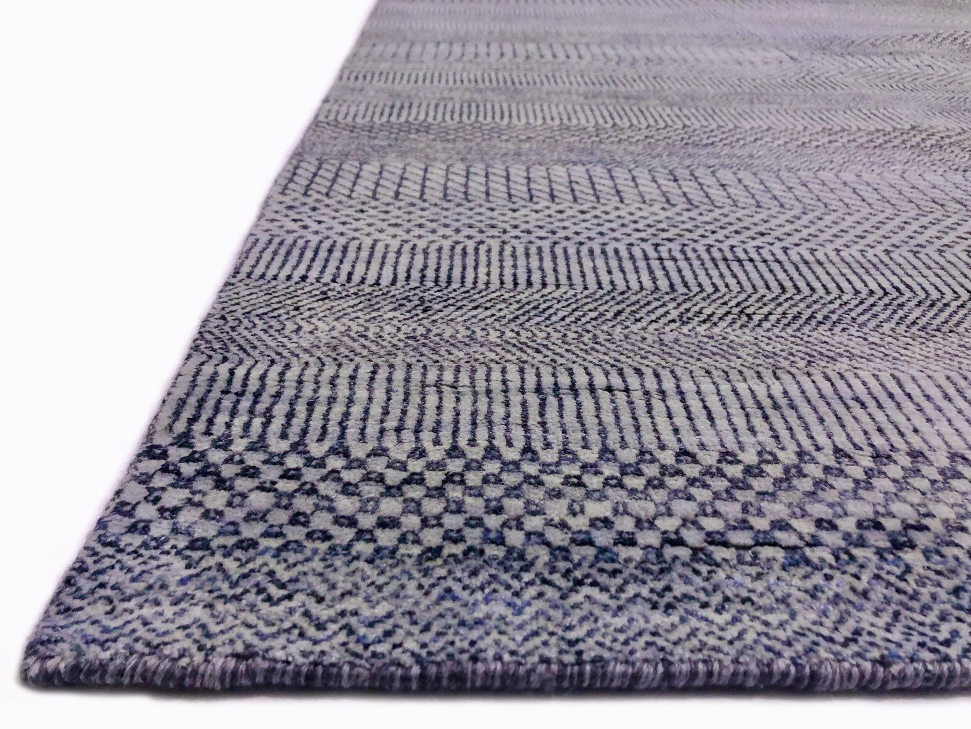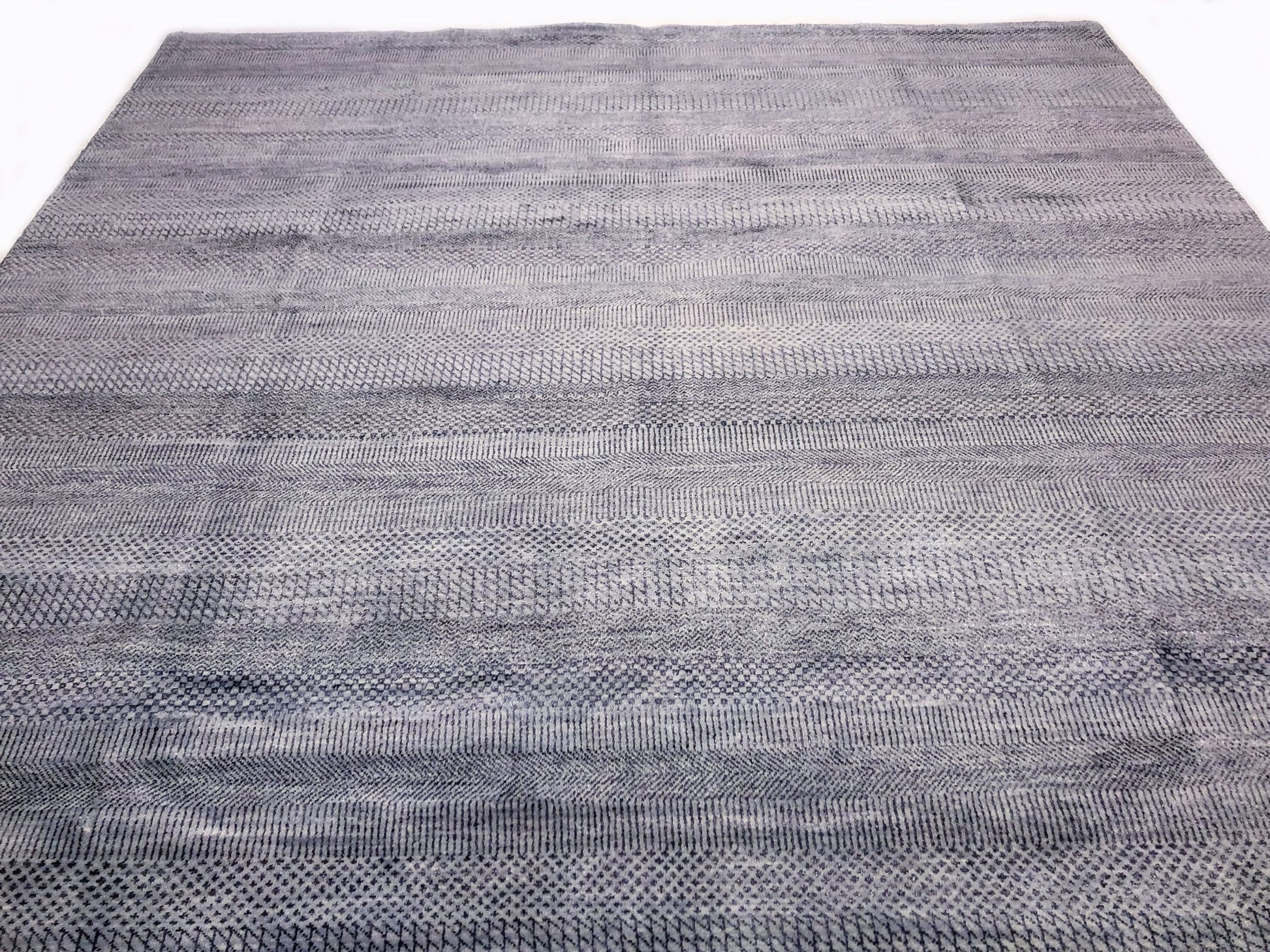 This hand-knotted rug features the sacred Durva grass motif, a meaningful design rooted in spiritual tradition. Crafted in India using premium wool blended with bamboo viscose, the combination creates a luxuriously soft pile with natural sheen and exceptional durability. The sophisticated blue and gray palette offers versatile elegance that complements both contemporary and traditional interiors. The generous 8x10 dimensions make it ideal for anchoring living spaces or defining bedroom areas. Each knot is tied by skilled artisans, ensuring authentic craftsmanship and a rug built to last generations.