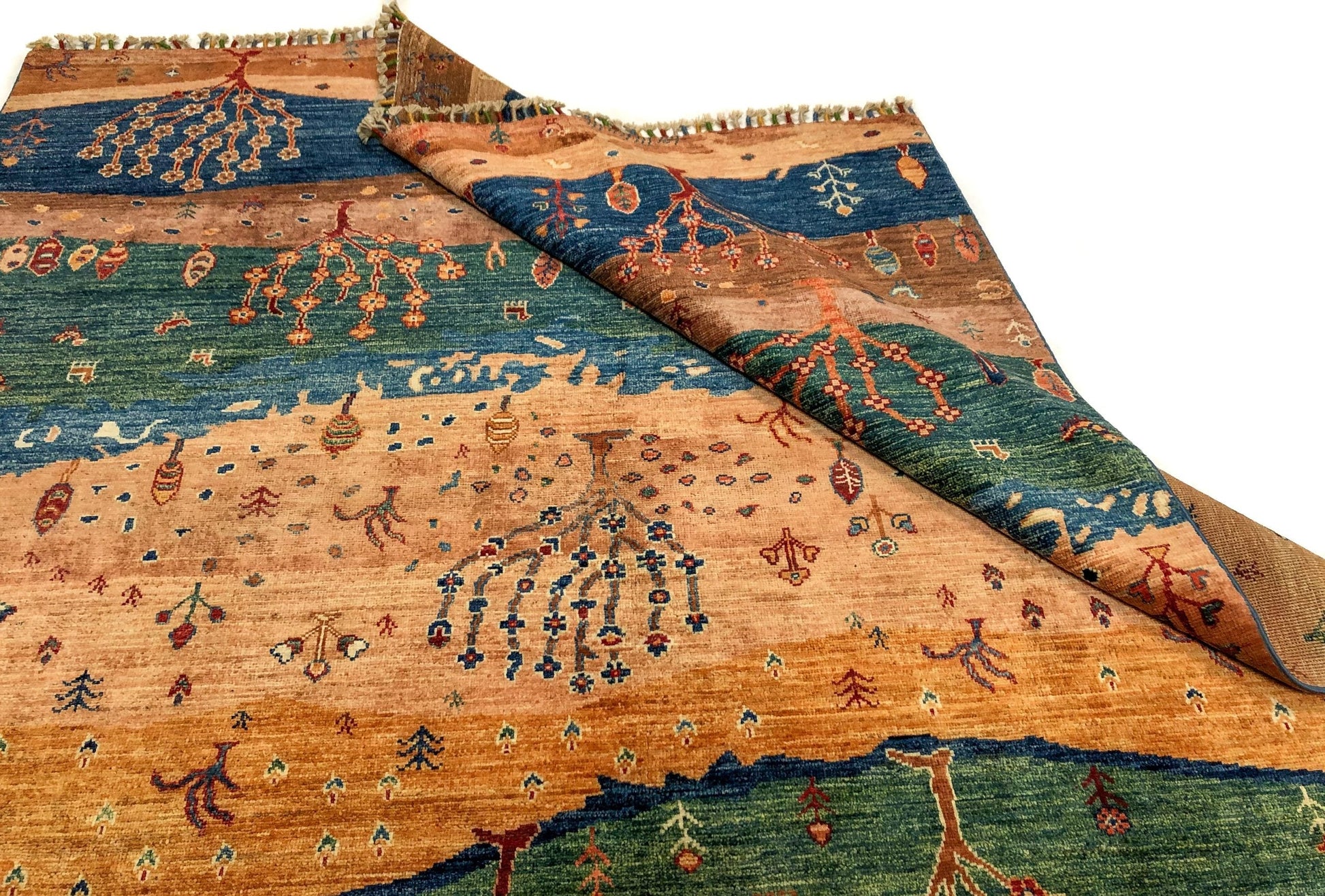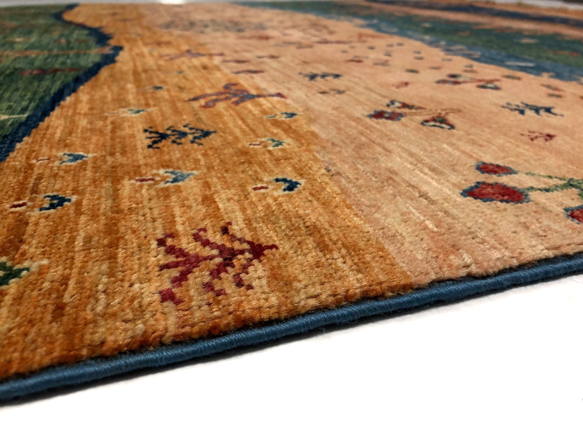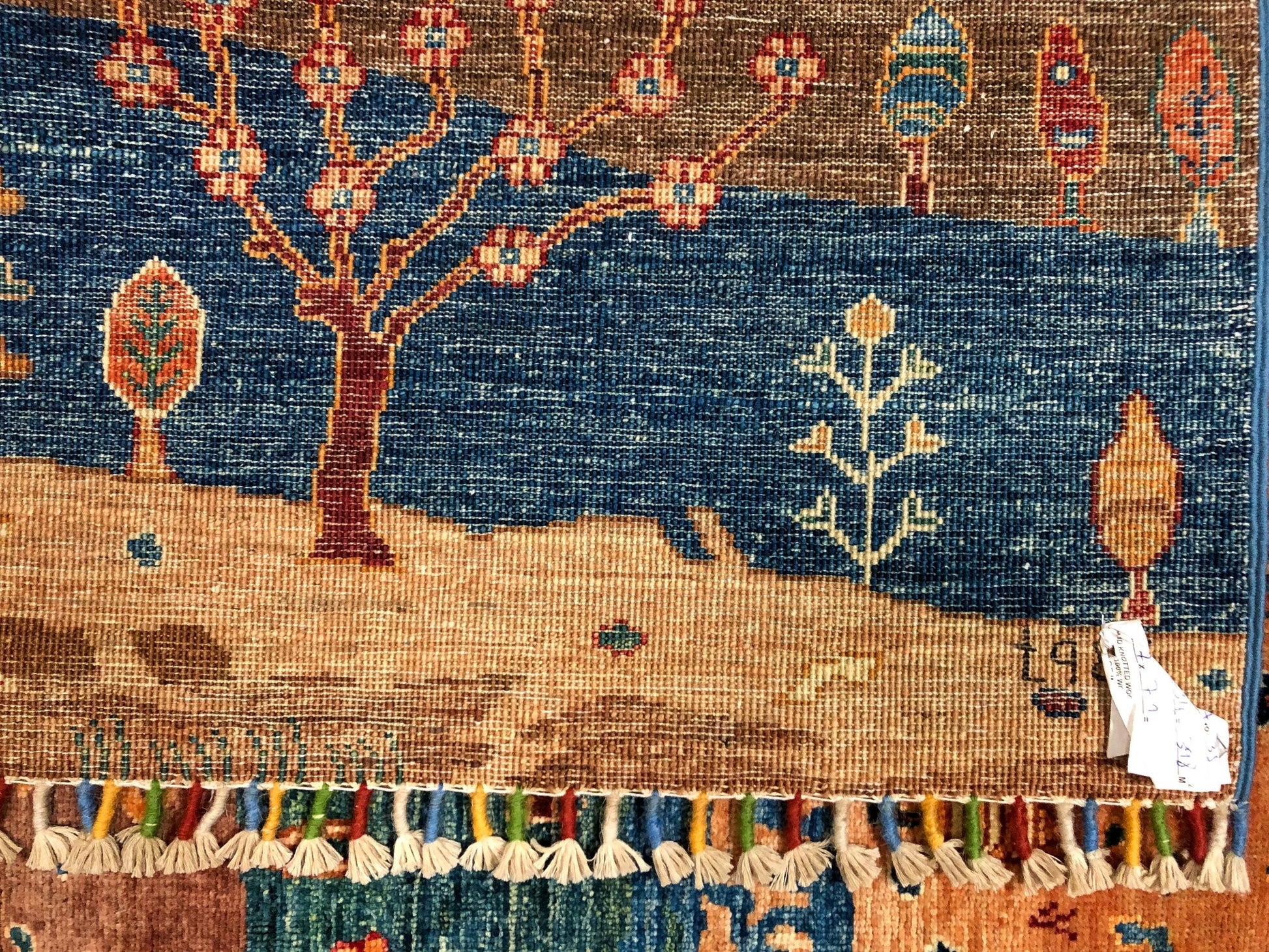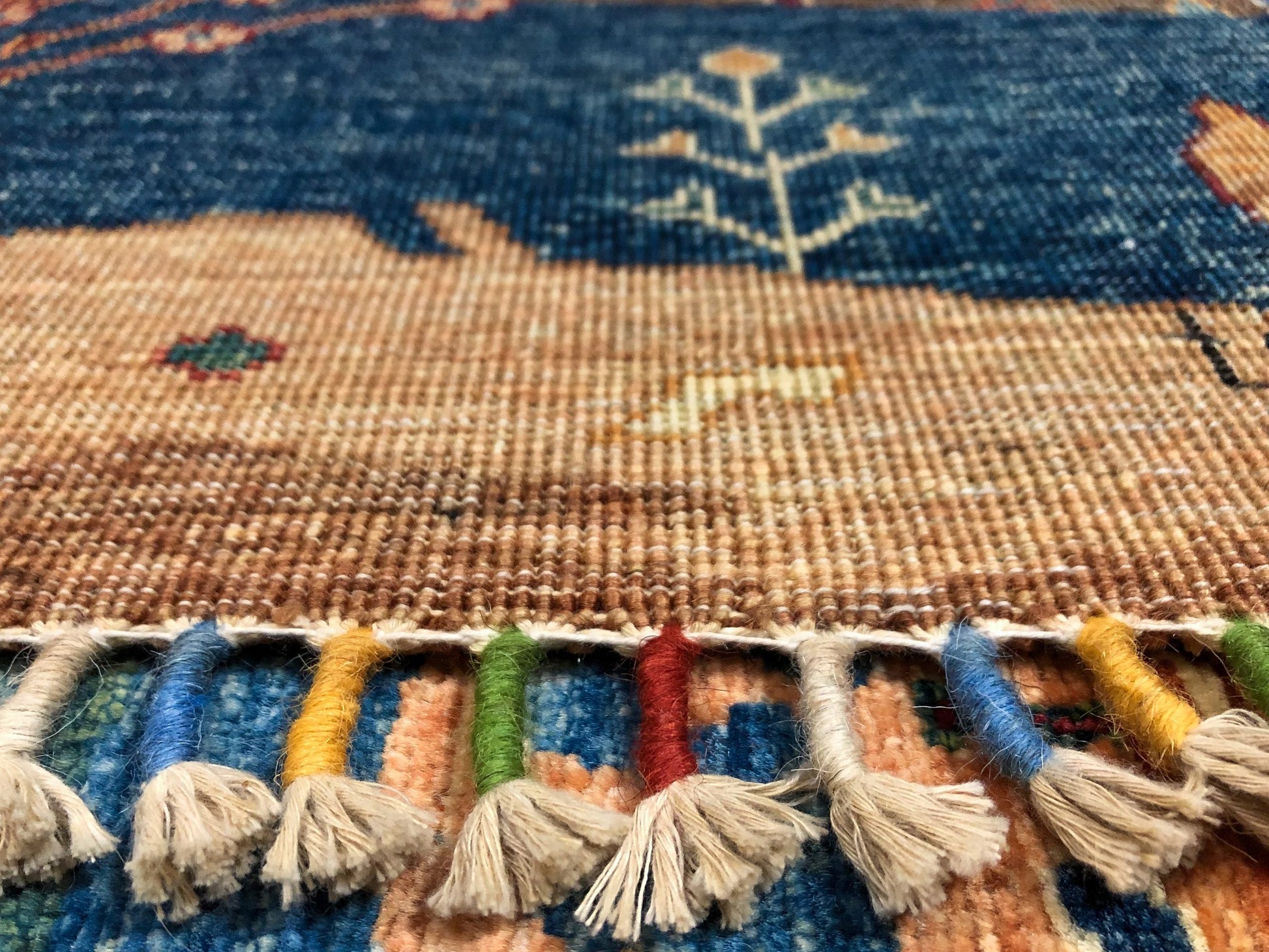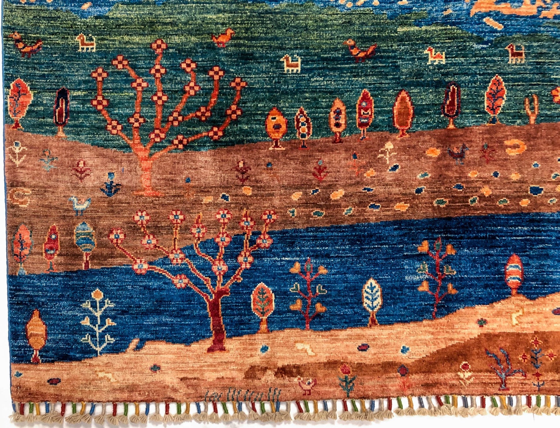 Scenic, landscape design Gabbeh with colorful, tasseled fringe ends