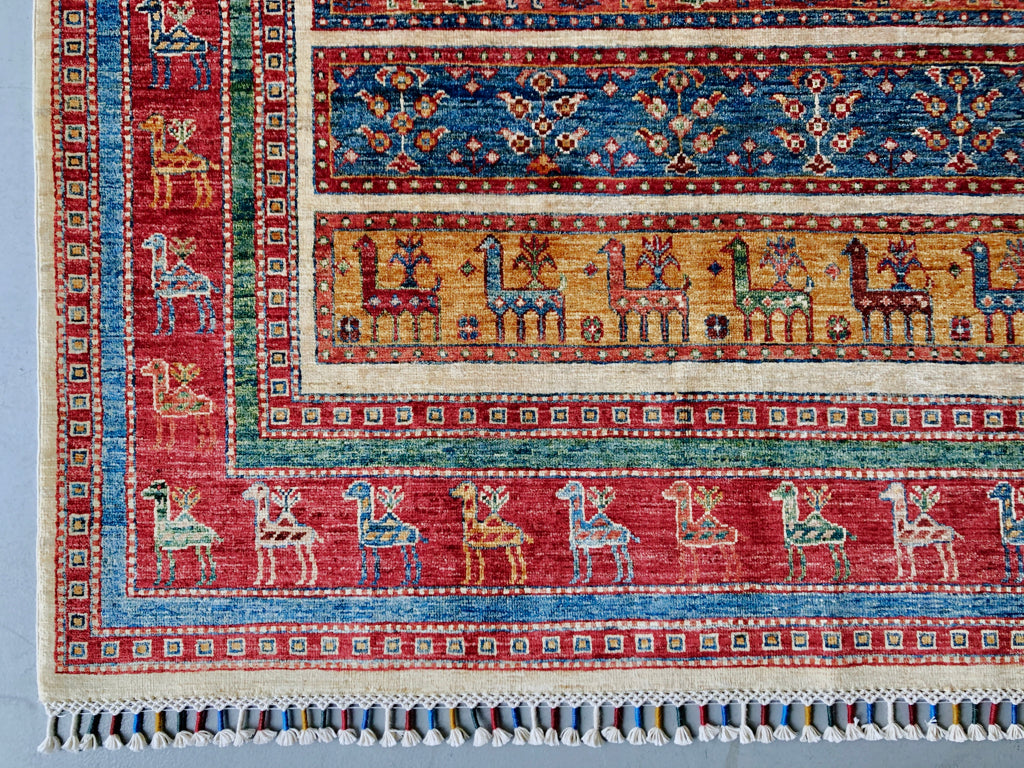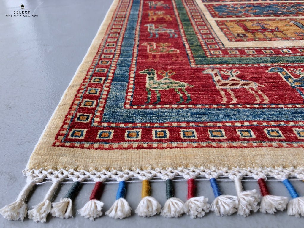 Gabbeh design with tasseled fringe – hand-knotted of hand-spun, vegetable-dyed Ghazni wool (Afghanistan)