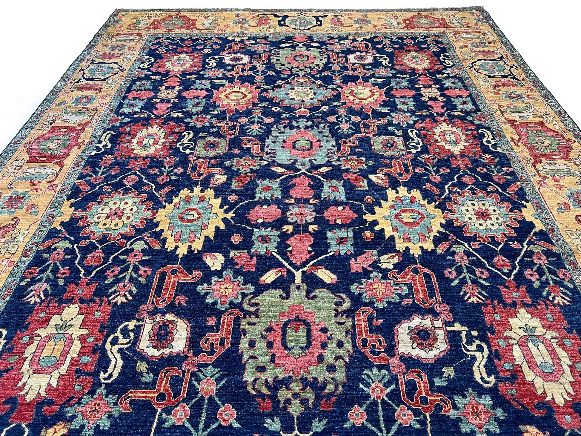 This Afghan Serapi showcases the timeless Serapi/Heriz design, reimagined with a sophisticated navy and gold palette. Hand-knotted by skilled Afghan artisans using hand-spun Ghazni wool dyed with natural vegetable pigments, each knot reflects centuries of weaving heritage. The late 19th-century pattern has been thoughtfully revised to complement contemporary interiors while maintaining authentic construction methods. At 10x14, this substantial piece anchors living spaces with rich color and intricate detail, offering both artistic merit and enduring durability characteristic of premium Afghan rugs.