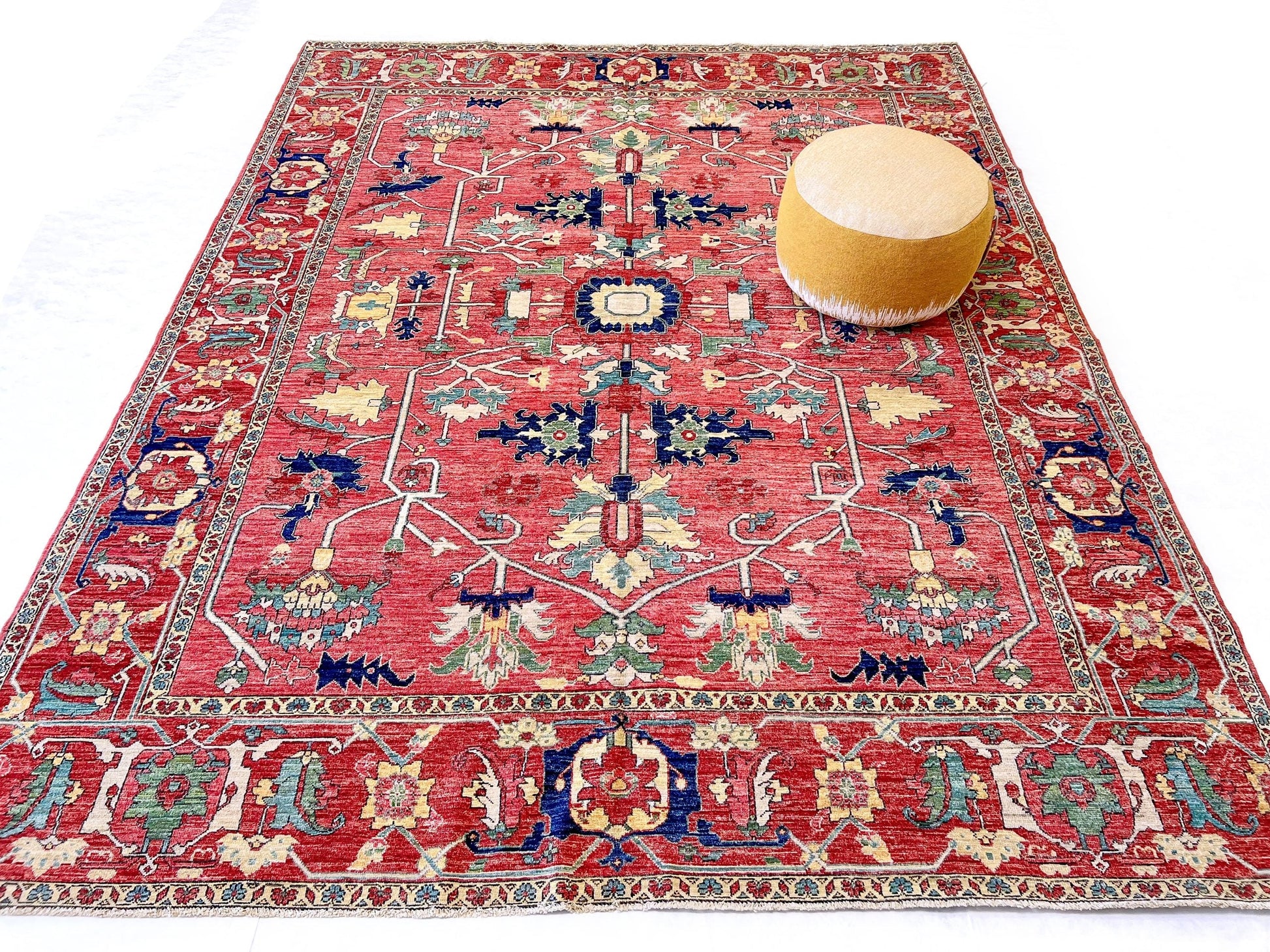 This authentic Afghan Heriz showcases the timeless elegance of late 19th century Persian design, rendered in rich, warm reds that deepen with character. Hand-knotted entirely by skilled Afghan artisans using hand-spun Ghazni wool, each knot reflects generations of weaving tradition. The vegetable dyes create a naturally nuanced palette that ages beautifully, developing subtle variations in tone. At 8x10, this substantial piece commands any room with its geometric patterns and sophisticated color story. A genuine investment in craftsmanship and heritage.