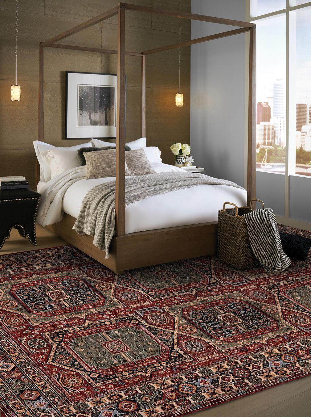 Add warmth and elegance to your home with this beautiful rug inspired by a traditional Persian Quasqai design, this rug is crafted from high-quality New Zealand wool and machine-loomed for durability. The rich red and navy colors will complement any decor while the soft wool provides comfort underfoot. Perfect for adding a touch of culture to any room.