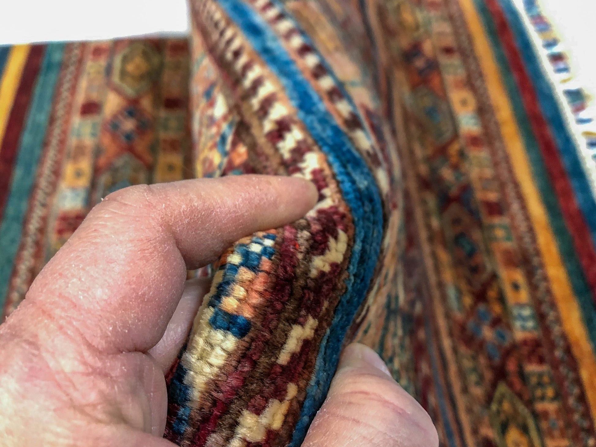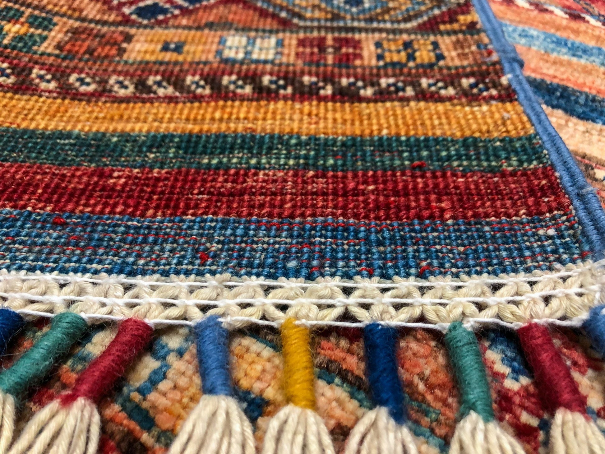 Khorjin (Khurjeen) – horizontal Gabbeh design with colorful tasseled fringes – hand-knotted of hand-spun, vegetable-dyed Ghazni wool in Afghanistan; exported from Pakistan