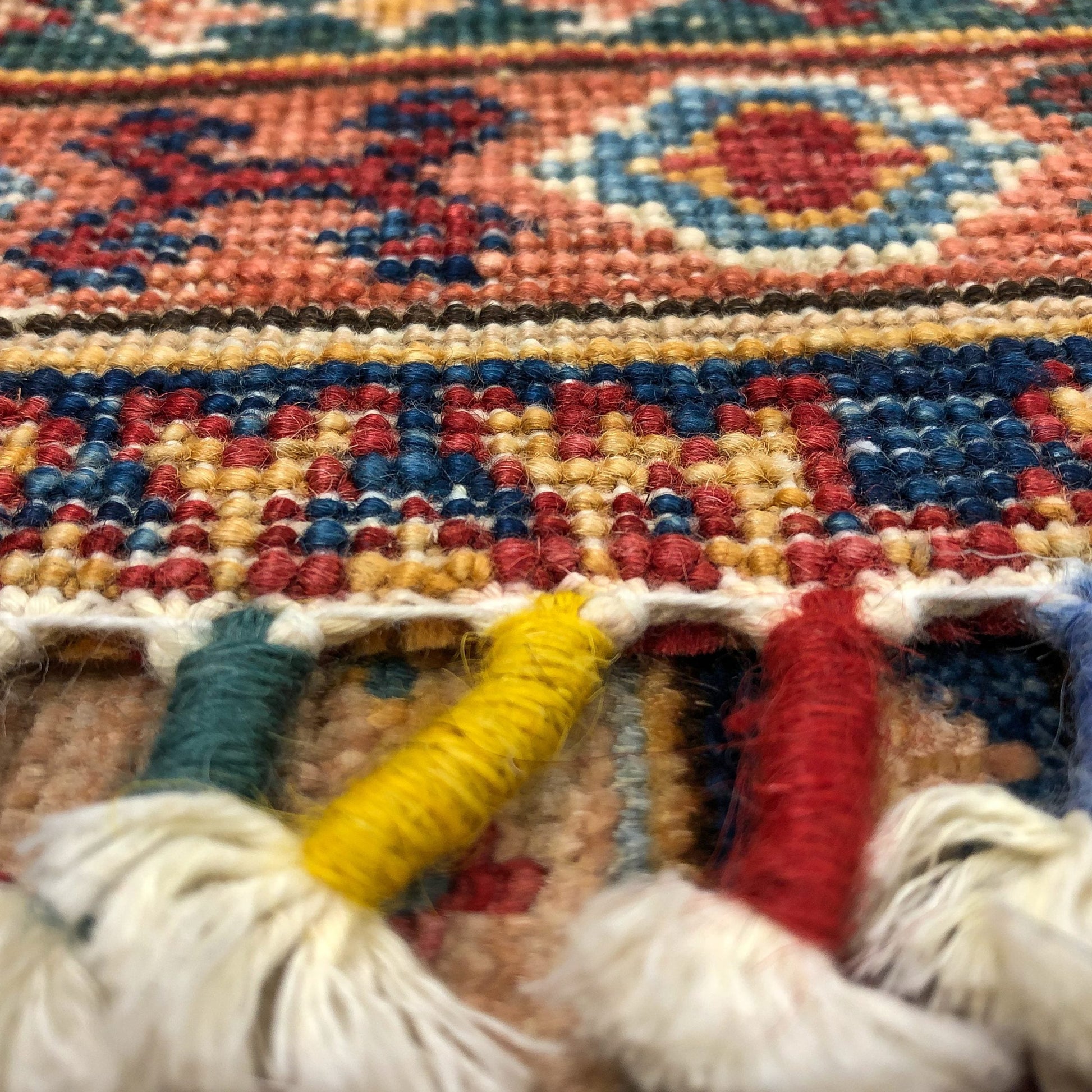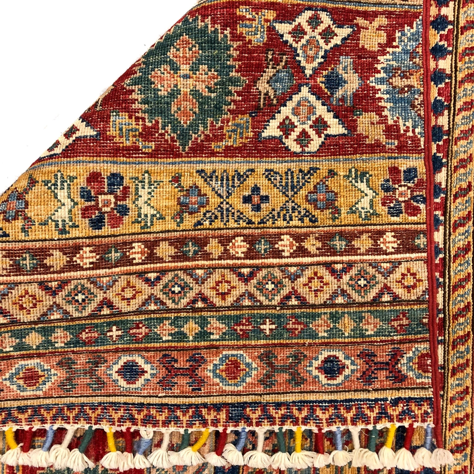 Khorjin (Khurjeen) horizontal design with decorative tasseled fringe – hand-knotted of hand-spun, vegetable-dyed Ghazni wool in Afghanistan; exported from Pakistan