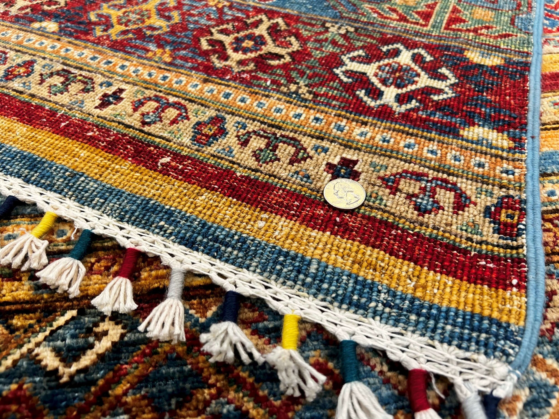 Hand-knotted from hand-spun, vegetable-dyed, Ghazni wool, this Khorjin rug is a stunning addition to any room. The intricate weaving technique creates a durable and unique piece, while the bold multi-color design adds a touch of color and character to your space.
