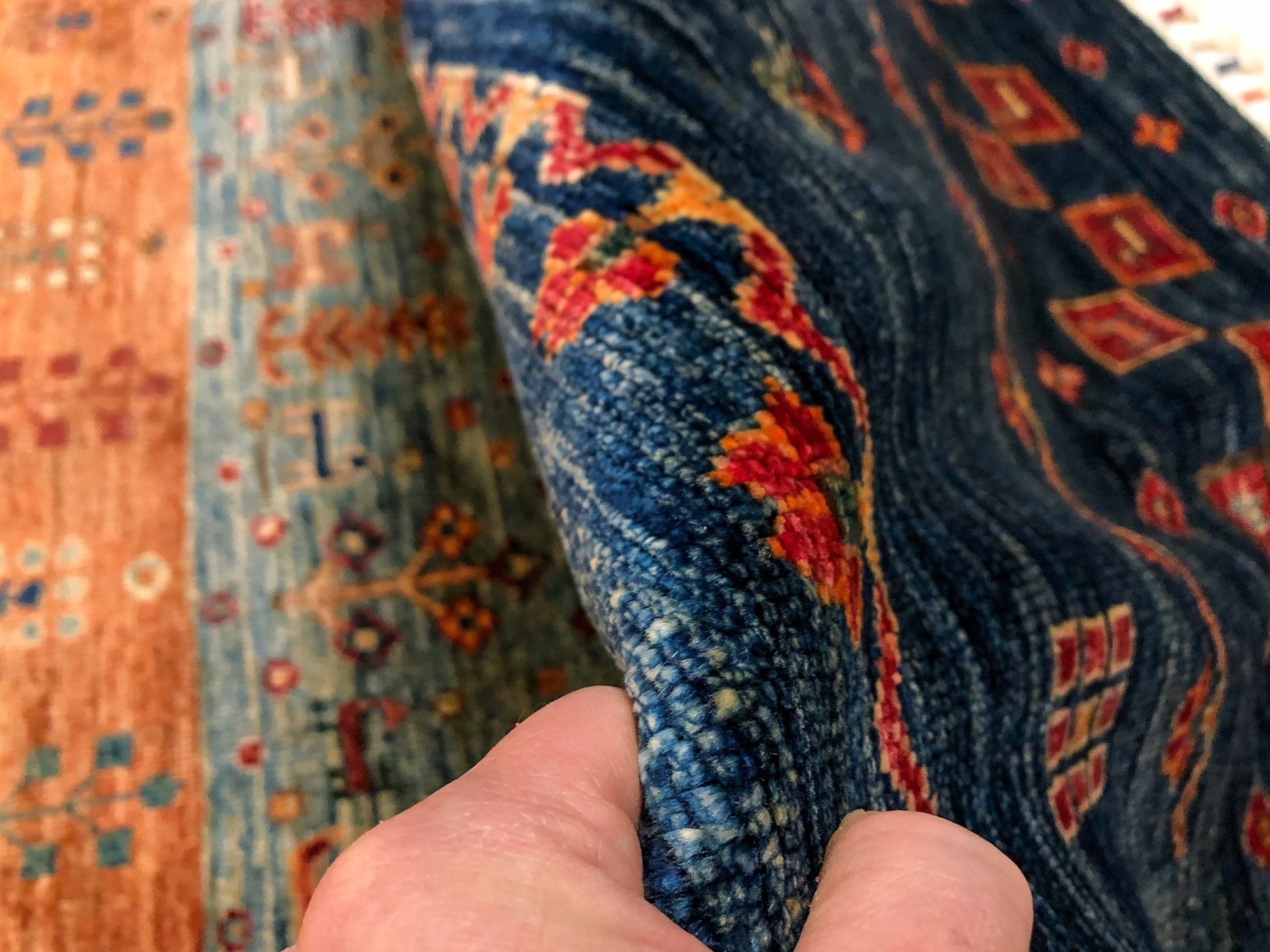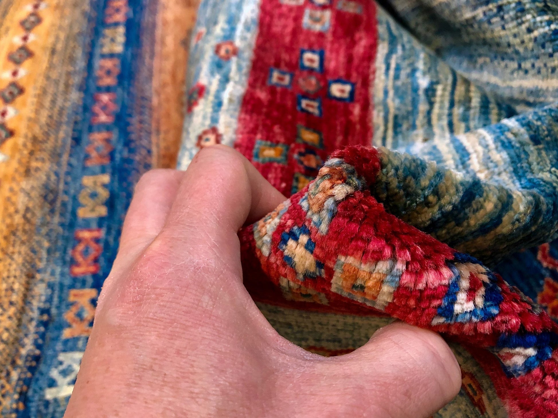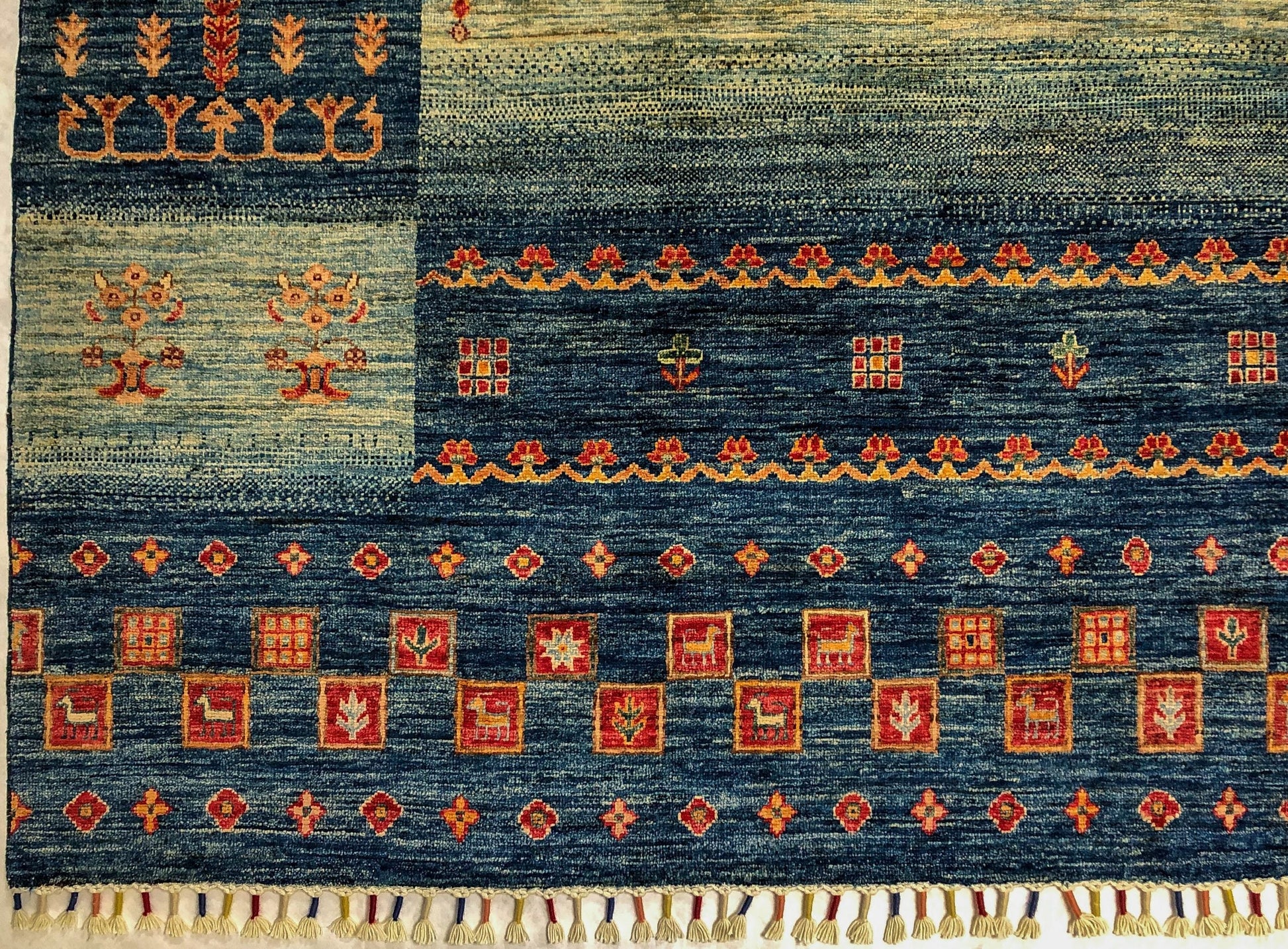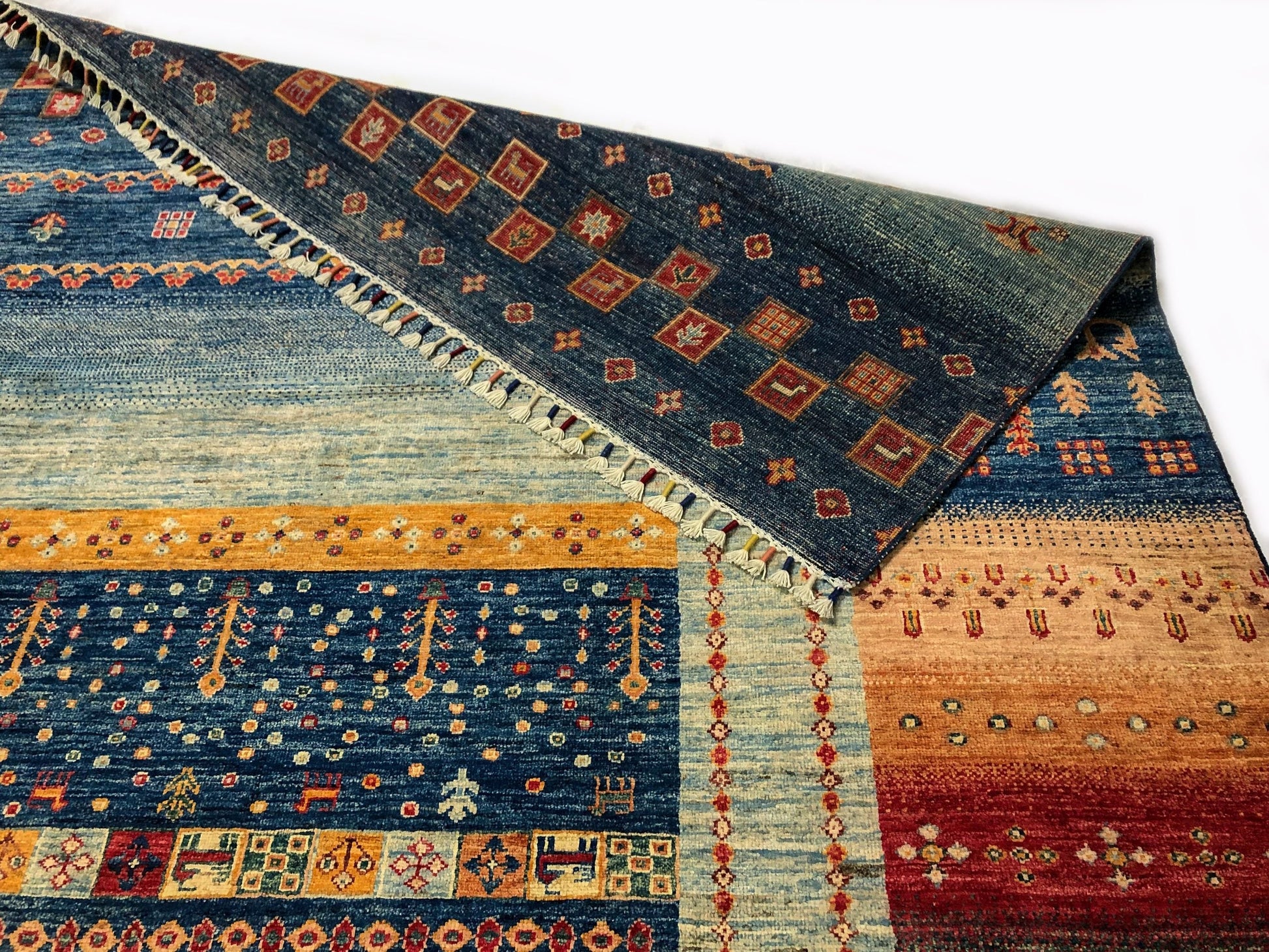 This Khorjin-style rug merges traditional Afghan weaving with Gabbeh design sensibilities, creating a distinctive floor covering with authentic character. Hand-knotted from hand-spun Ghazni wool dyed with natural vegetable pigments, the piece showcases rich blue and multicolor tones throughout its 9x12 expanse. Decorative tasseled fringe adorns both ends, adding textural interest and traditional appeal. Crafted in Afghanistan and exported from Pakistan, this rug represents genuine artisanal craftsmanship and the heritage techniques passed through generations of skilled weavers.