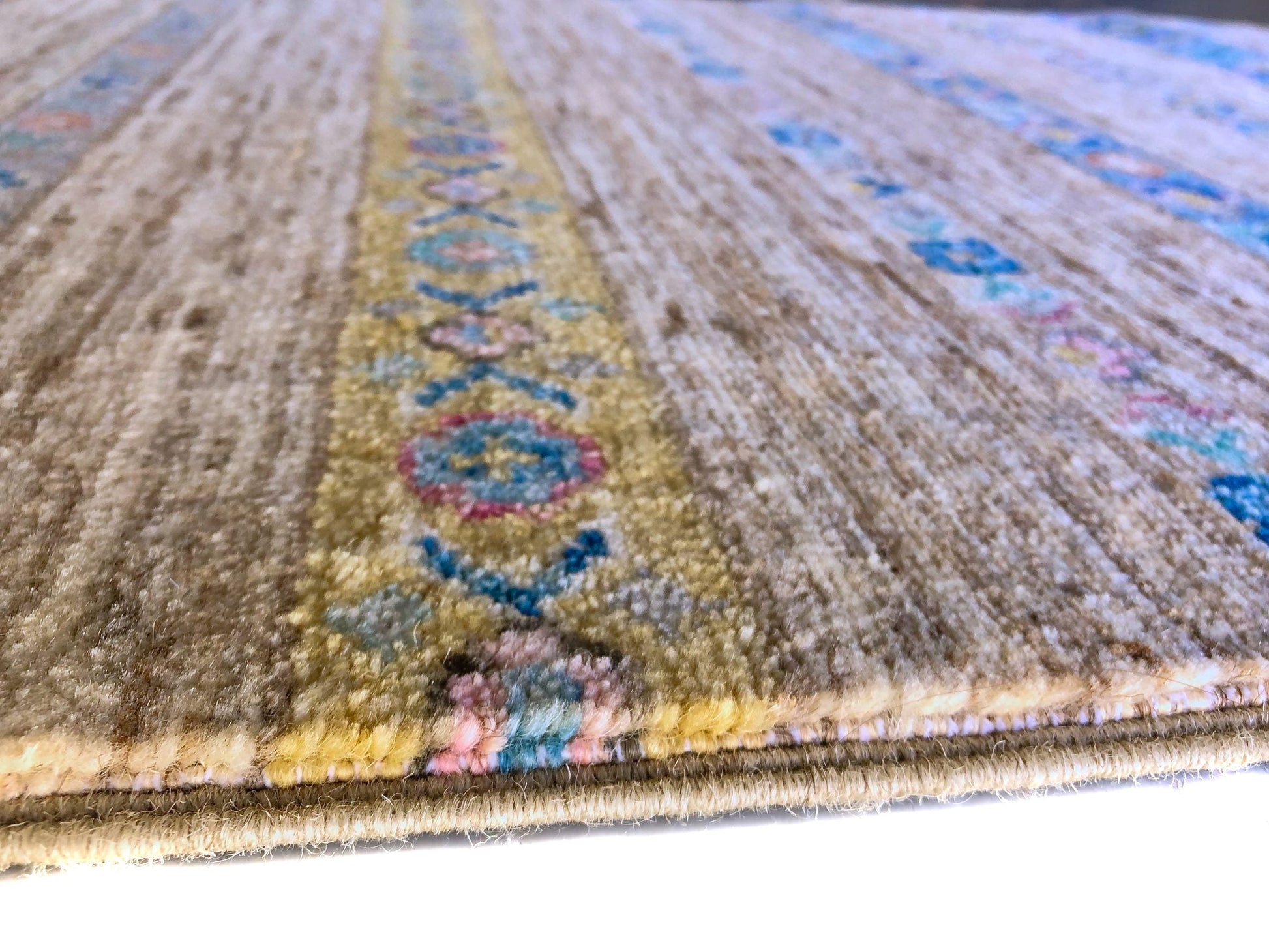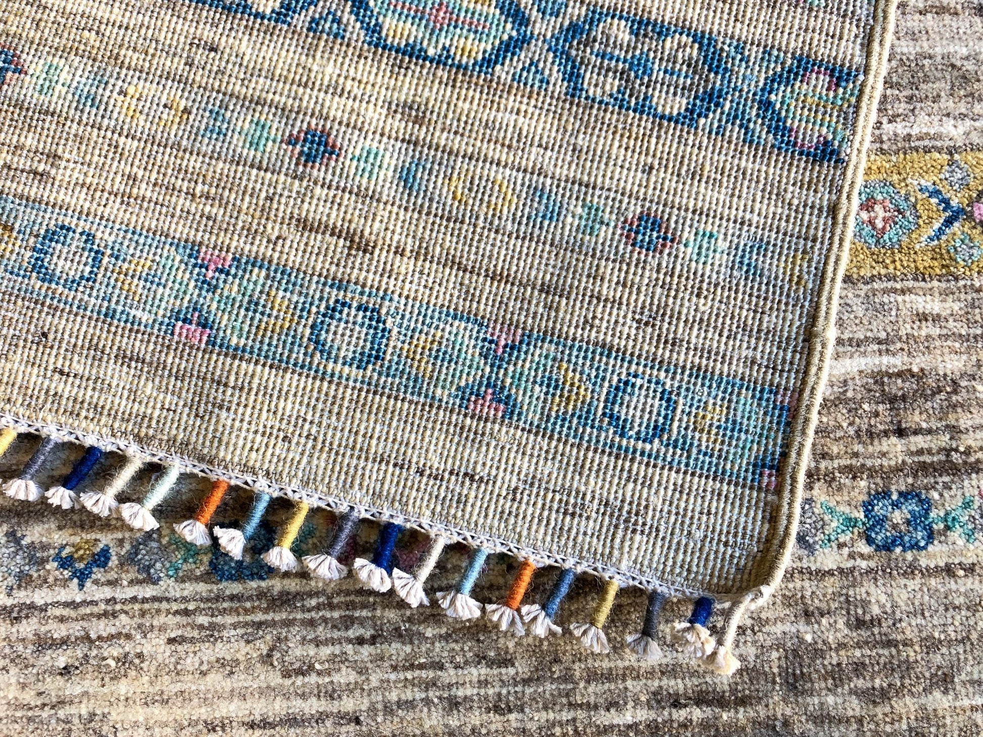 Updated Khorjin (Khurjeen) design with decorative fringe – hand-knotted of hand-spun, vegetable-dyed, and natural-colored Ghazni wool in Afghanistan; finished and exported from Pakistan
