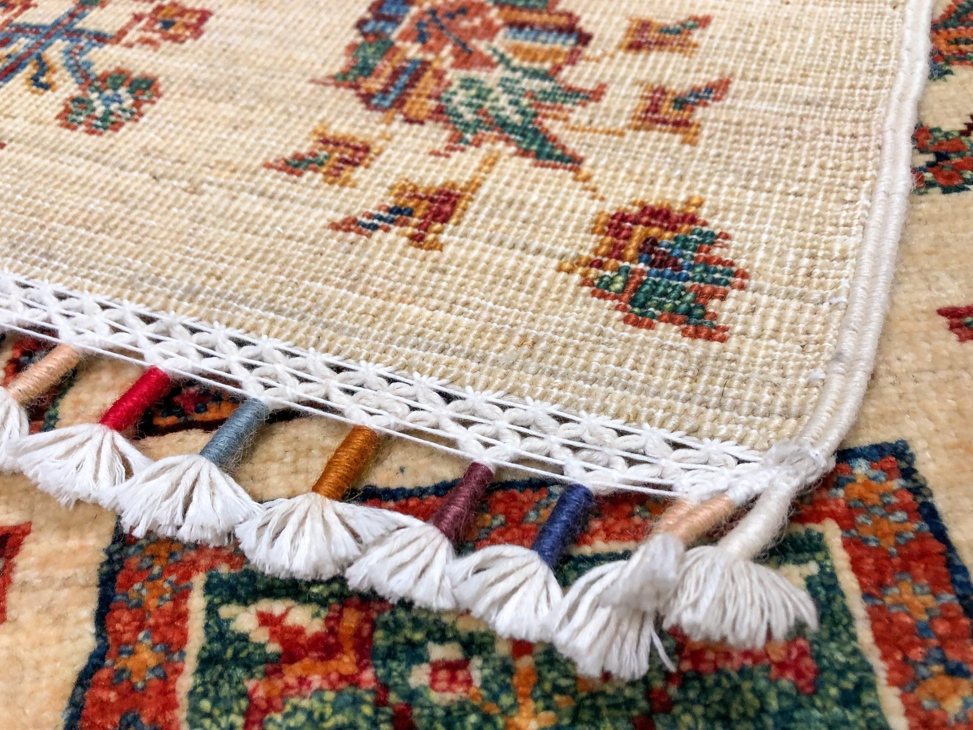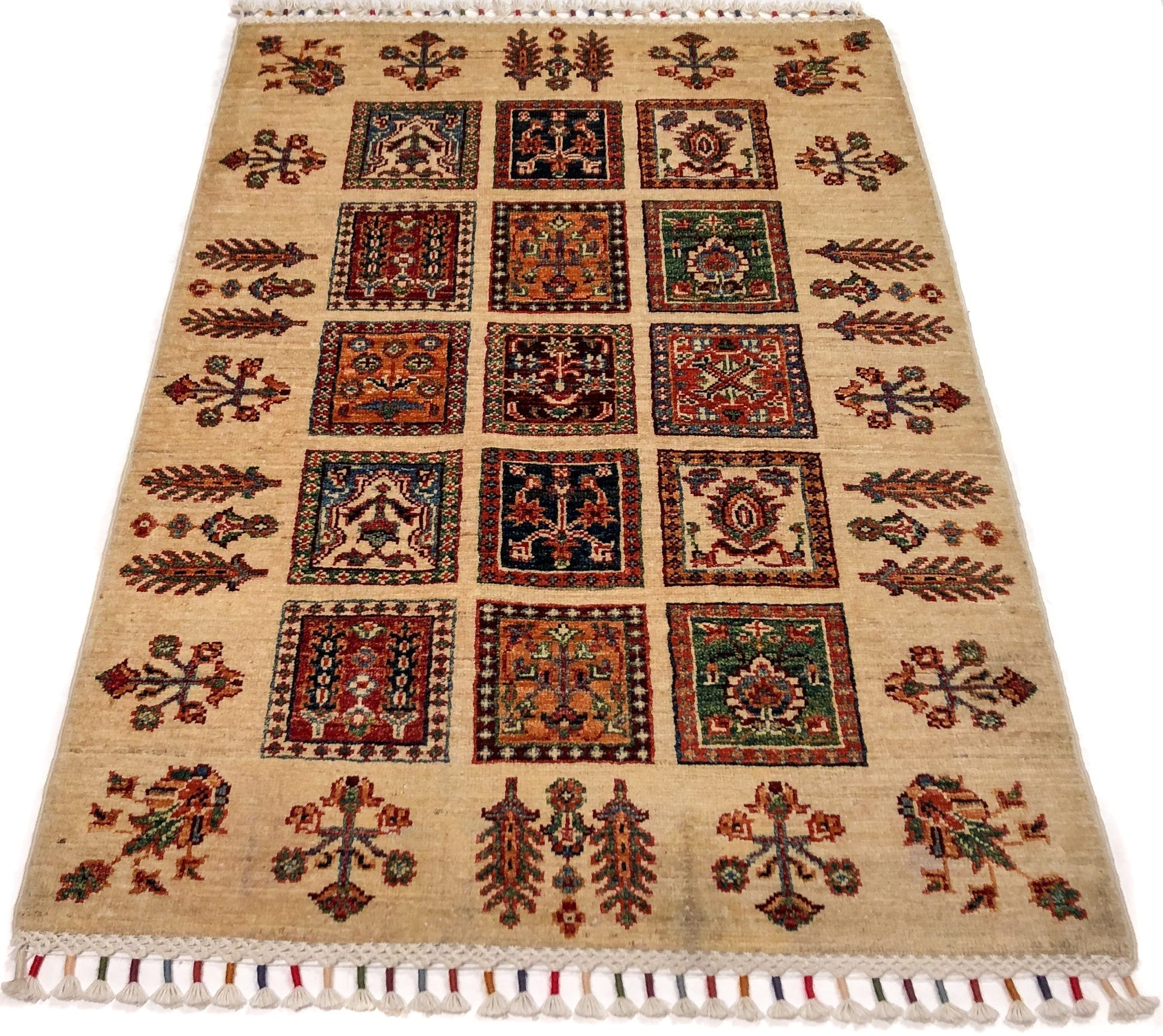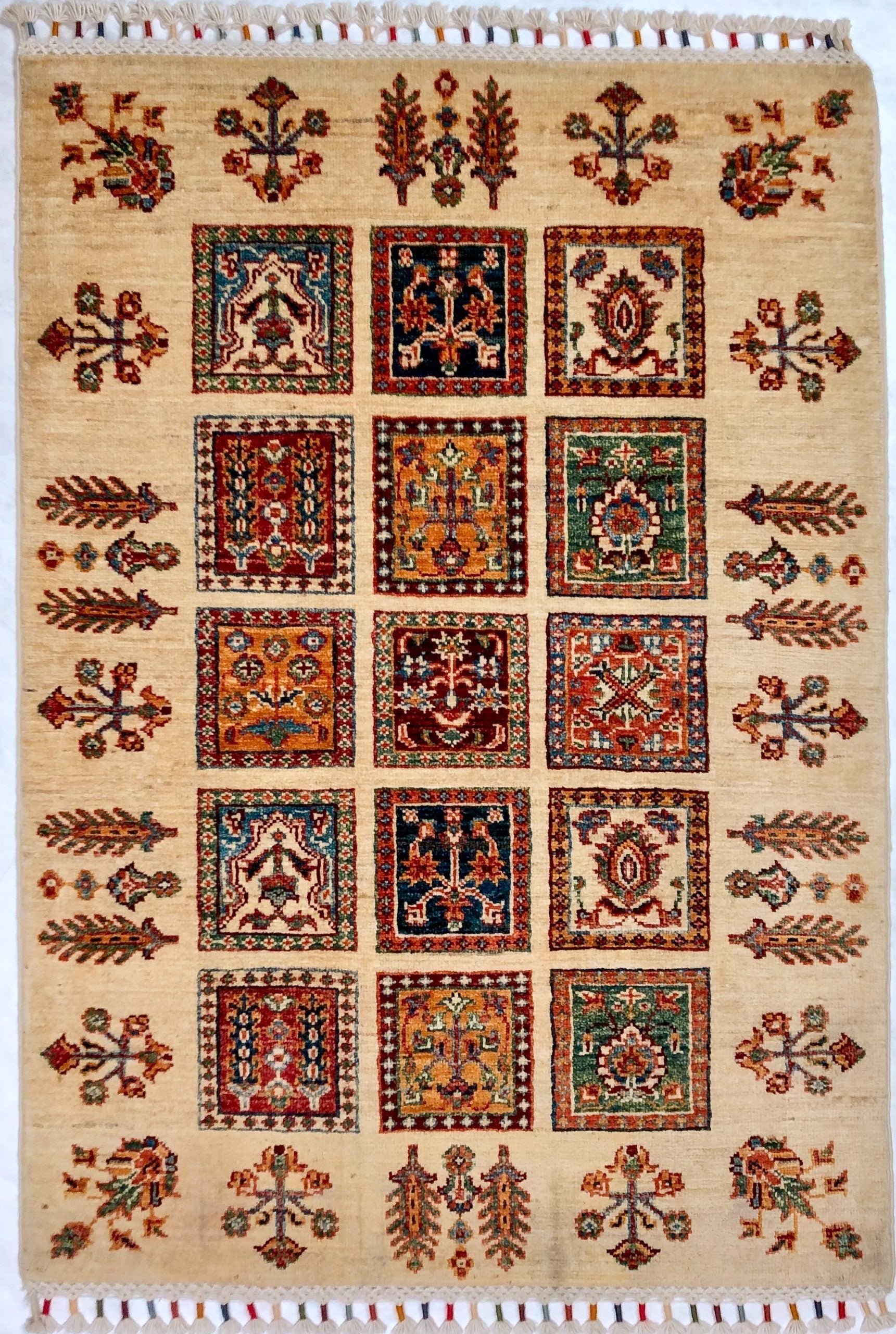 Khorjin (Khurjeen) featuring Bahktiari panel design with decorative fringe – hand-knotted of hand-spun, vegetable-dyed Ghazni wool in Afghanistan; exported from Pakistan