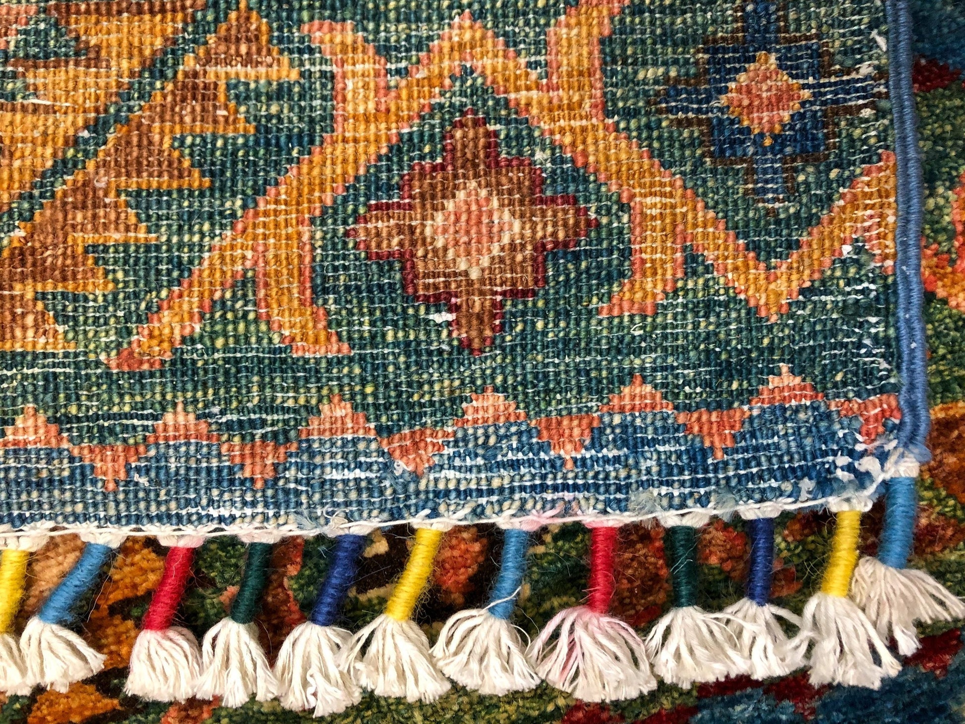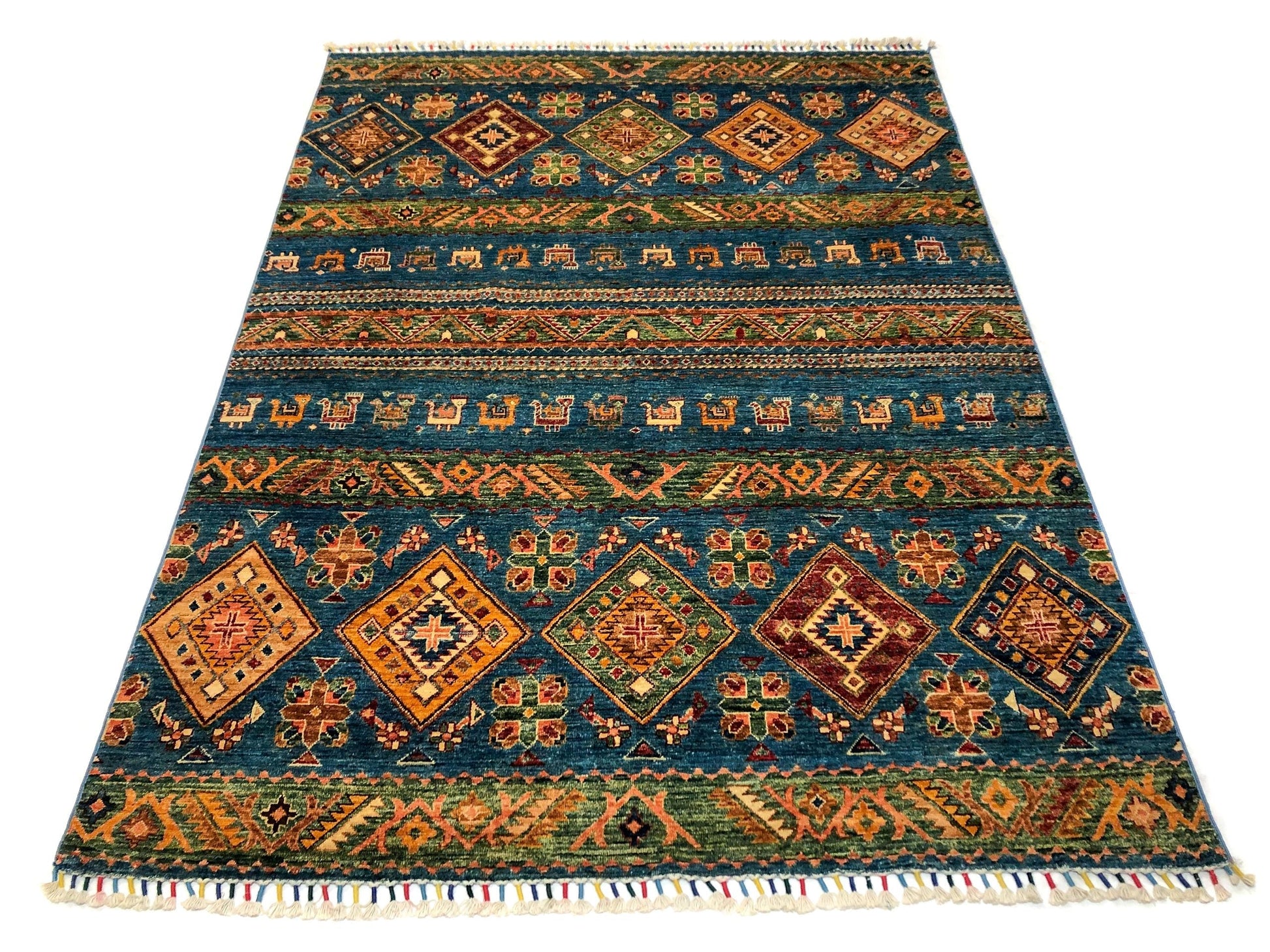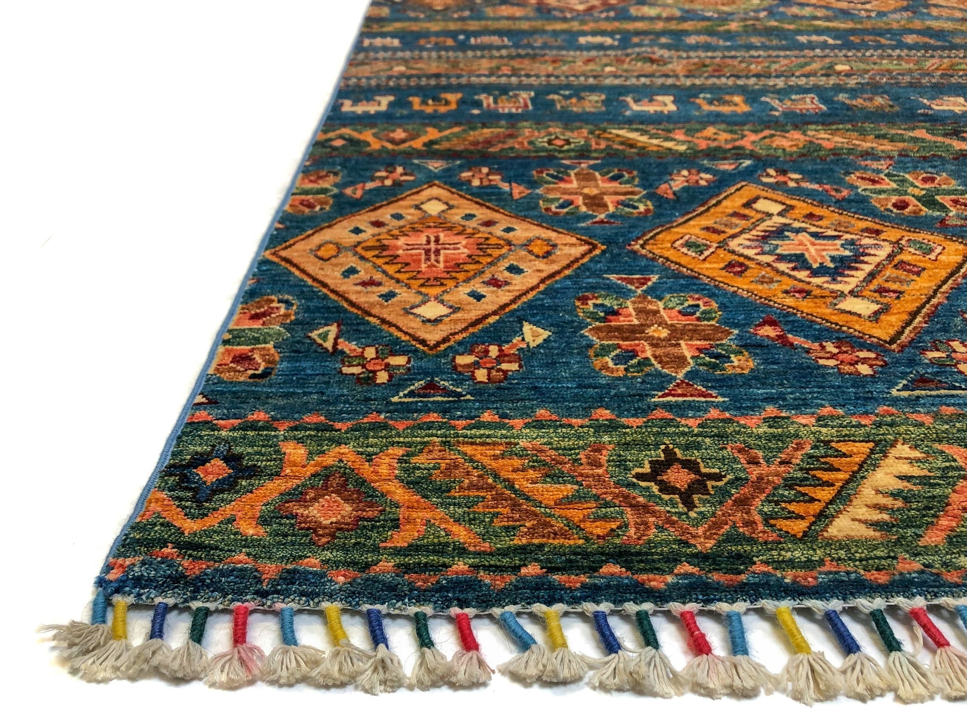 Khorjin (Khurjeen) – horizontal design with colorful, tasseled fringes – hand-knotted of hand-spun, vegetable-dyed Ghazni wool in Afghanistan; exported from Pakistan