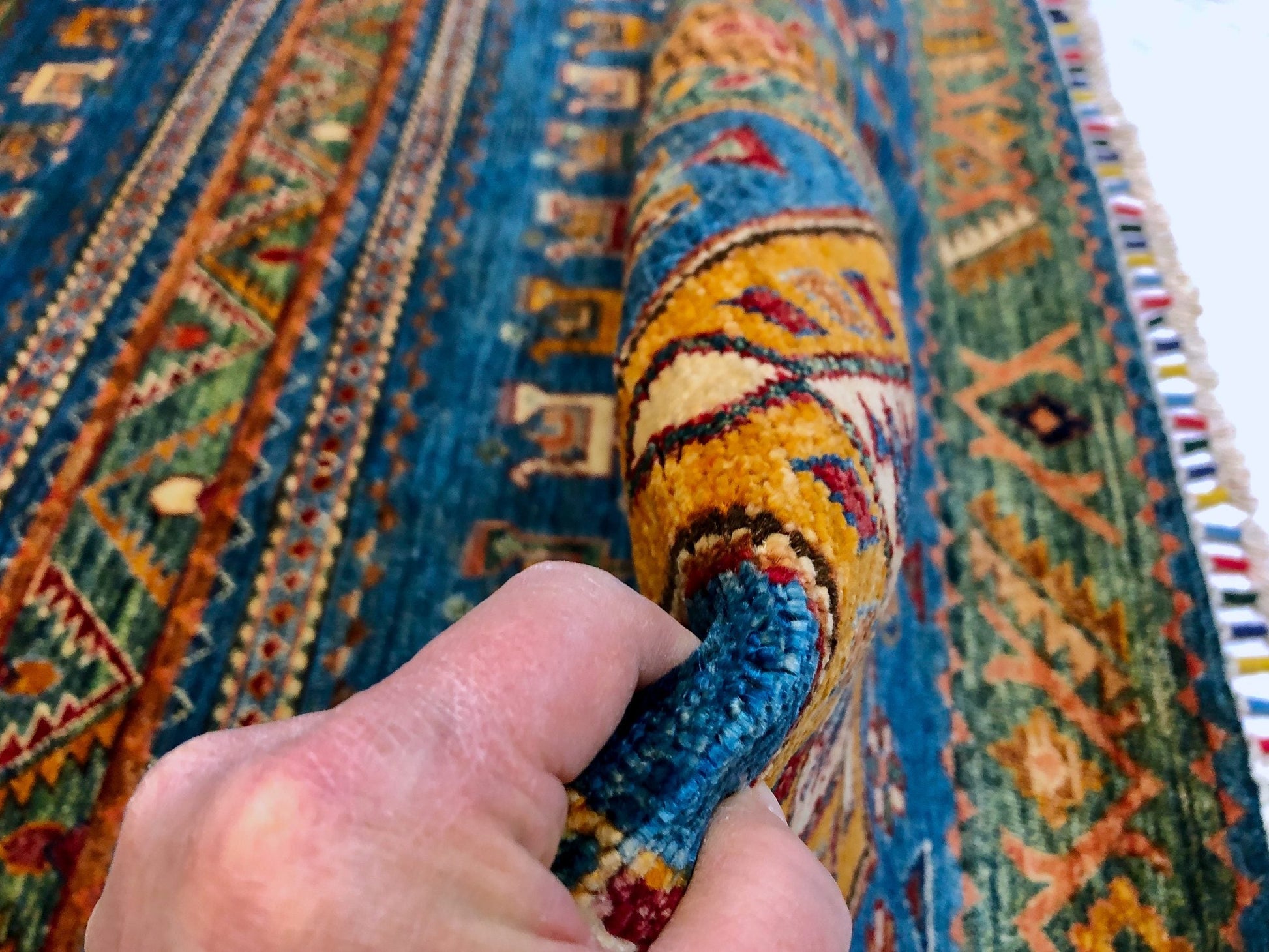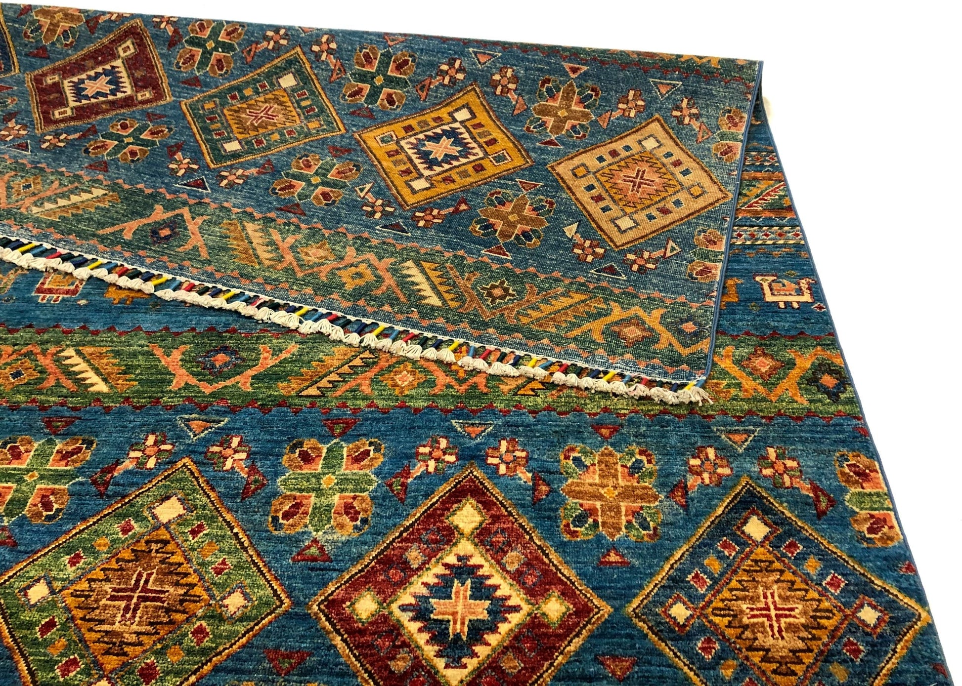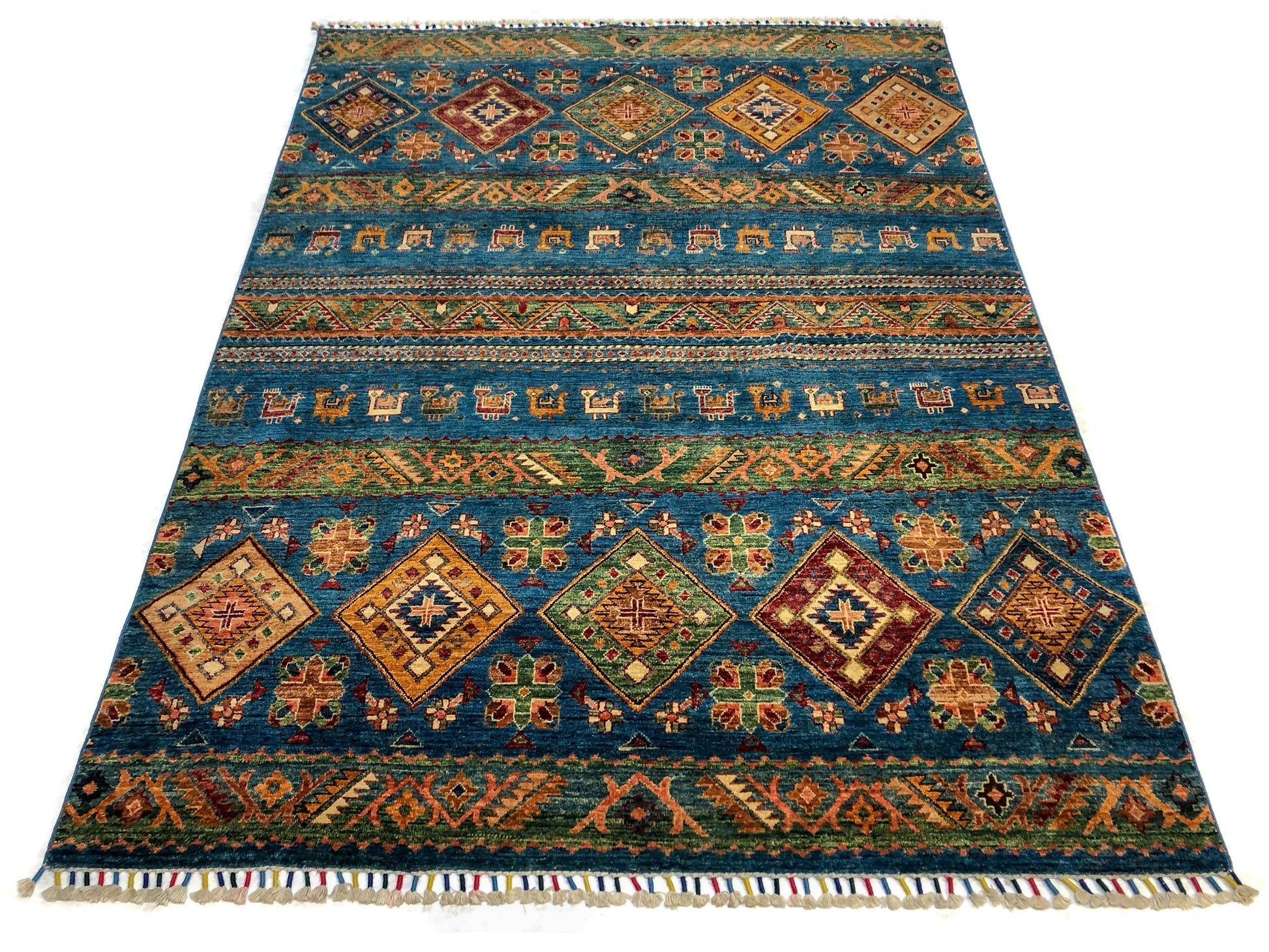 Khorjin (Khurjeen) – horizontal design with colorful, tasseled fringes – hand-knotted of hand-spun, vegetable-dyed Ghazni wool in Afghanistan; exported from Pakistan