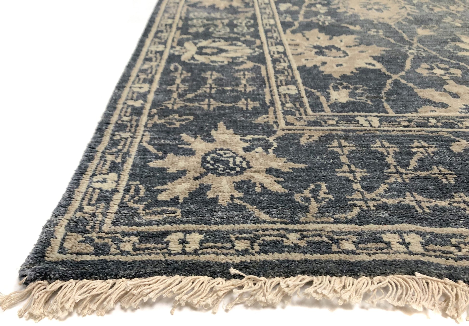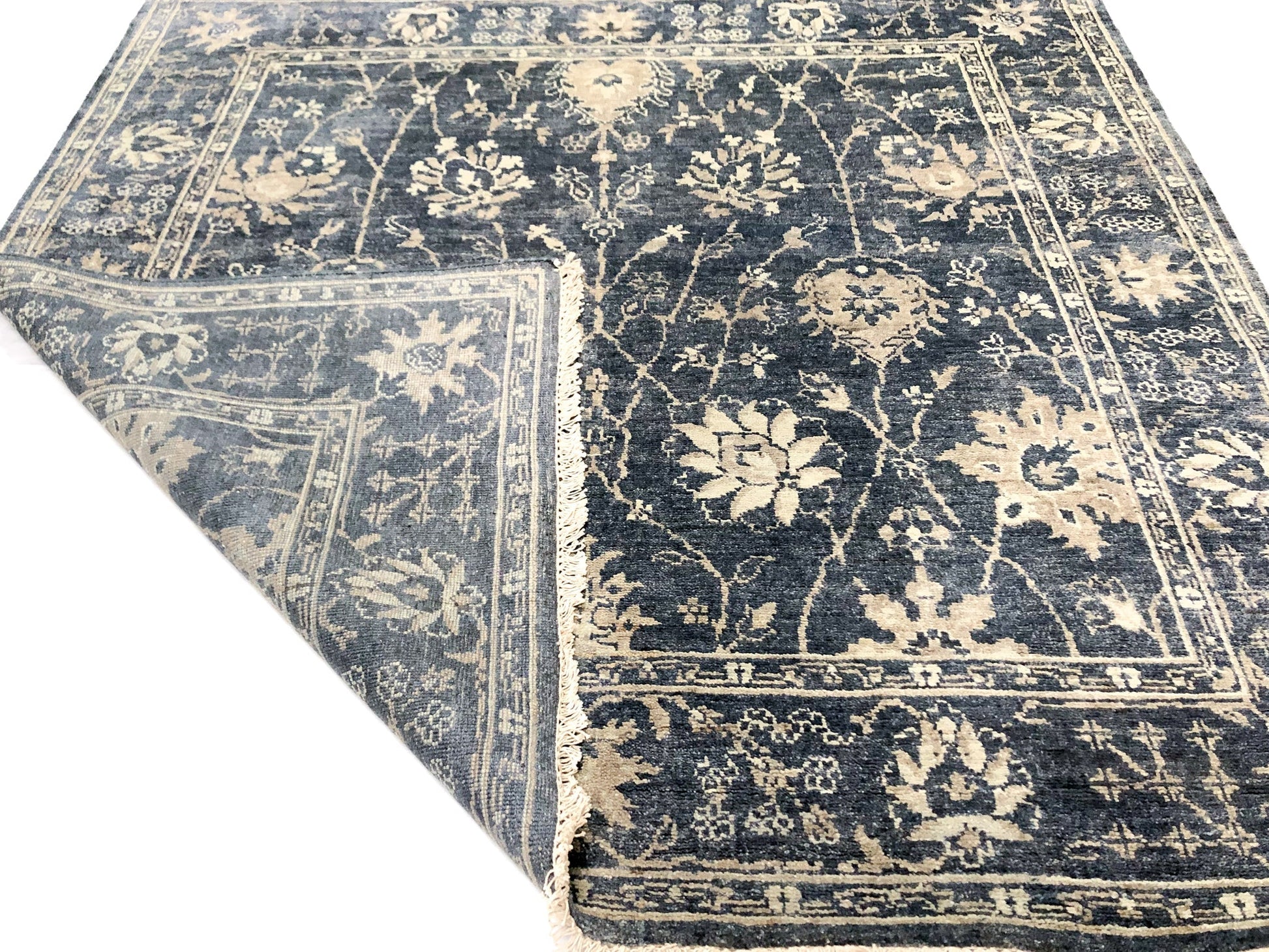 Handcrafted in India using traditional techniques, this wool rug showcases an authentic Oushak design rendered in sophisticated denim blues. The hand-knotted construction ensures durability and timeless appeal, while the cool blue palette brings understated elegance to any space. At 6' square, it provides substantial coverage for living rooms, bedrooms, or dining areas. The natural wool fiber offers warmth underfoot and develops character with age, making this piece a lasting investment in quality craftsmanship.
