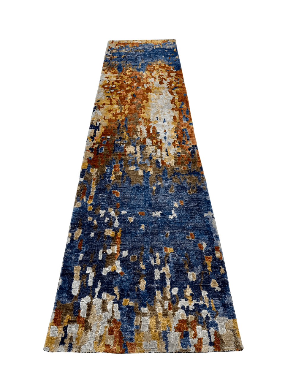 This contemporary runner showcases sophisticated hand-knotted construction using premium bamboo viscose, creating a luxurious sheen that catches light beautifully. Each piece is meticulously hand-carved in India, revealing intricate pile variations that add depth and visual interest to your space. The navy and copper colorway delivers modern elegance, seamlessly complementing both minimalist and eclectic interiors. At 10 feet long, this runner provides substantial coverage while maintaining refined proportions. The natural bamboo viscose fibers offer a silky texture underfoot, combining durability with refined aesthetics for discerning design enthusiasts.