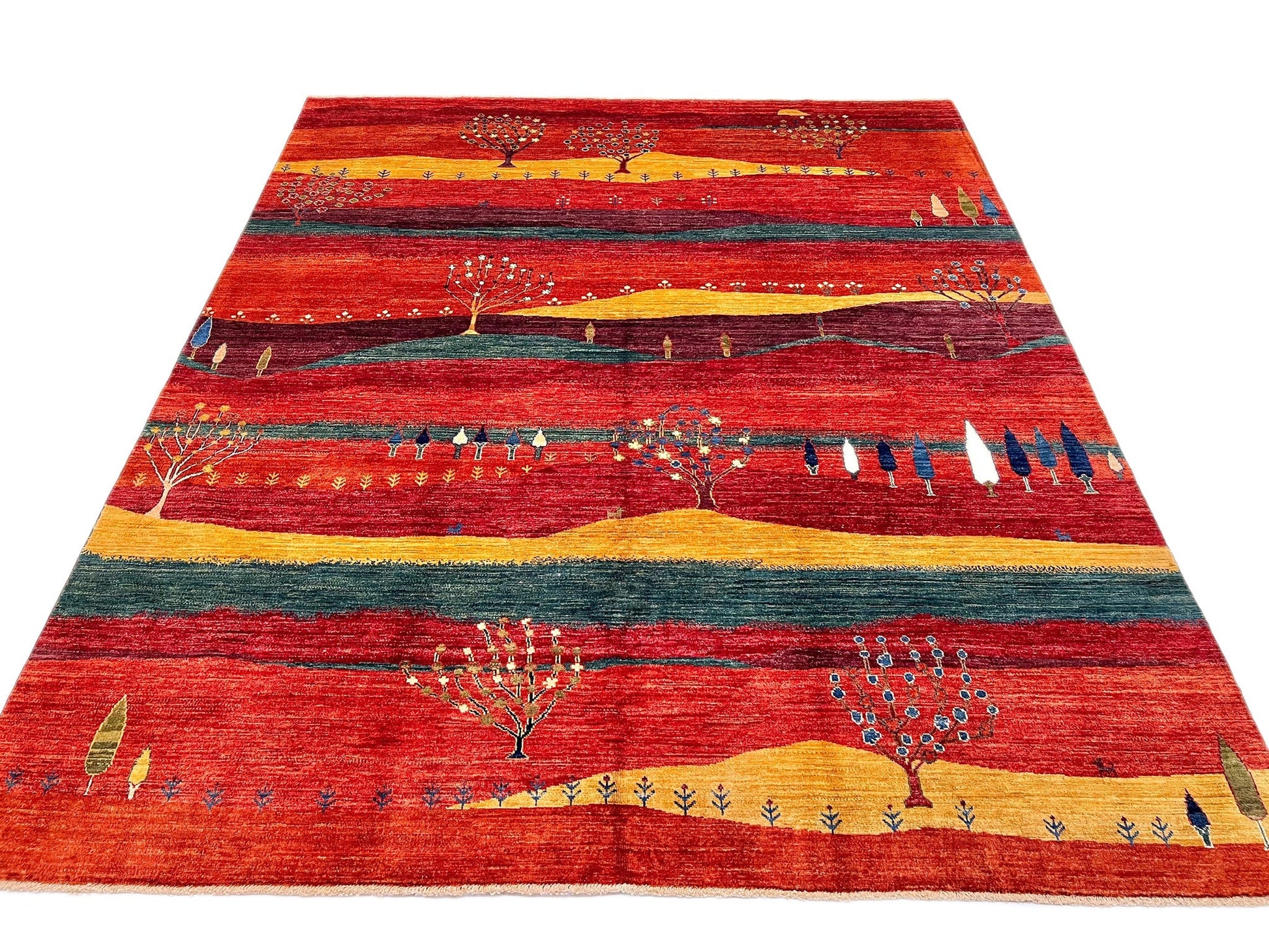 Bring whimsical charm into your home with this enchanting Afghan Gabbeh, where playful cypress trees and blooming flowers dance across a scenic landscape. Hand-knotted from hand-spun, vegetable-dyed Ghazni wool in Afghanistan, this 8x10 masterpiece showcases warm rust, vibrant red, and deep green hues that anchor any space with sophistication. The luster-wash finish reveals the wool's natural luminosity and inviting texture, while the authentic artisanal craftsmanship guarantees a rug that grows more beautiful with time. Perfect for those seeking genuine character and timeless appeal.