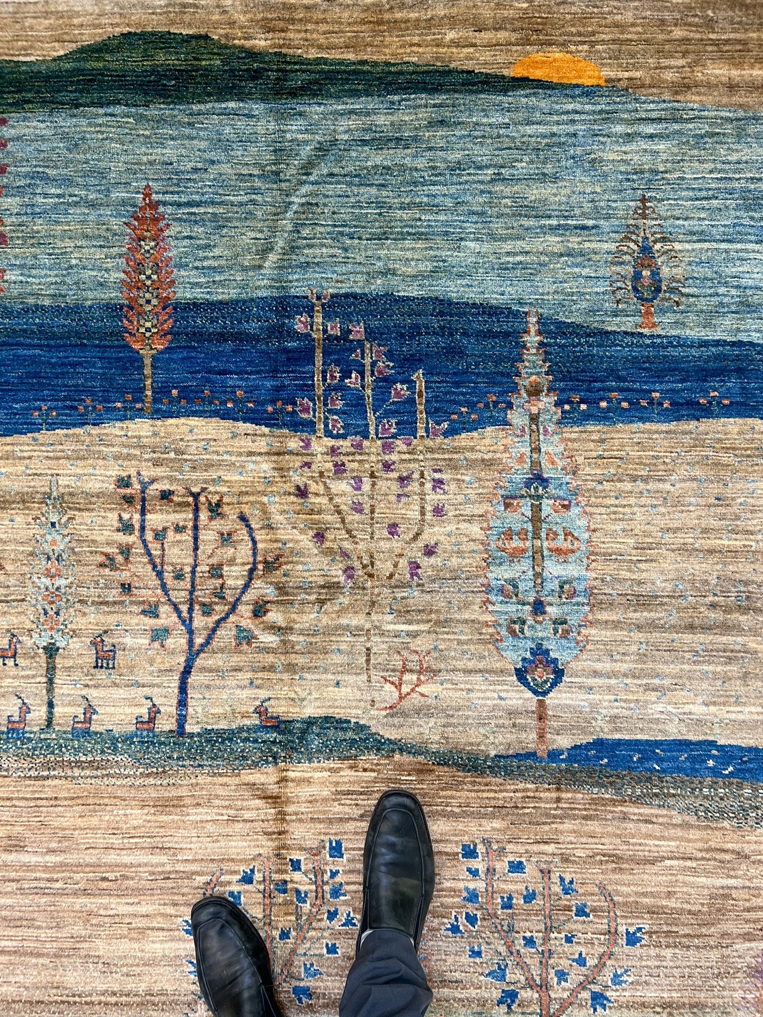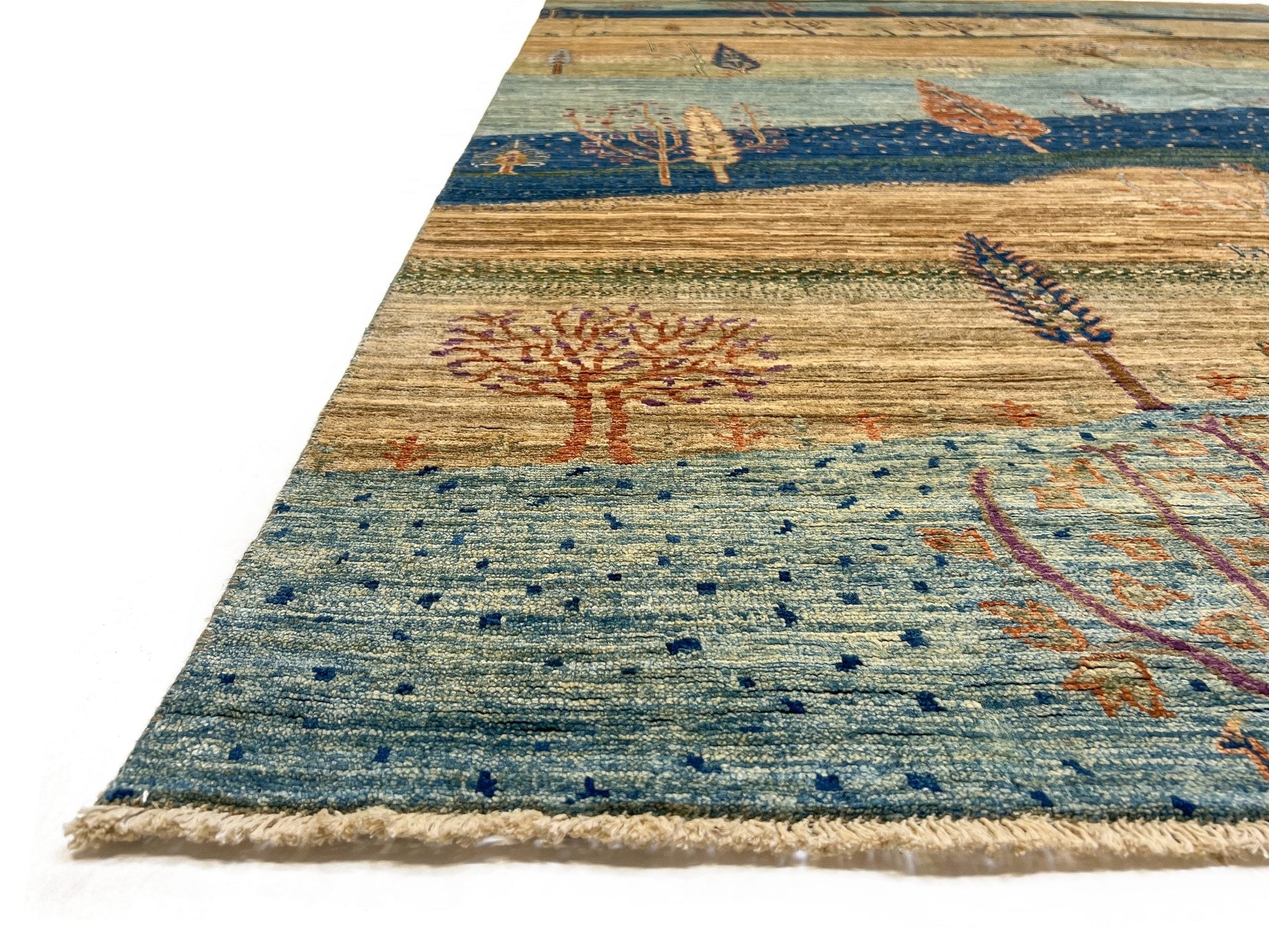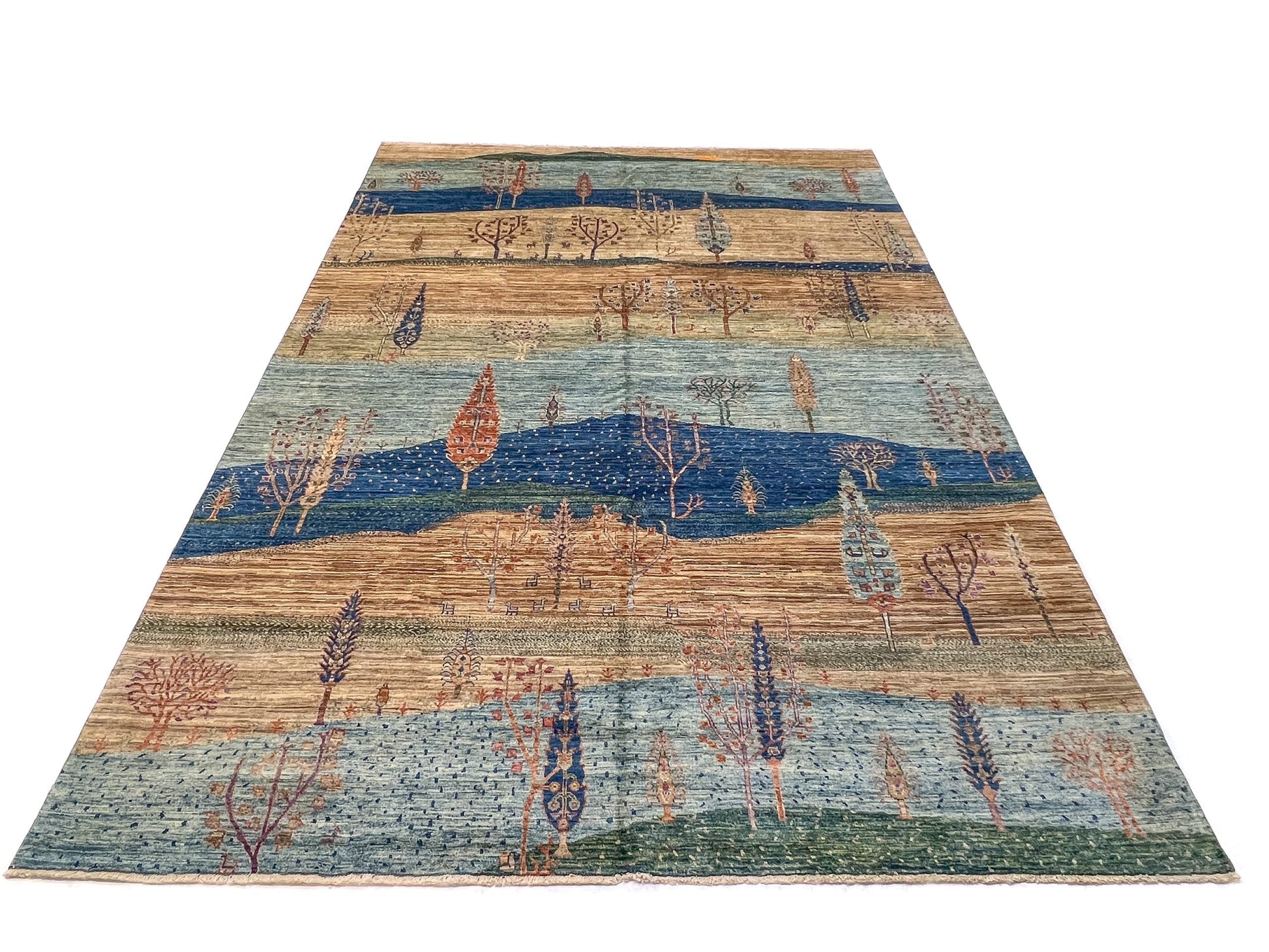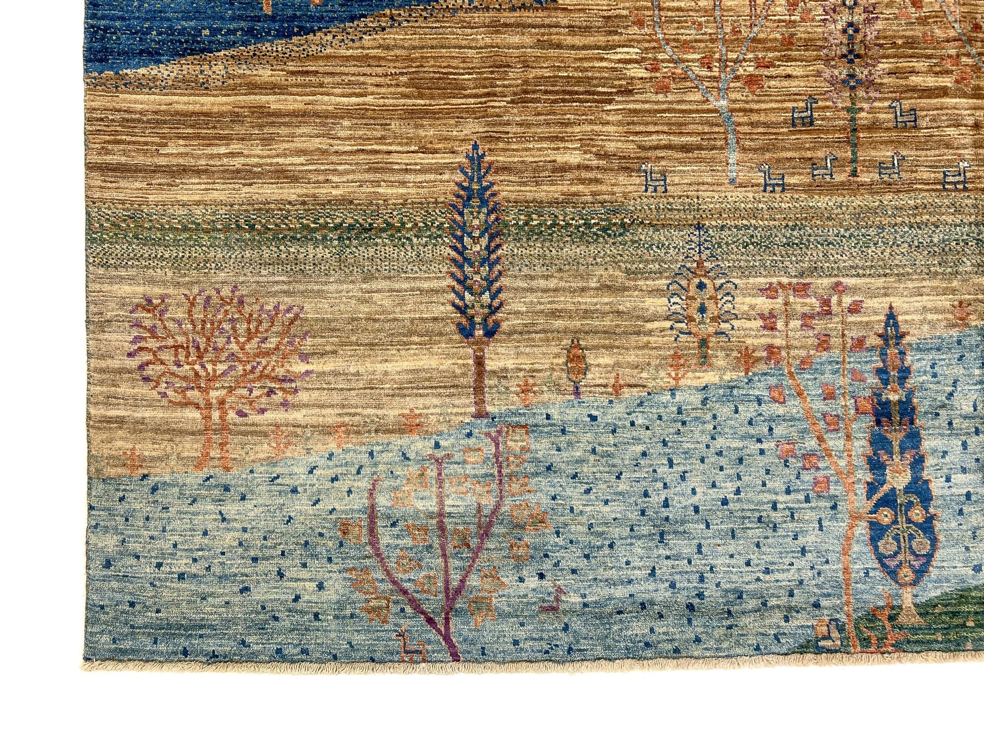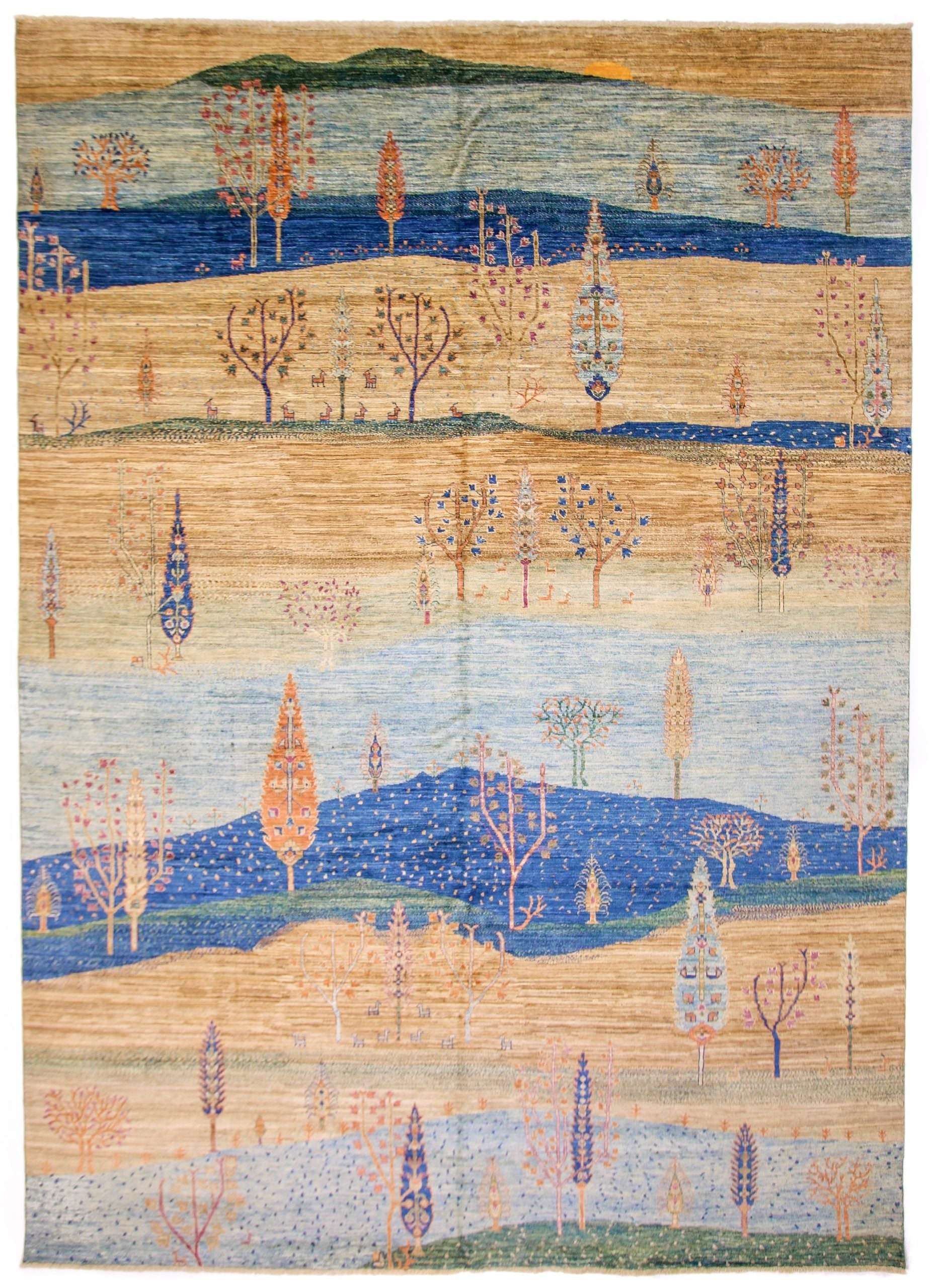 Scenic Gabbeh design featuring Cypress trees in a sunset landscape – hand-knotted of hand-spun, vegetable-dyed Ghazni wool in Afghanistan