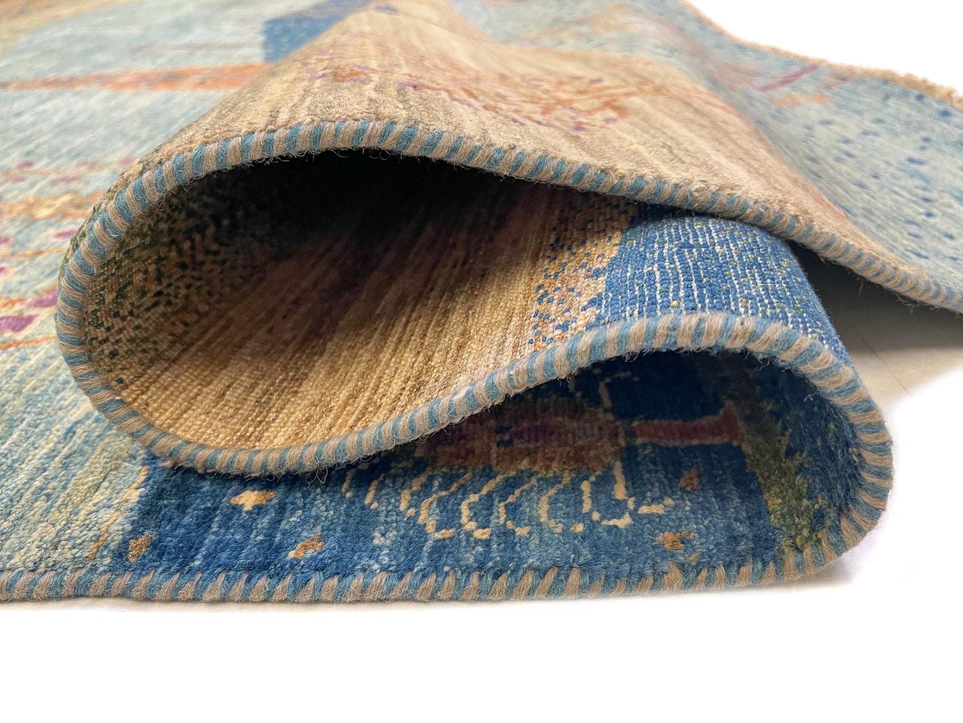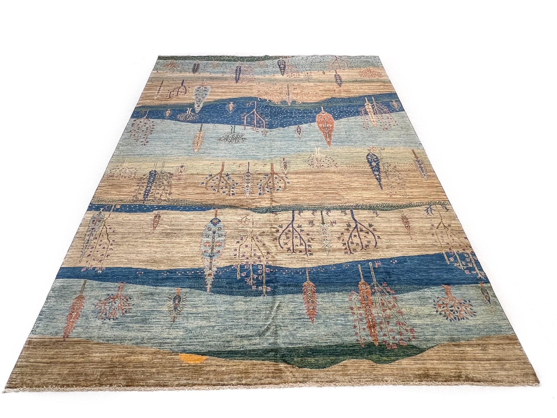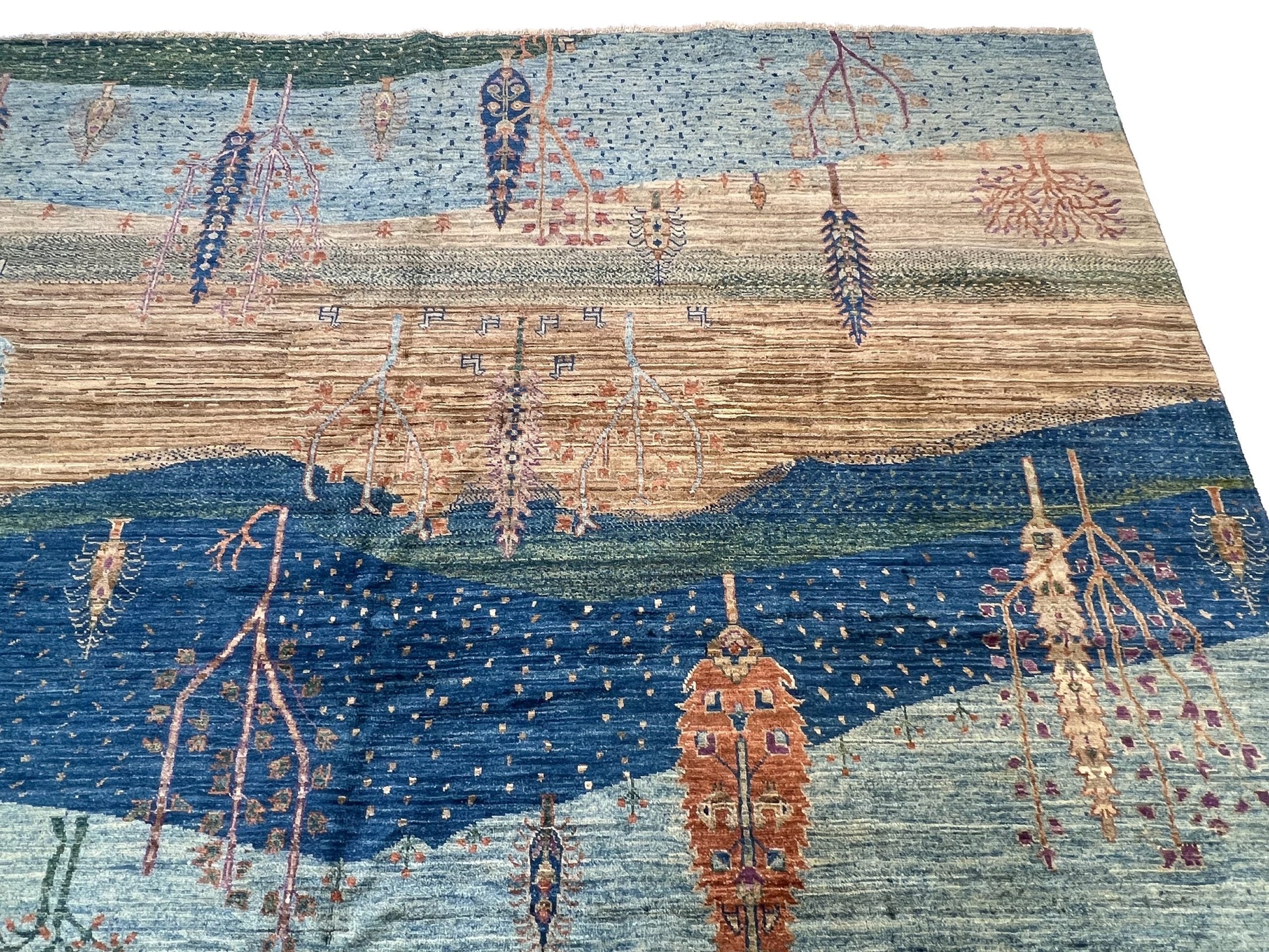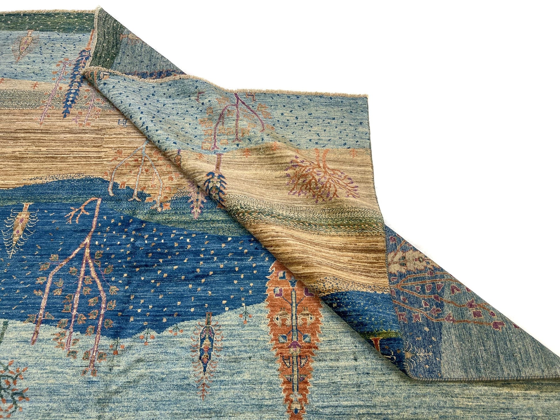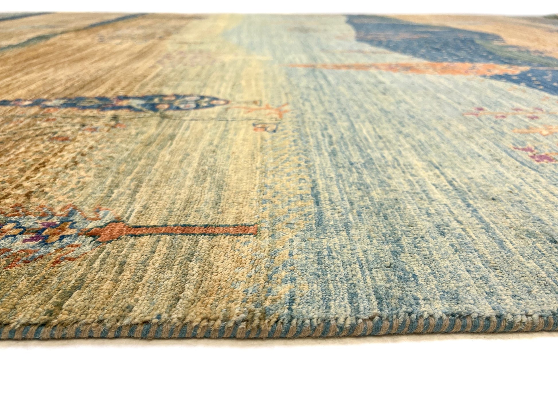 Scenic Gabbeh design featuring Cypress trees in a sunset landscape – hand-knotted of hand-spun, vegetable-dyed Ghazni wool in Afghanistan