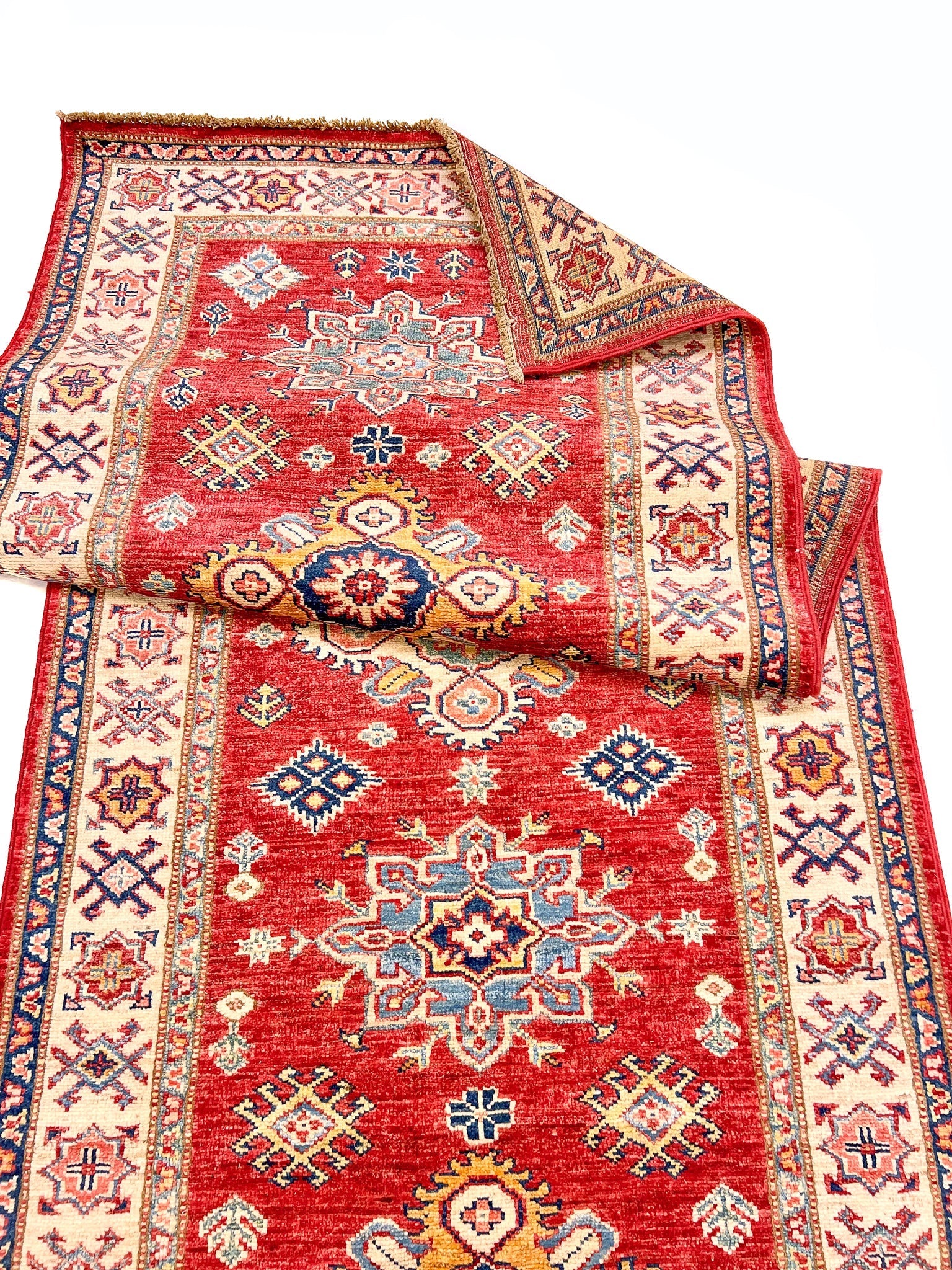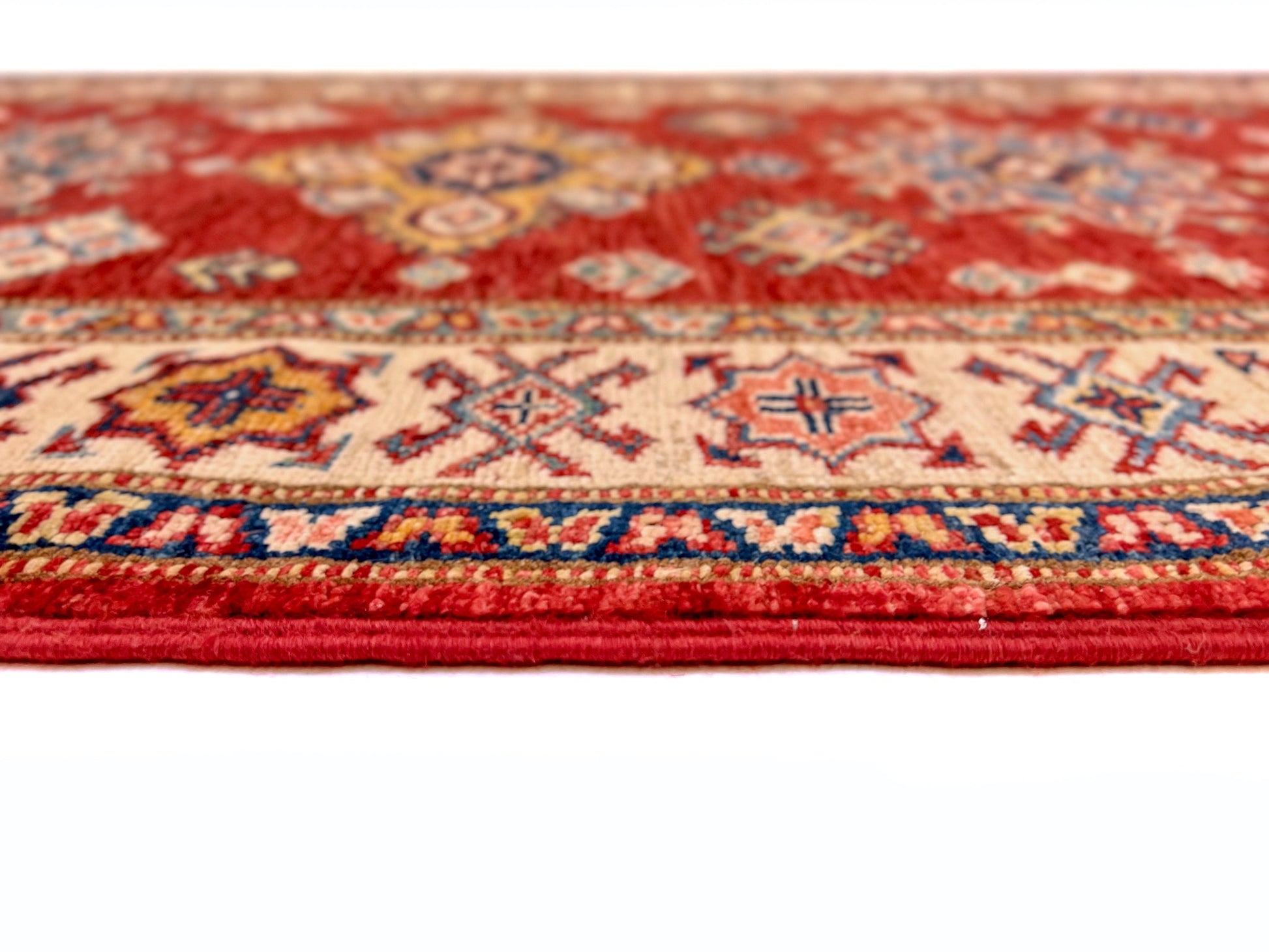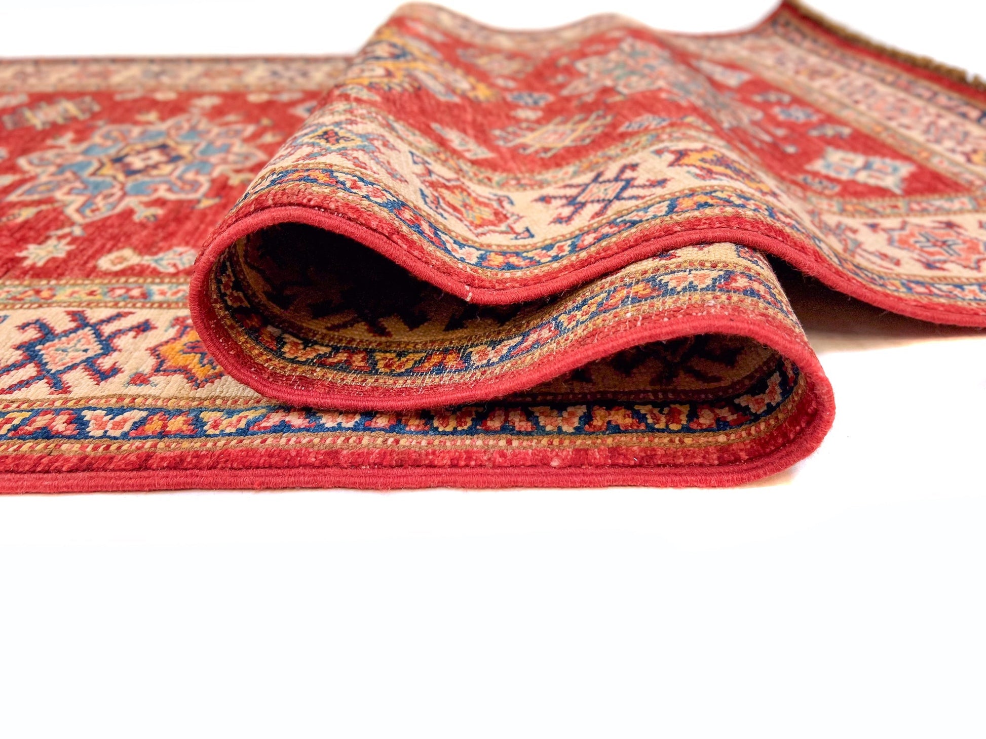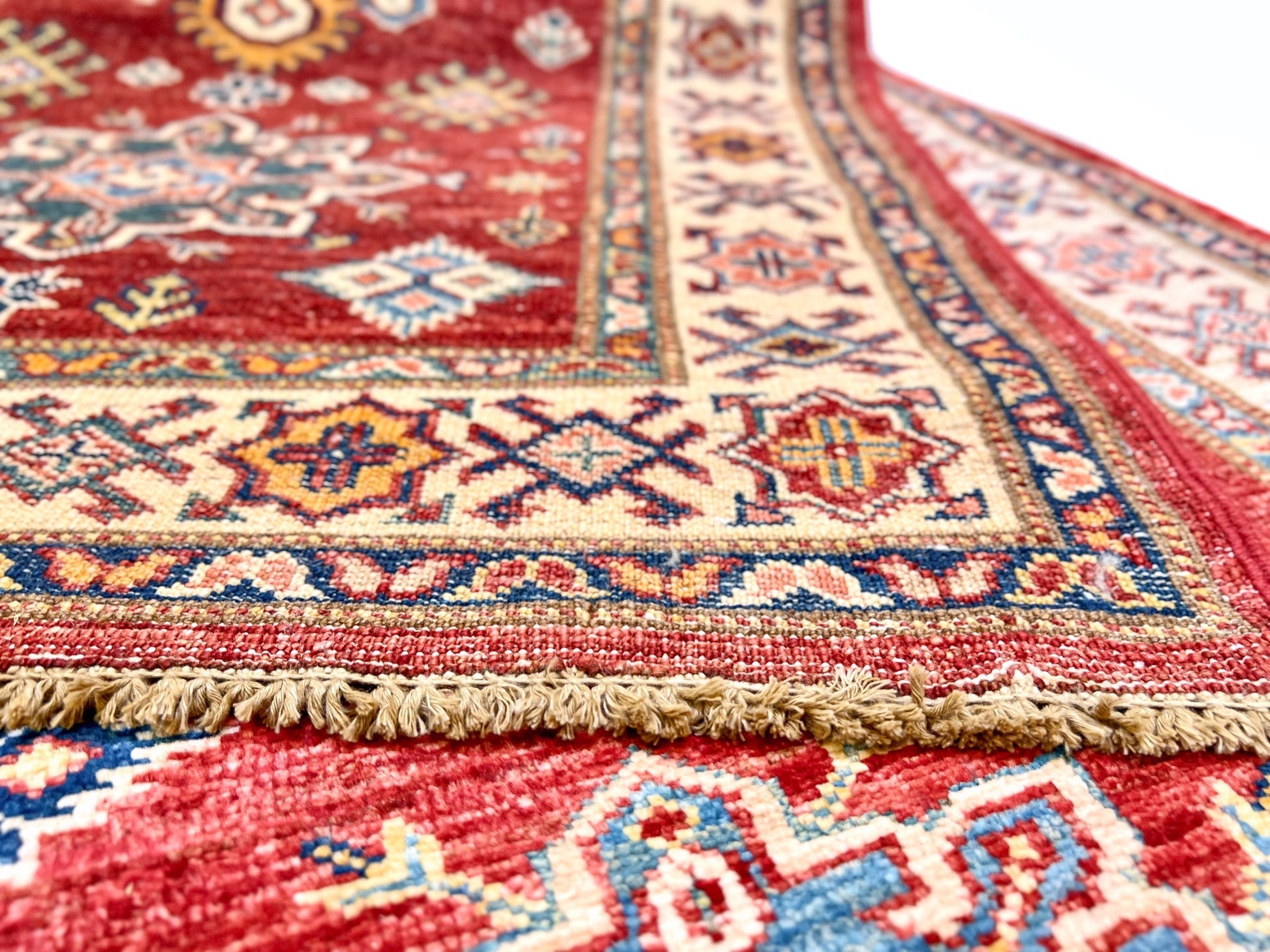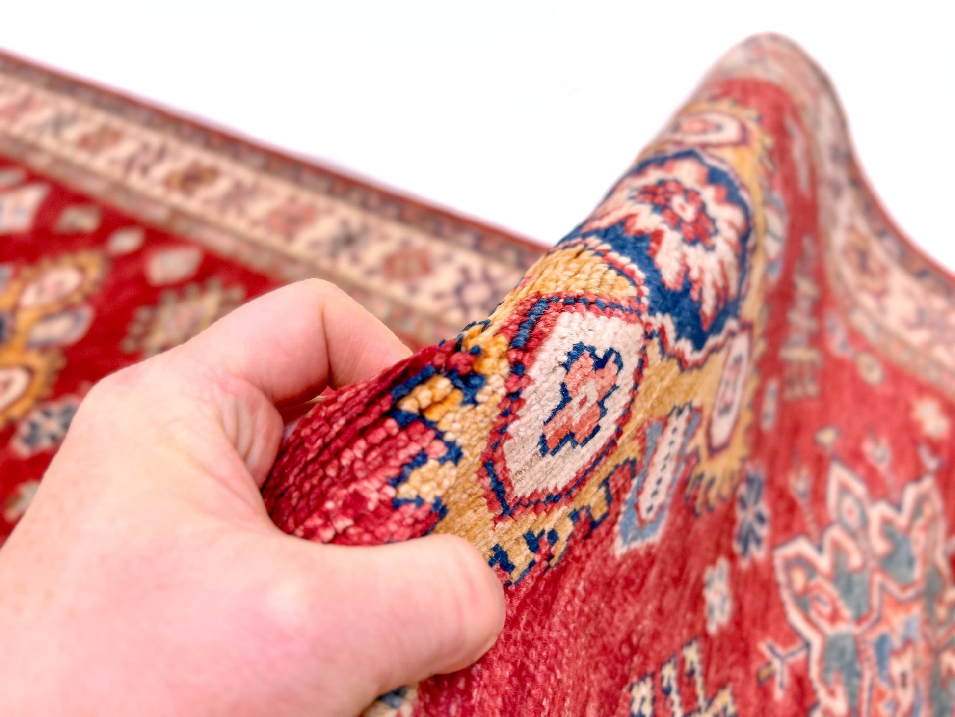 Super Kazak – hand-knotted of hand-spun, vegetable-dyed Ghazni wool in Afghanistan; exported from Pakistan