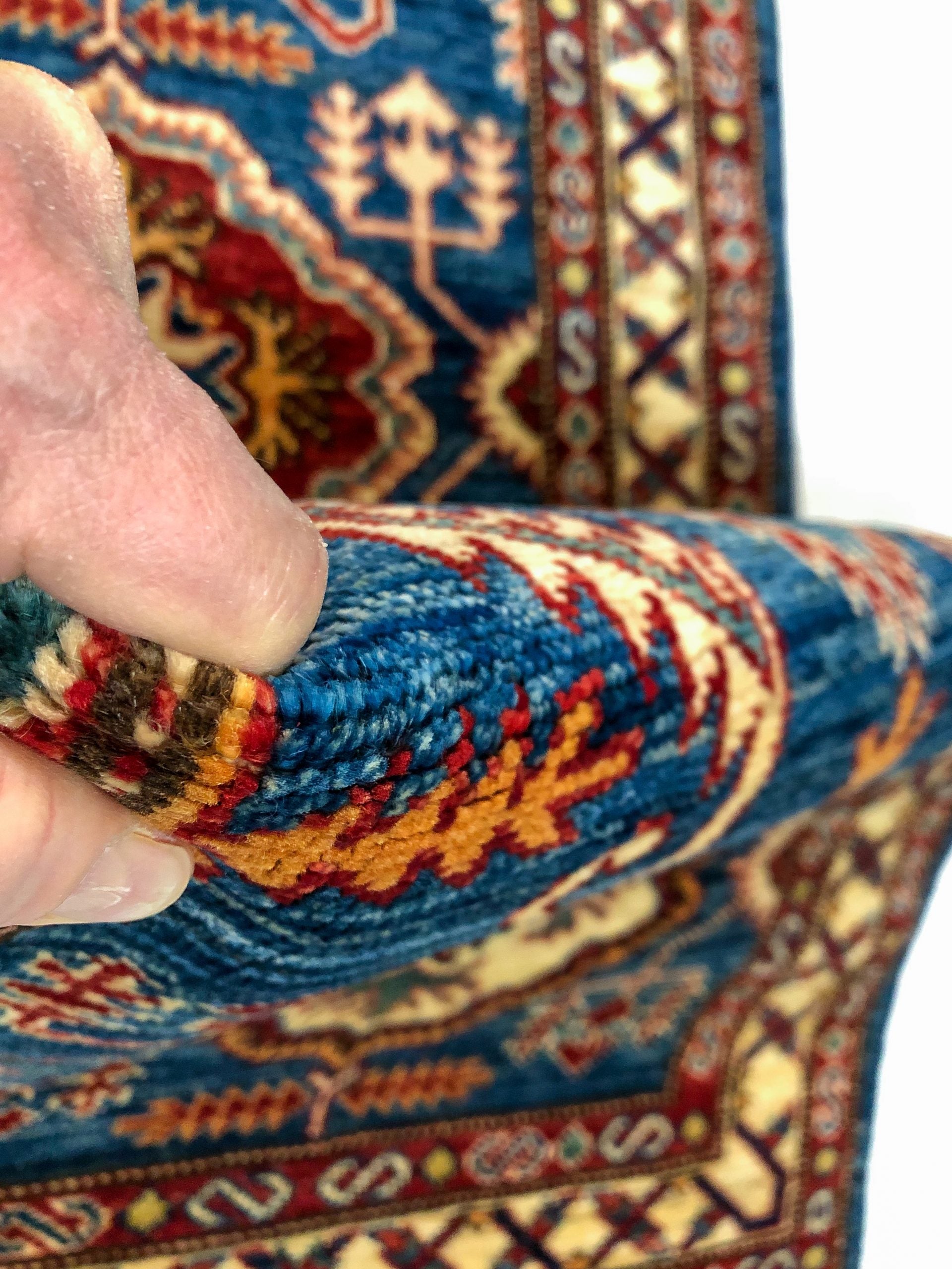Super Kazak – hand-knotted of hand-spun, vegetable-dyed Ghazni wool in Afghanistan; exported from Pakistan
