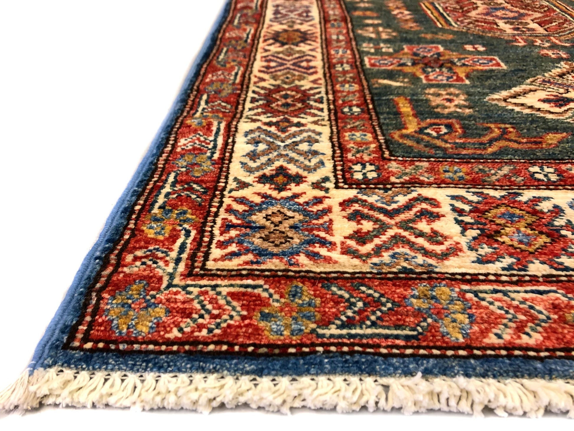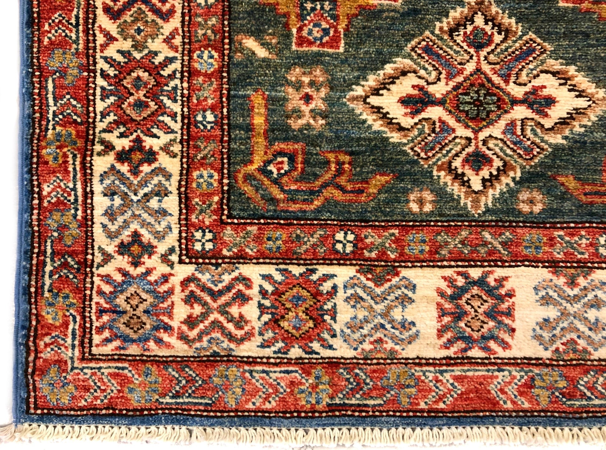 Green Kazak/Caucasian design with blue edge borders – hand-knotted of hand-spun, vegetable-dyed Ghazni wool in Afghanistan; exported from Pakistan