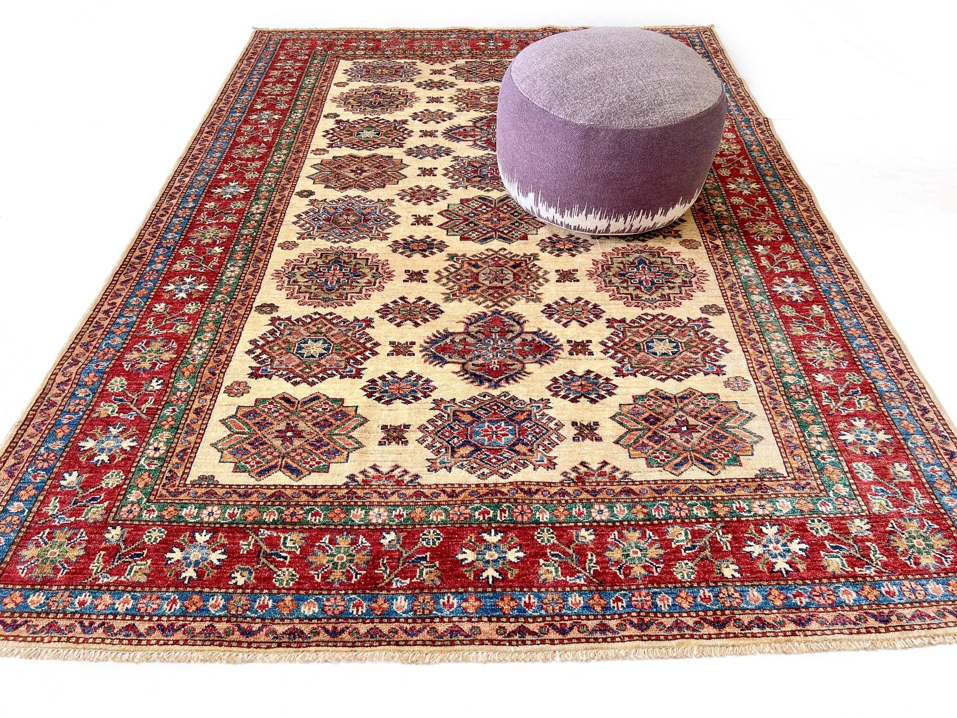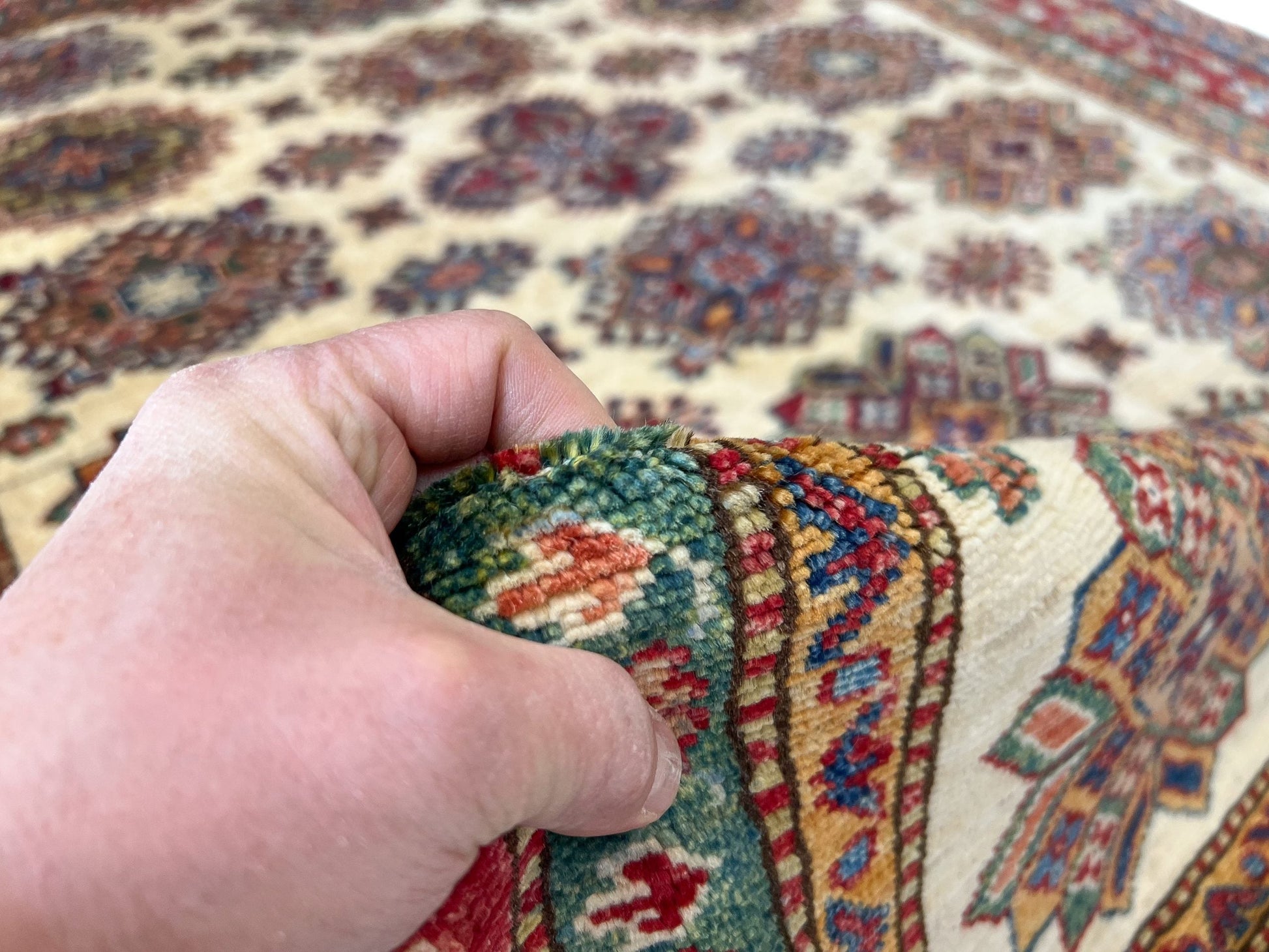 Super Kazak – hand-knotted of hand-spun, vegetable-dyed Ghazni wool; Afghanistan-made; exported from Pakistan
