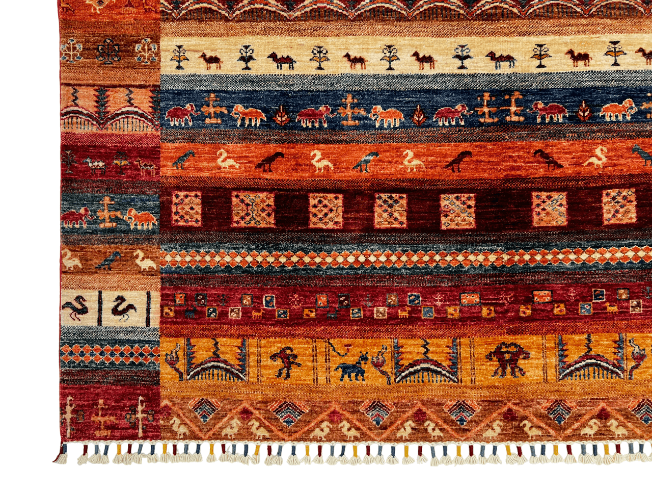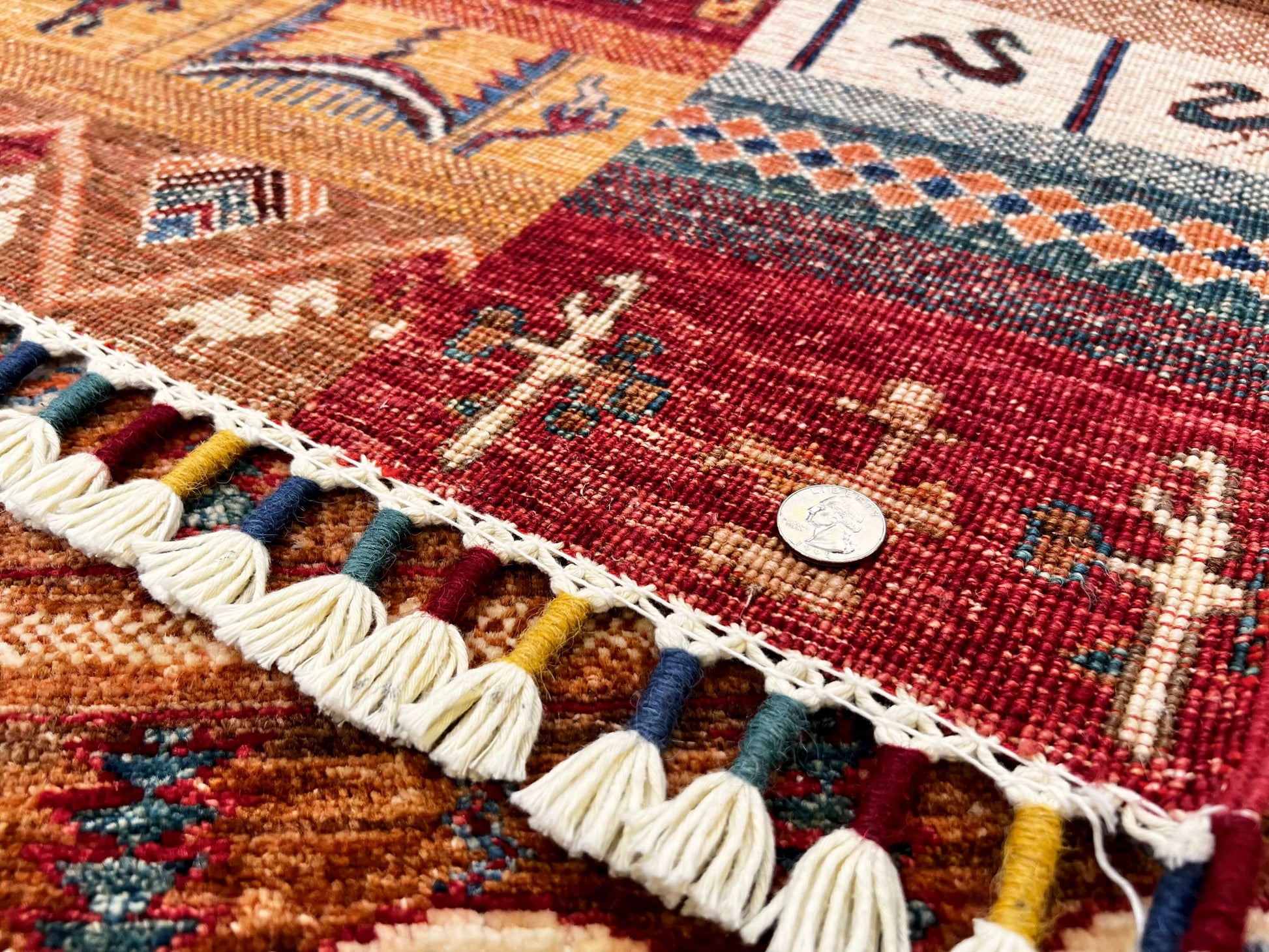 Discover the artistry of traditional Afghan craftsmanship with this stunning Gabbeh rug. Hand-spun from vegetable-dyed Ghazni wool, each piece showcases a modernized Persian design that bridges heritage and contemporary style. The generous square format and decorative tasseled fringe add character to any room, while the rich rust and multicolor palette brings warmth and depth to your space. Perfect for those who appreciate authentic, handmade rugs with a story to tell.