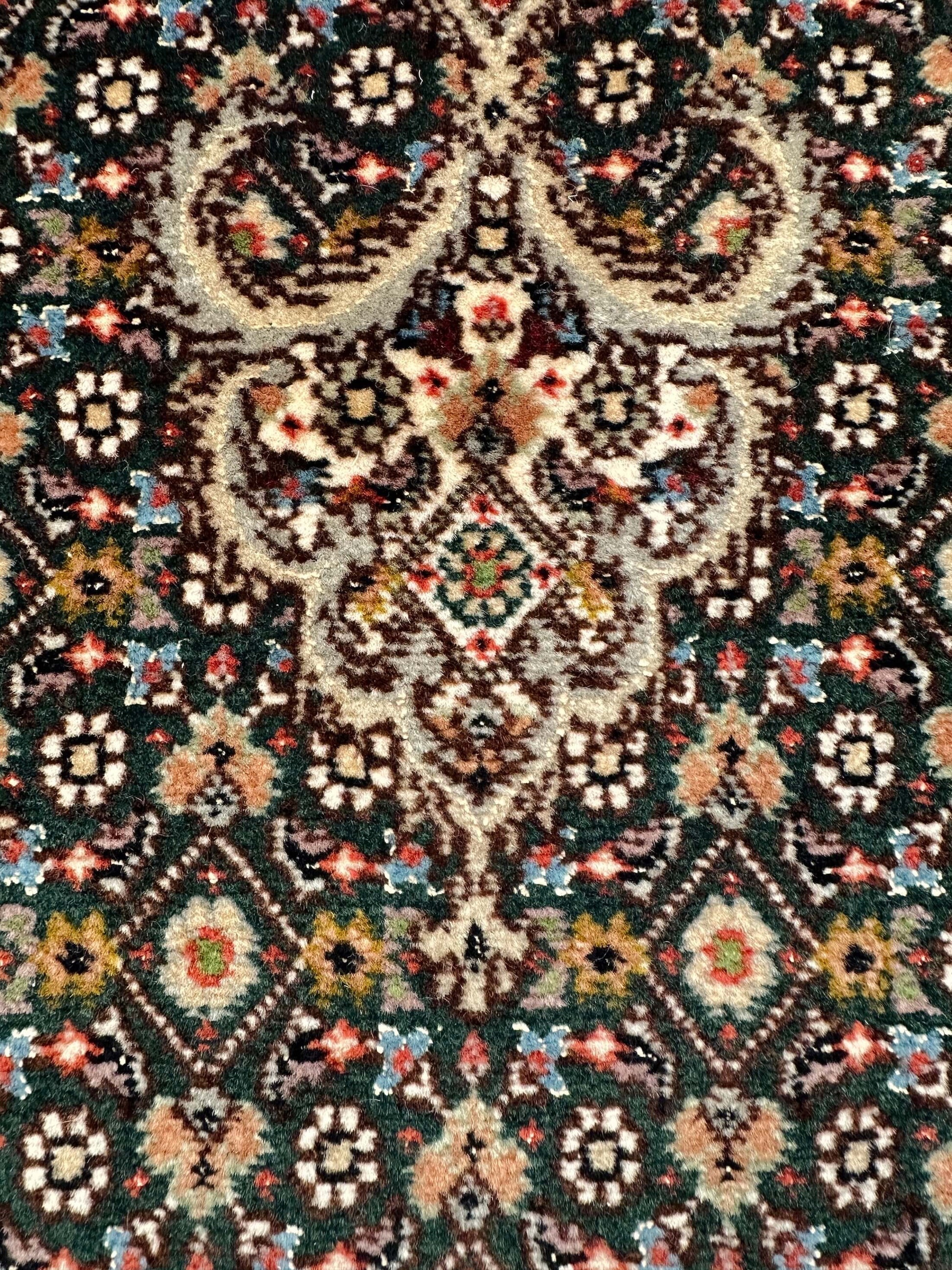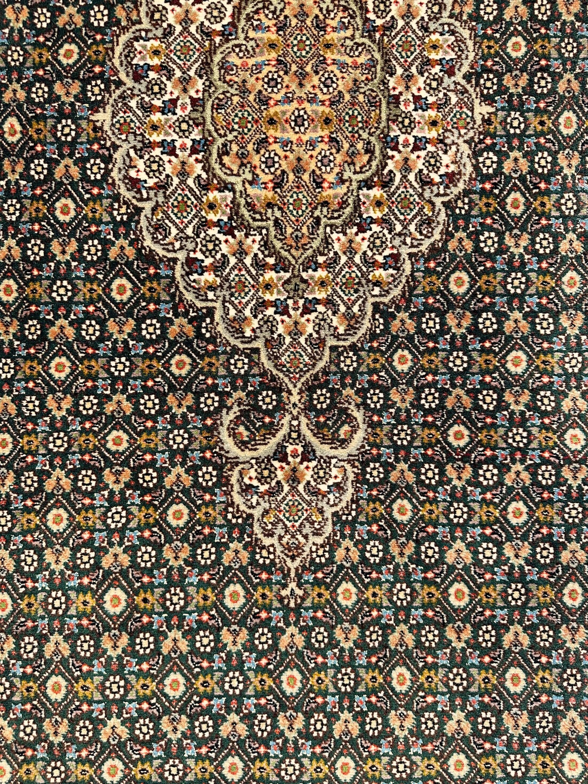 This distinguished runner features the coveted mahi medallion motif, a signature design element originating from Tabriz's renowned weaving tradition. Meticulously hand-knotted using a refined blend of wool and silk, the 13-foot length showcases exceptional craftsmanship with luminous fiber composition that enhances color depth and visual complexity. The deep green and ivory palette creates sophisticated contrast while maintaining versatility across design schemes. Silk accents elevate the piece with subtle sheen and refined detail work, particularly in the intricate medallion rendering. Ideal for hallways, galleries, or extended spaces, this runner represents enduring quality.