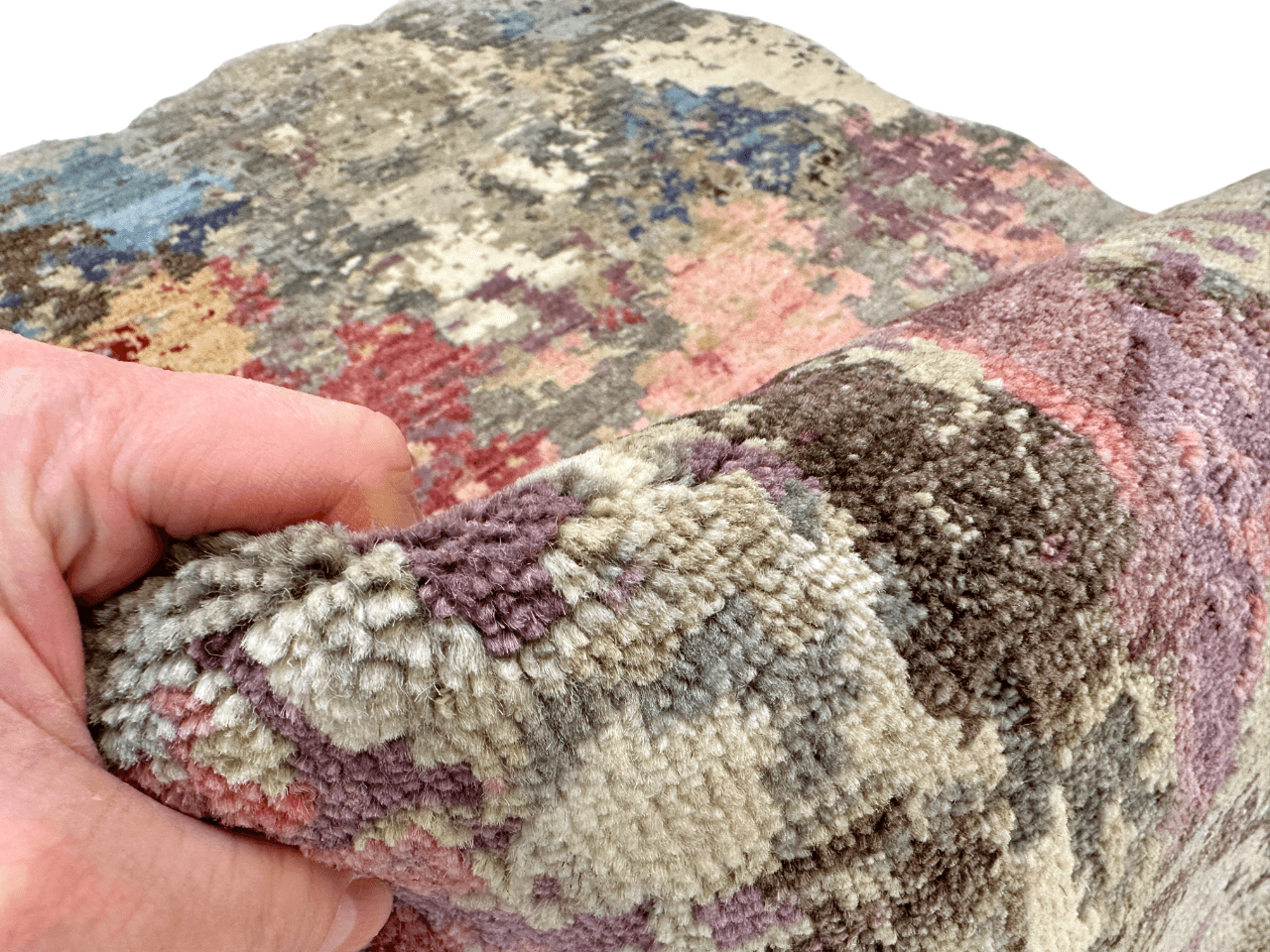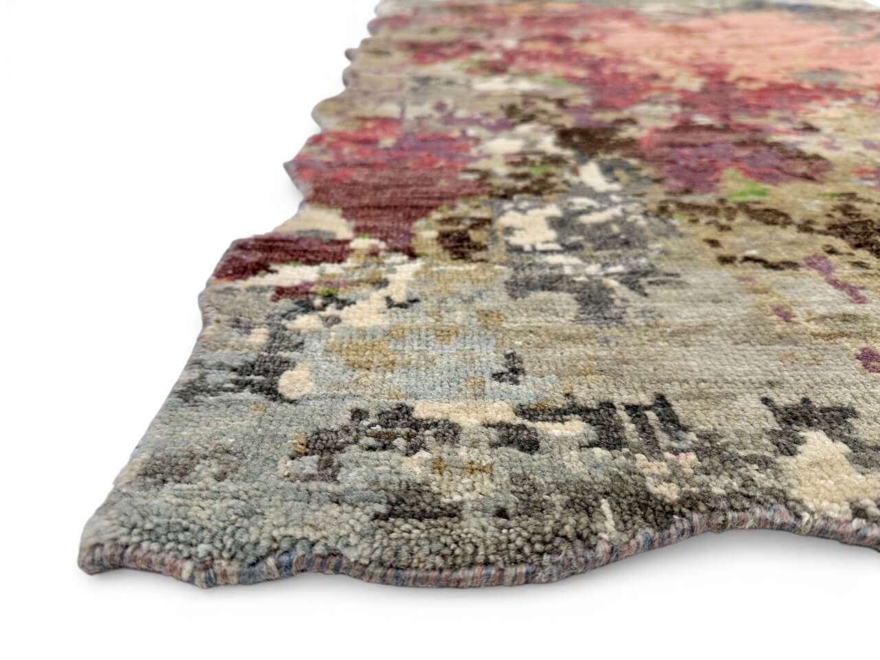 Hand-knotted wool and bamboo viscose blend with high-low texture and scalloped edges. Purple and multicolor tones suit various interiors. Durable, soft, and artfully crafted.