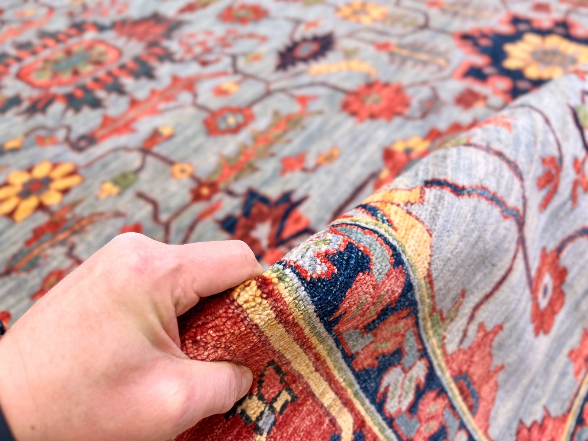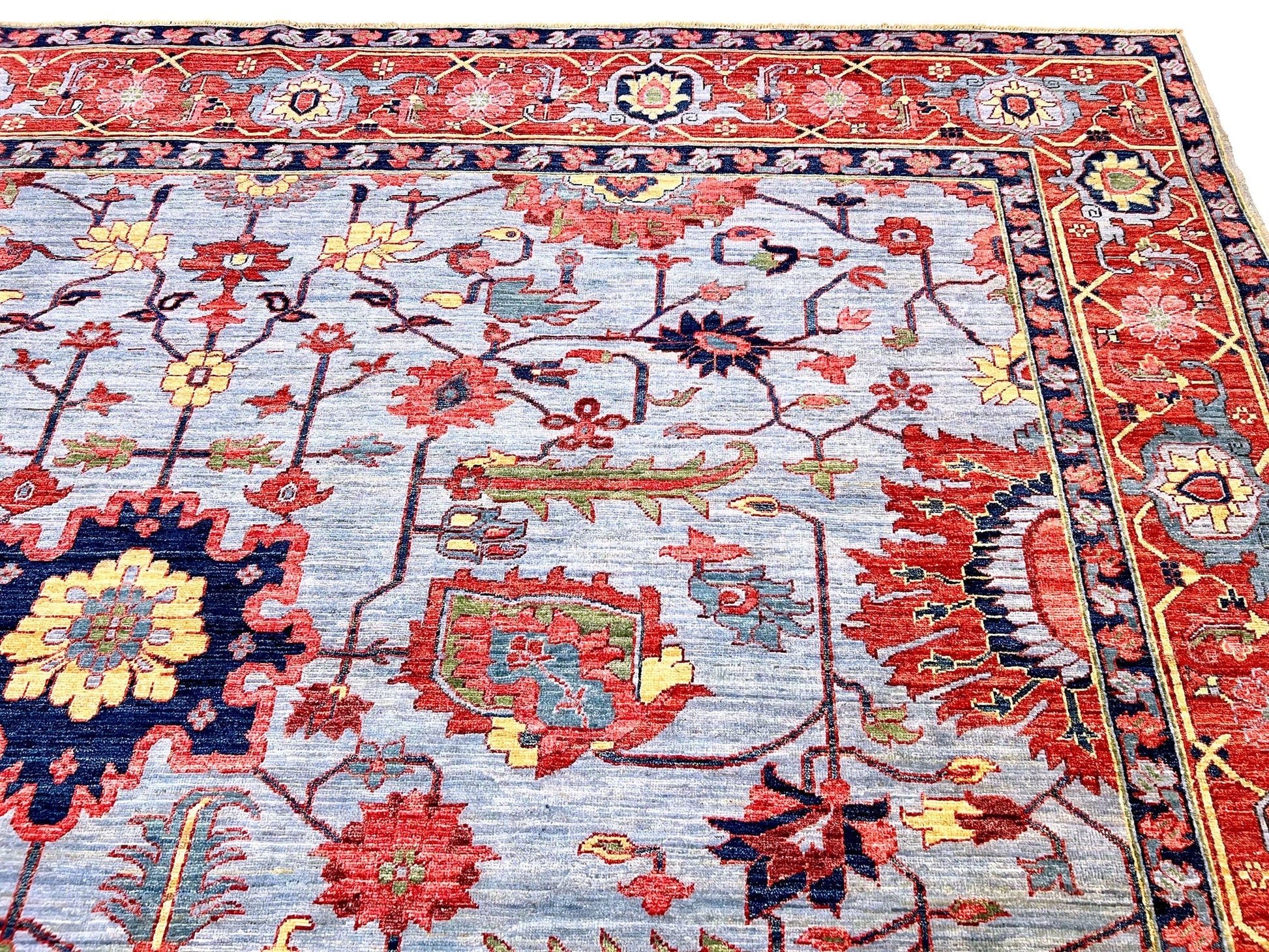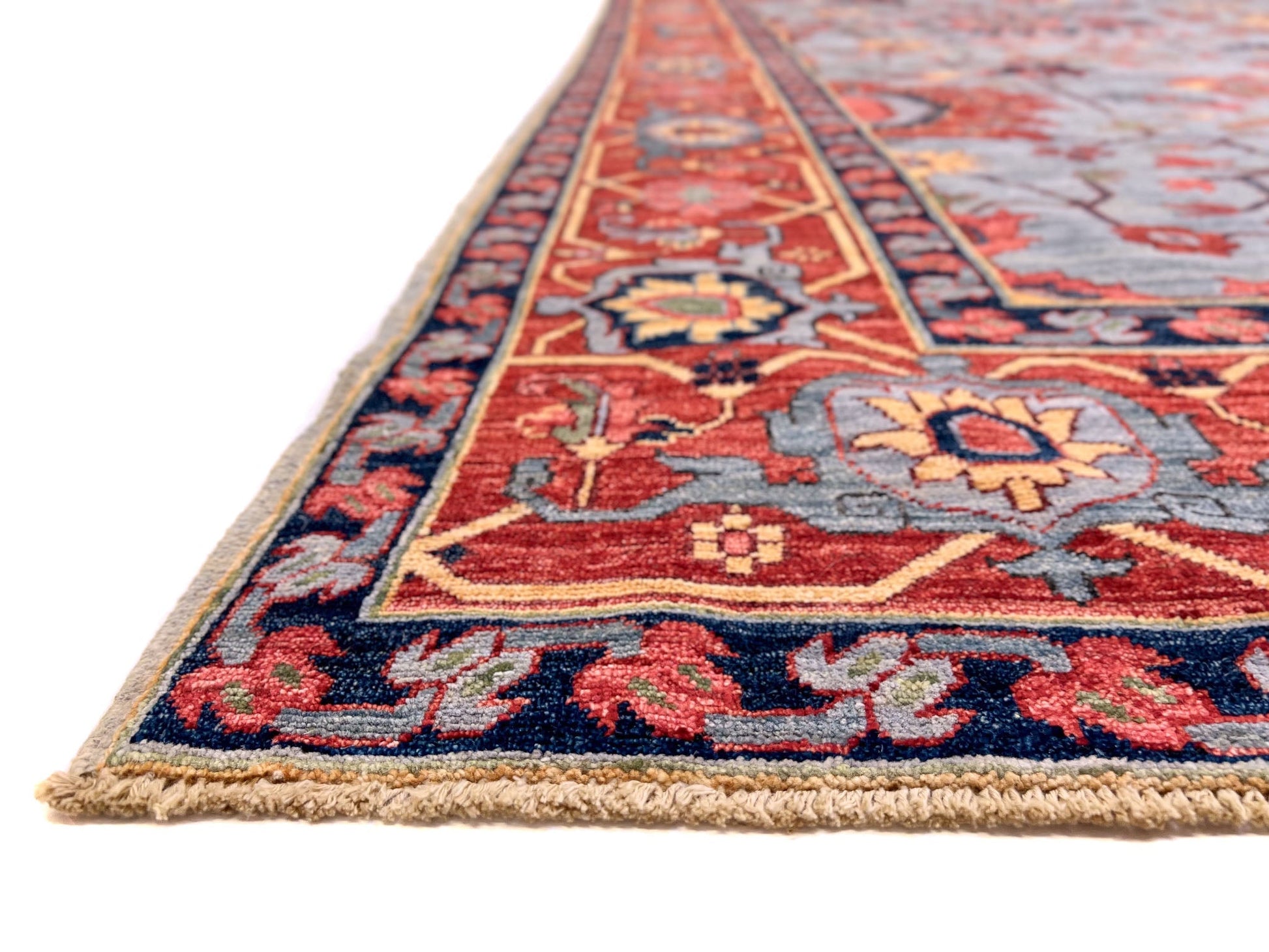 This hand-knotted Afghan Heriz represents a thoughtful contemporary interpretation of a storied Persian design tradition spanning generations. Crafted from hand-spun Ghazni wool dyed with natural vegetable pigments, each knot reflects authentic artisanal technique. The antique-wash finishing imparts the patina of time, creating depth and character throughout the light blue and red palette. At 10x14, this substantial piece commands presence while maintaining the geometric precision and balanced composition that define the Heriz aesthetic. A bridge between heritage craftsmanship and modern sensibility, it brings both historical resonance and contemporary sophistication to discerning interiors.