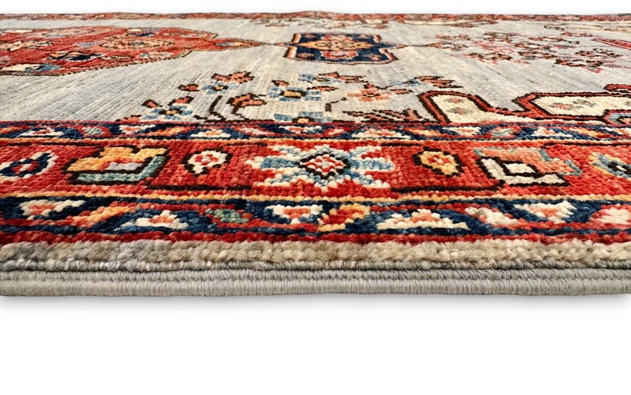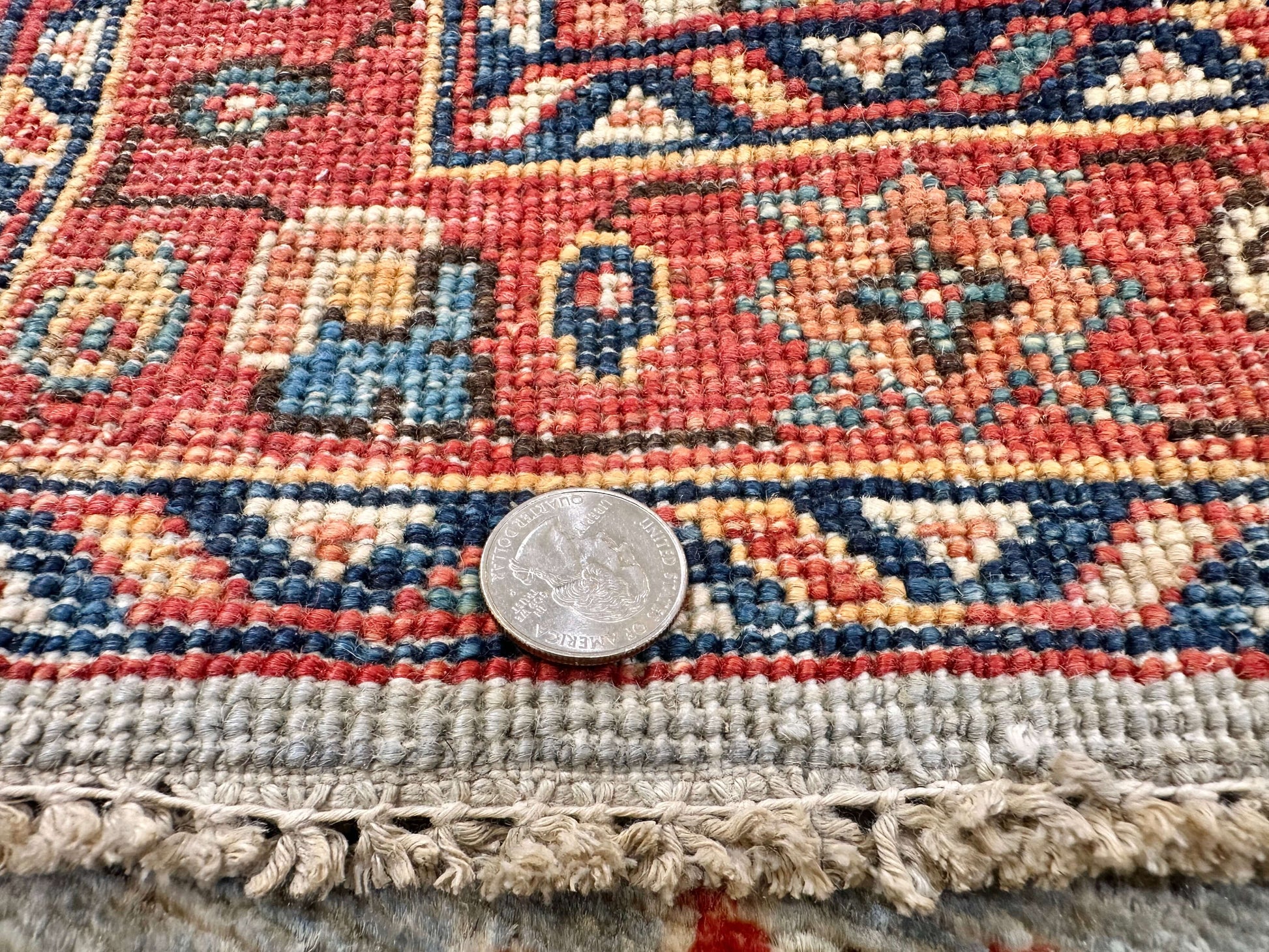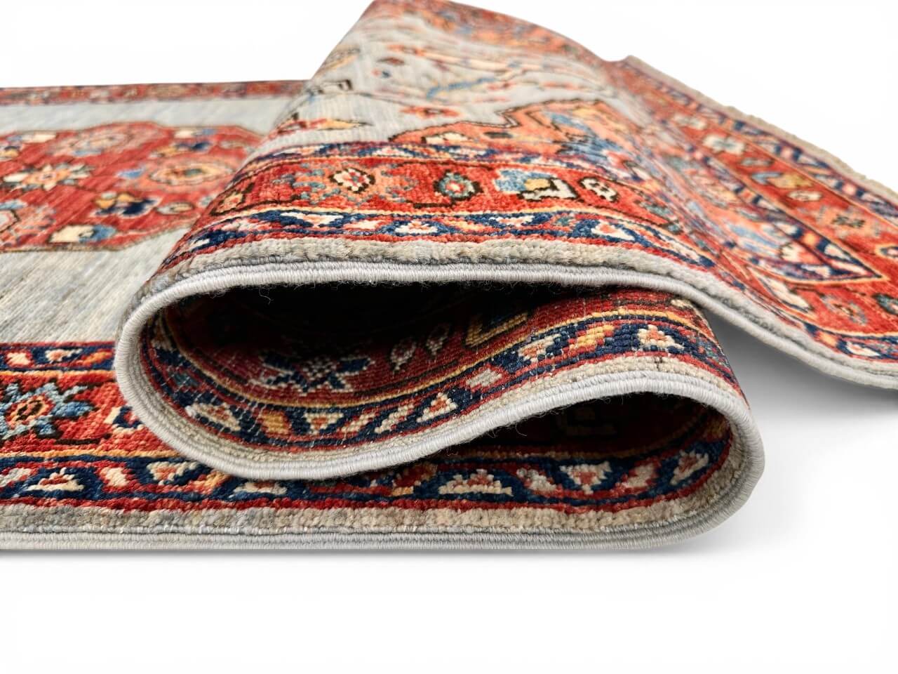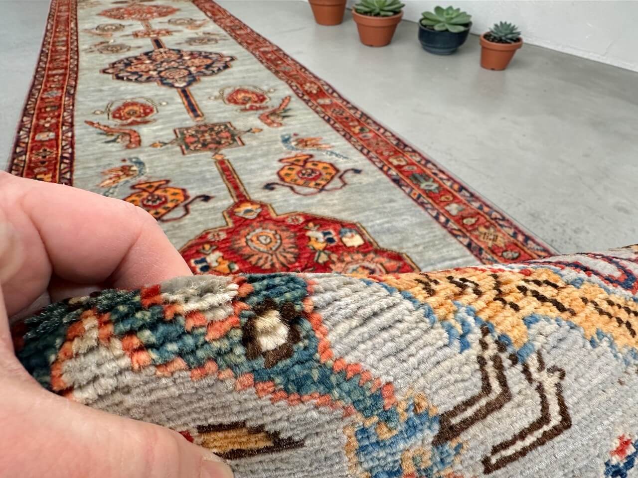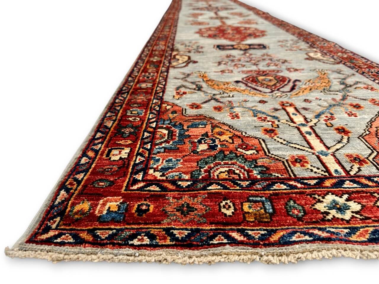 This exceptional Afghan runner showcases the time-honored craftsmanship of hand-spun, vegetable-dyed Ghazni wool, meticulously hand-knotted to capture the elegance of antique Serapi and Heriz designs. The light blue field provides a serene backdrop for intricate motifs—graceful birds of paradise and traditional vase designs—while bold multicolor geometric medallions command visual interest across its length. A striking rust-colored border frames the composition with warmth and definition. At nearly 13 feet long, this runner combines authentic artisanal techniques with timeless pattern heritage, making it an ideal statement piece for hallways, galleries, or living spaces seeking sophisticated, historically-inspired décor.