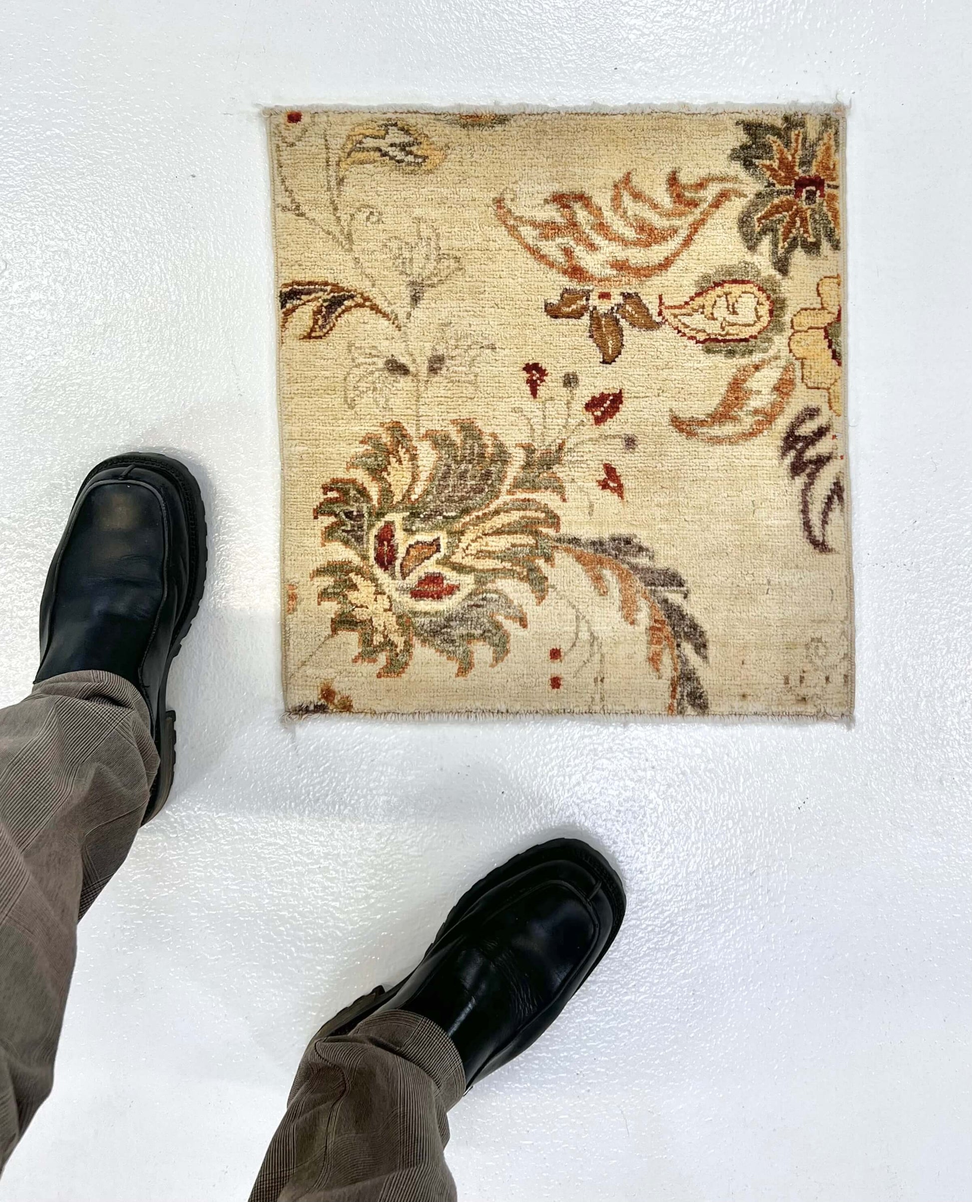 Meticulously hand-knotted in Pakistan, this 18" square ivory rug features vegetable-dyed wool with luxurious silk accents. The natural dyes create rich, enduring color while silk elements add subtle luminosity. Ideal beneath an elegant centerpiece on coffee tables, cocktail tables, dining tables, or atop dressers, this versatile textile brings artisanal craftsmanship to any sophisticated interior space