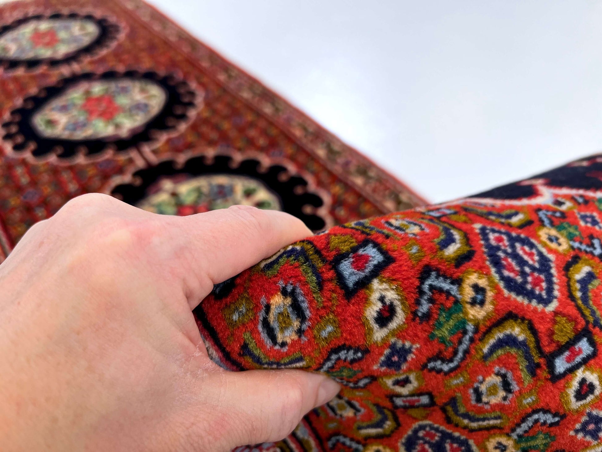 Authentic Persian Bijar runner featuring a striking rosy medallion design with traditional Herati motifs throughout. Hand-knotted in Iran using time-honored techniques, this 10-foot runner showcases rich red tones complemented by deep black and ivory accents. Bijar rugs are renowned for their exceptional durability and dense pile construction, making this piece both a sophisticated design statement and a practical investment for high-traffic areas. The intricate detailing and superior craftsmanship reflect generations of Persian weaving expertise.